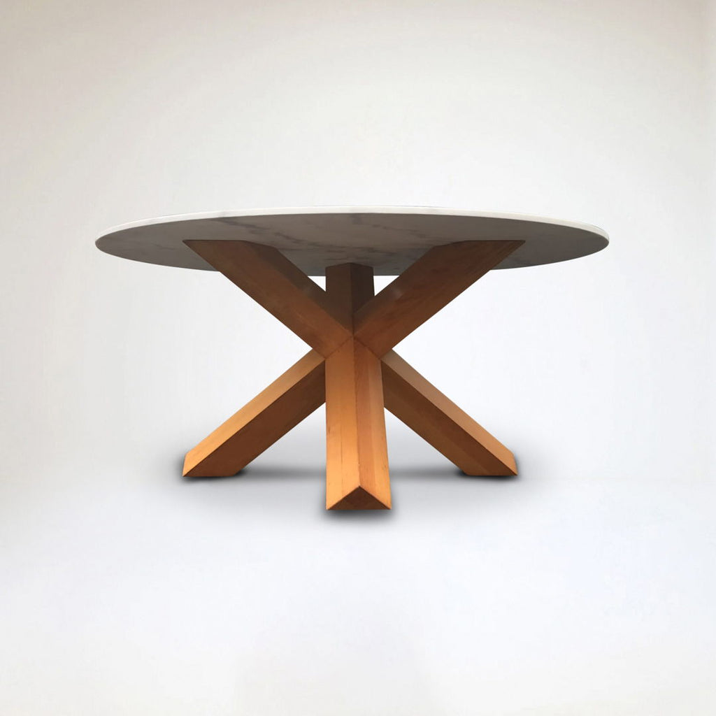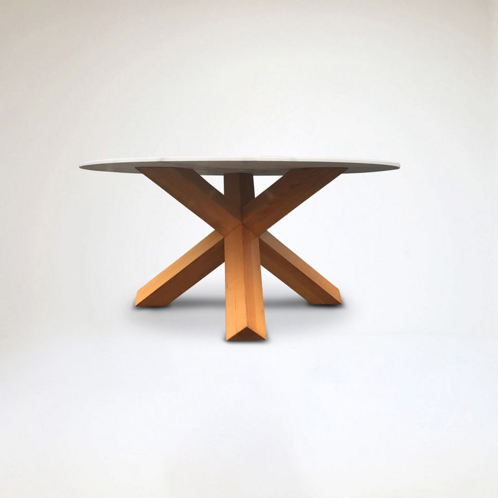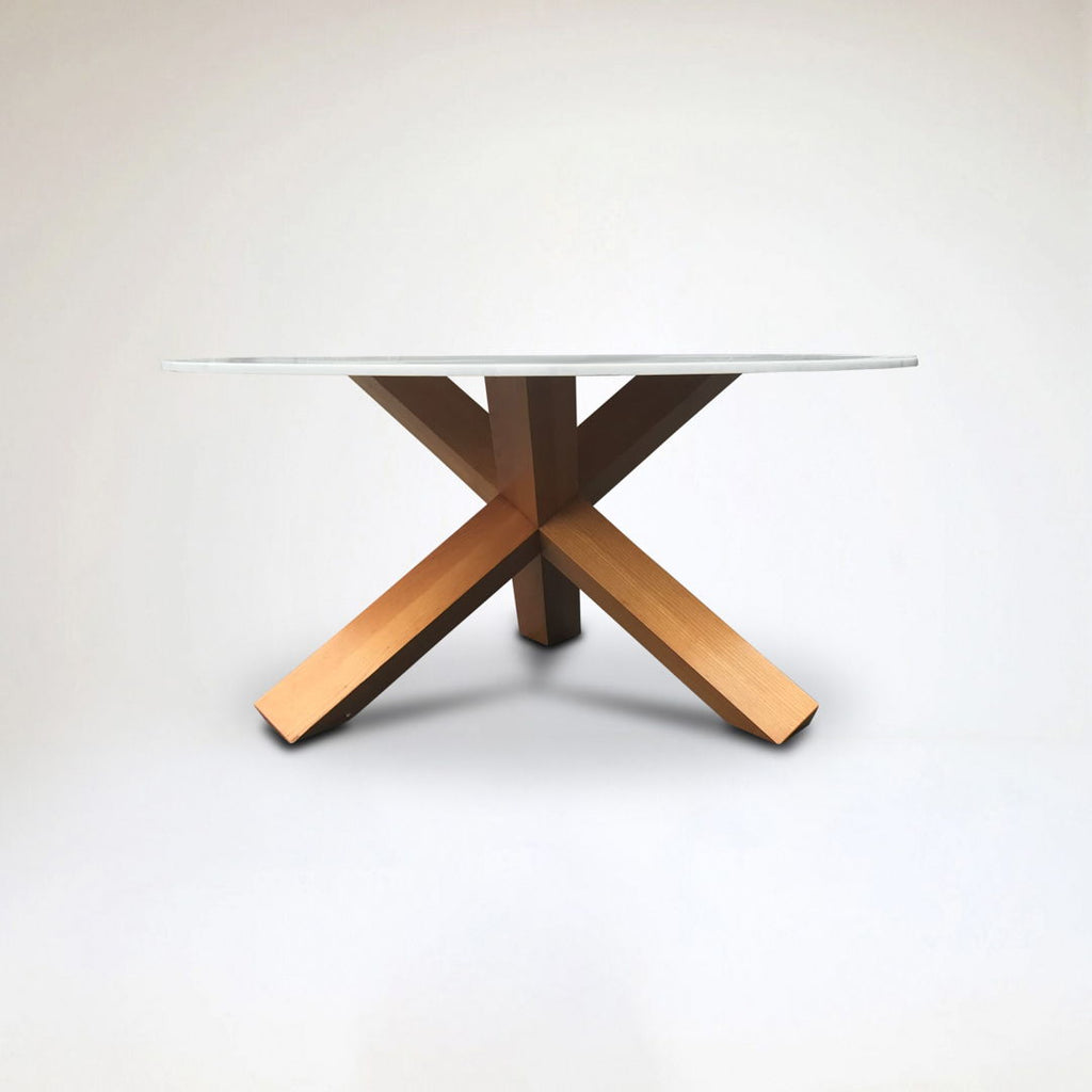 The La Rotonda table designed by Mario Bellini in 1976 has a simple sculpted base, a diagonal intersection of three legs with a square cross-section, which supports a 165 cm round table top, bound together by strong joints carved directly from the solid ash wood.