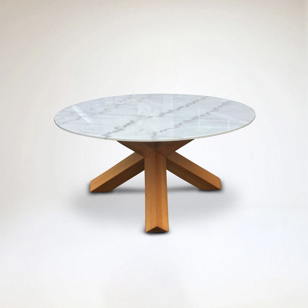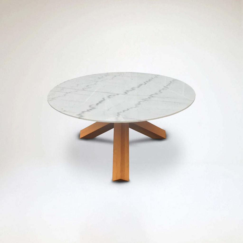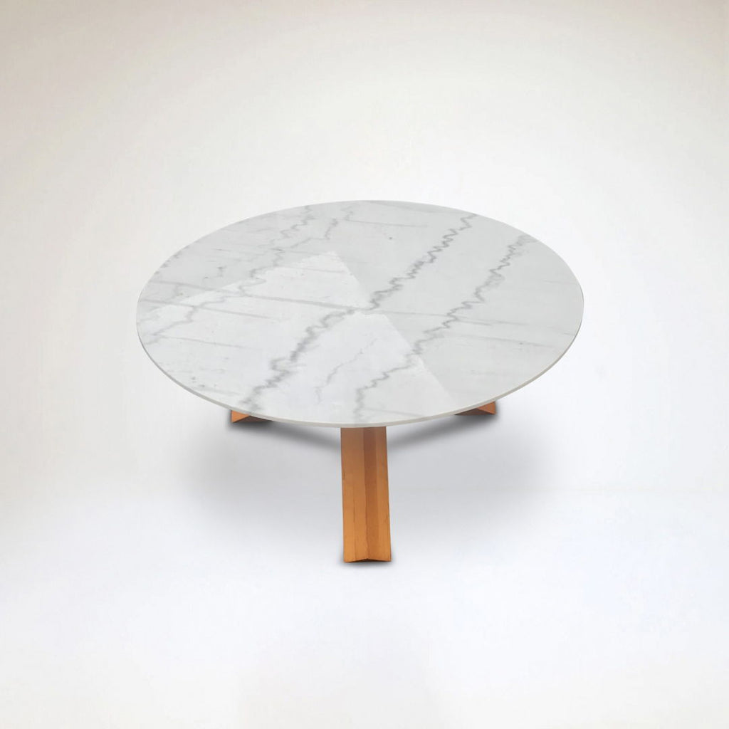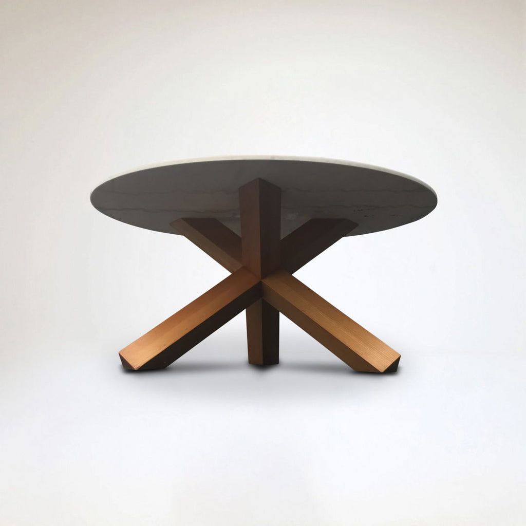 The La Rotonda table designed by Mario Bellini in 1976 has a simple sculpted base, a diagonal intersection of three legs with a square cross-section, which supports a 165 cm round table top, bound together by strong joints carved directly from the solid ash wood.