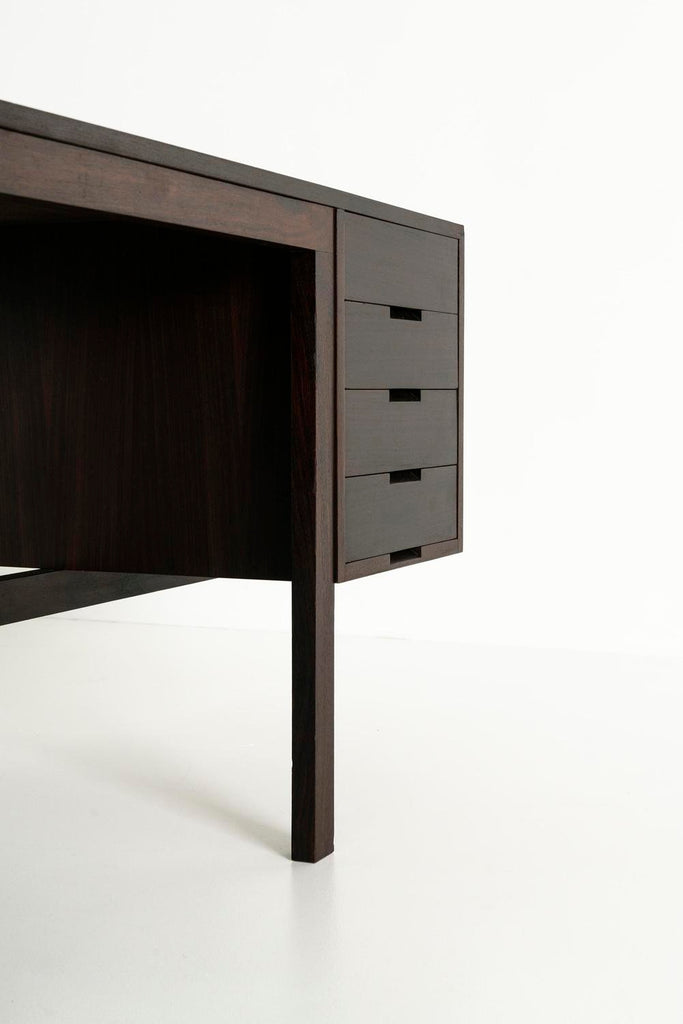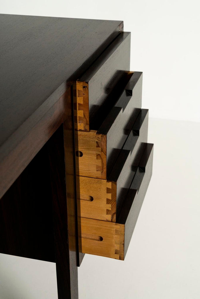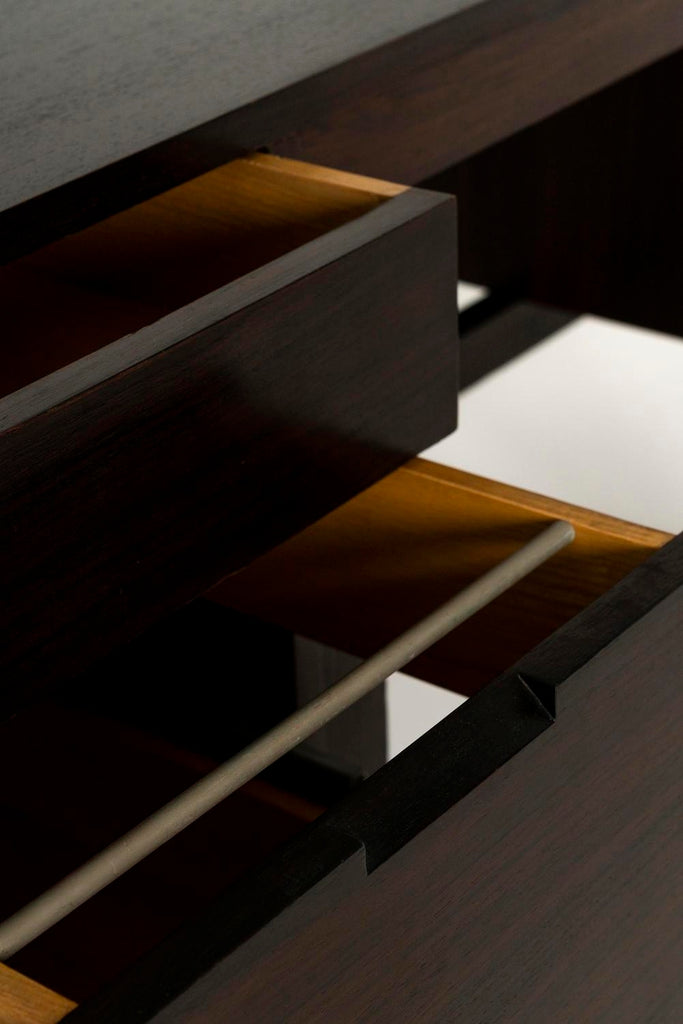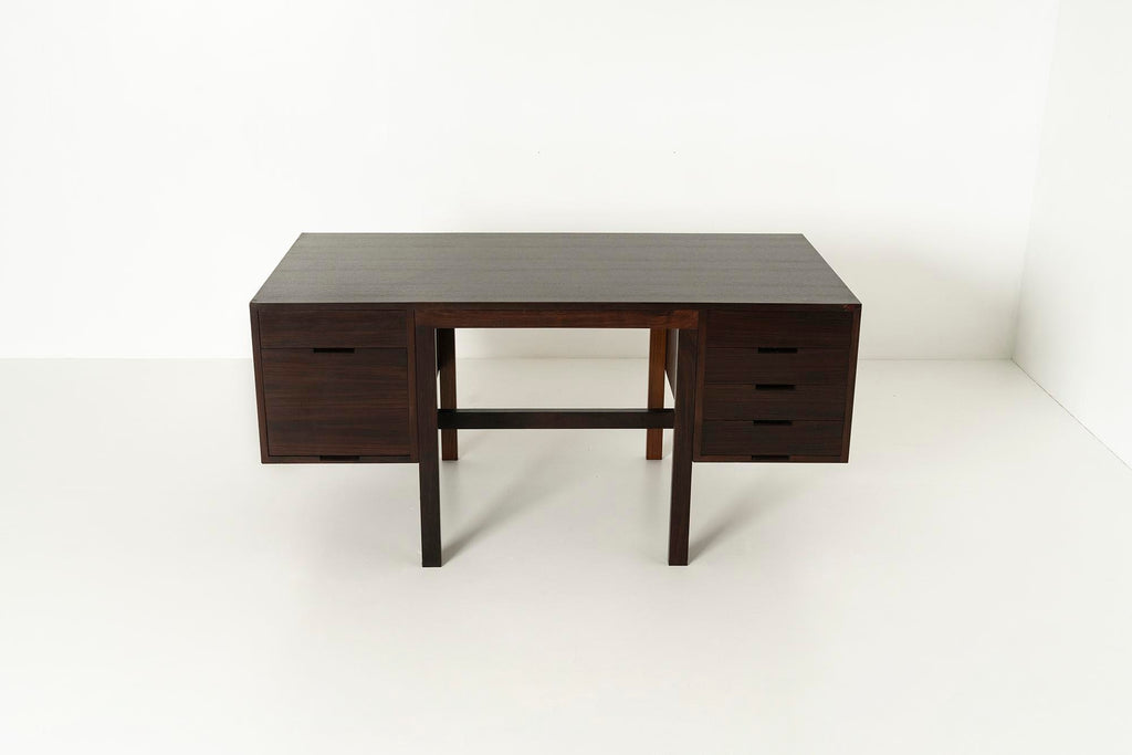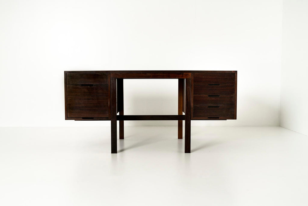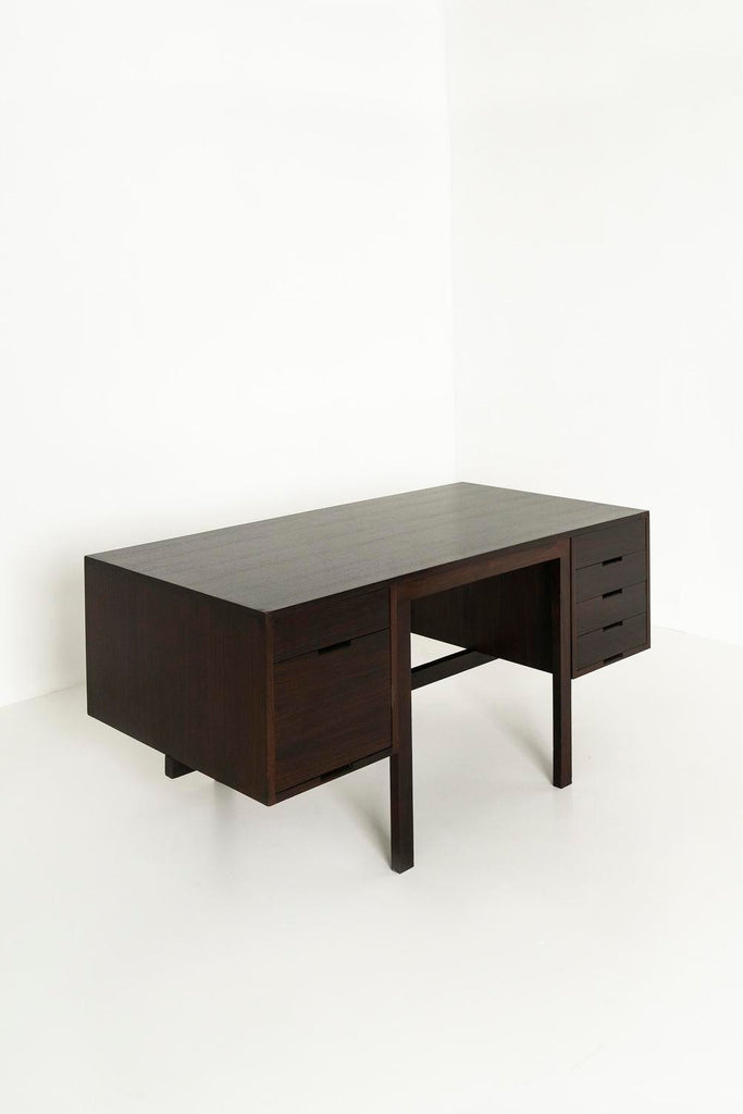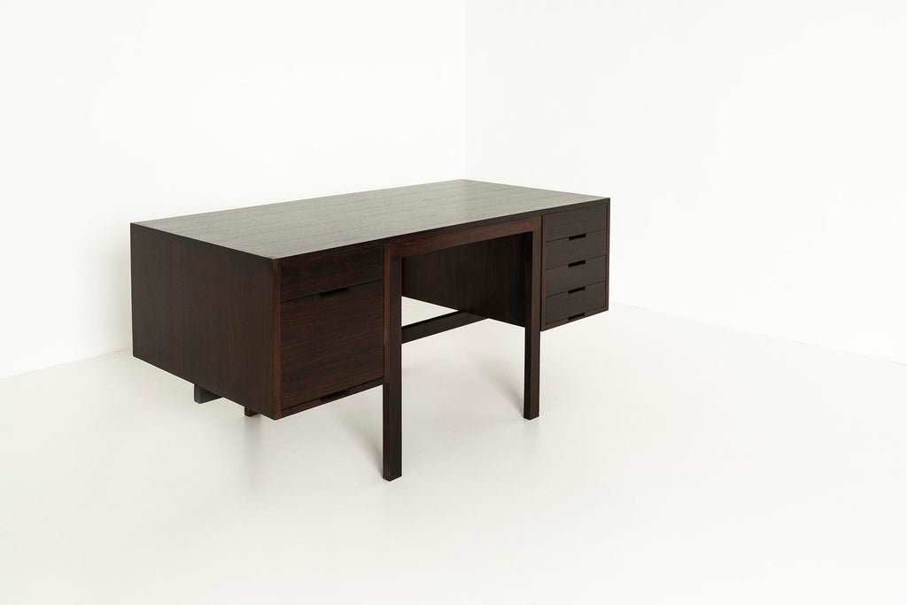 Gavina를 위한 Marcel Breuer의 흥미로운 모더니스트 데스크 모델 'Canaan'. 이 책상은 물론 Breuer의 Bauhaus 영향을 볼 수 있는 아름다운 모더니스트 디자인 작품입니다. 우리는 또한 이 흥미로운 책상에서 구성주의의 특징을 봅니다. 예를 들어, 책상의 전체 길이에 걸쳐 있는 지지대가 양쪽의 수납 공간을 지지하고 있음을 명확하게 나타냅니다. 이 크로스바는 또한 이 Canaan 책상의 사용자에게 발을 올려놓을 수 있는 인체공학적 이점을 제공합니다. 겉보기에 미니멀한 디자인은 Breuer가 Bauhaus 격언인 형태를 따른다는 것에서 출발했음을 보여줍니다. 그는 오브제의 에너지와 역동성에서 출발하려는 유혹이 아니라 무엇보다 책상 그 자체의 정체성과 논리가 우세하도록 했다. 형태가 실제로 기능을 따르는 방식에 대한 가능한 해석입니다. 직선, 짙은 색의 나무, 가운데의 개구부는 서로 훌륭하게 연결되어 있습니다. 아무것도 튀어나오지 않고 서랍의 손잡이는 나무에서 잘립니다. 베니어판의 밝은 색조는 전체적으로 어둠 속에서 빛나는 베니어판이 지배하는 신비로운 분위기를 연출합니다. 이 책상은 초현대적인 인테리어에 어울리지 않을 뿐만 아니라 더 둥근 모양과 물체가 포함된 더 균형 잡힌 인테리어에도 쉽게 적응할 것입니다. 상태도 좋은 매우 특별한 아이템입니다. 베니어에는 한 지점과 단일 칩에 가벼운 표면 긁힘이 있습니다.