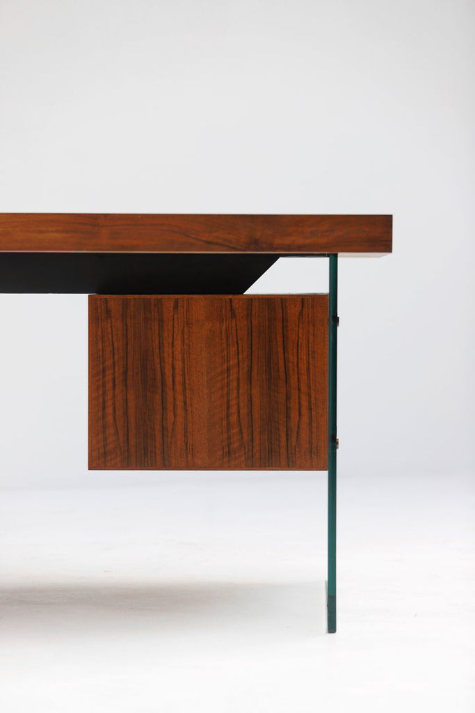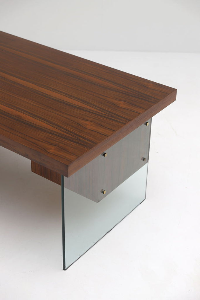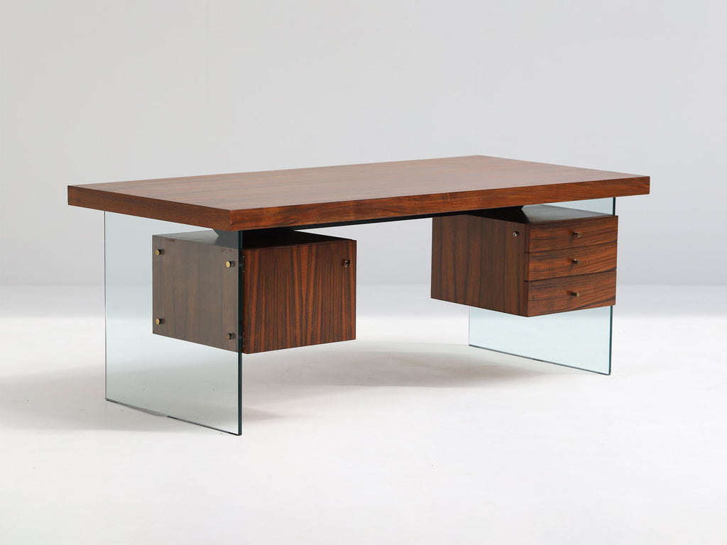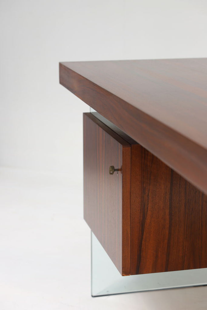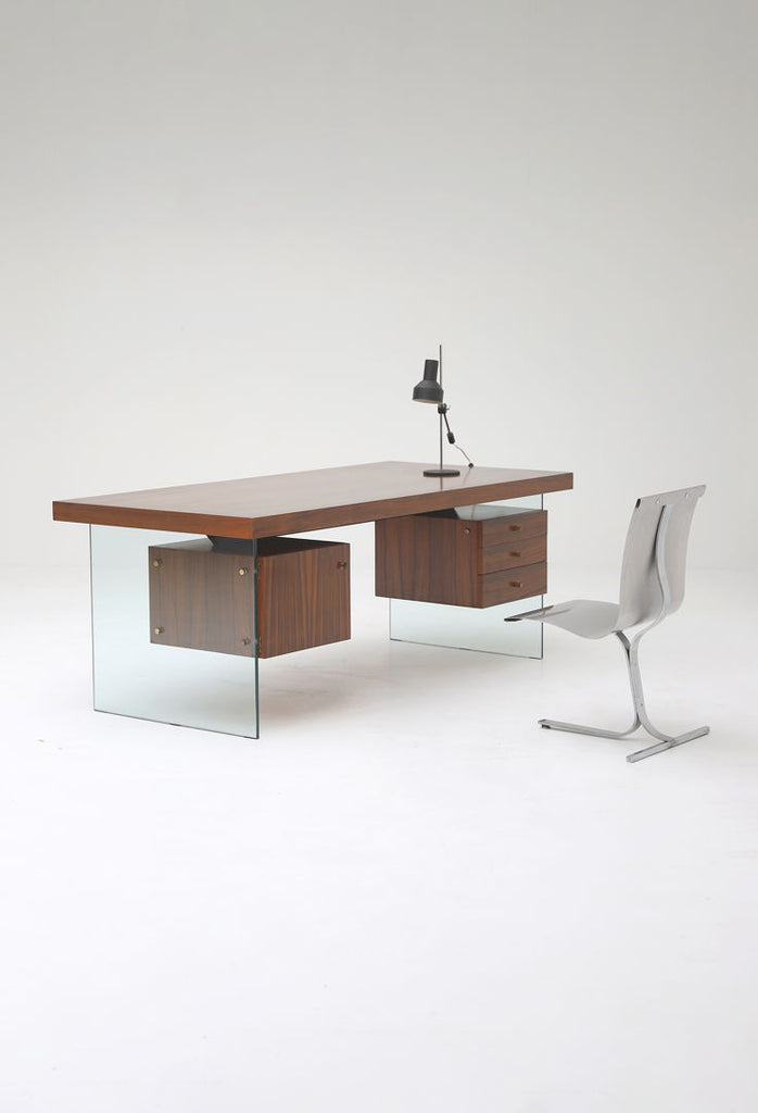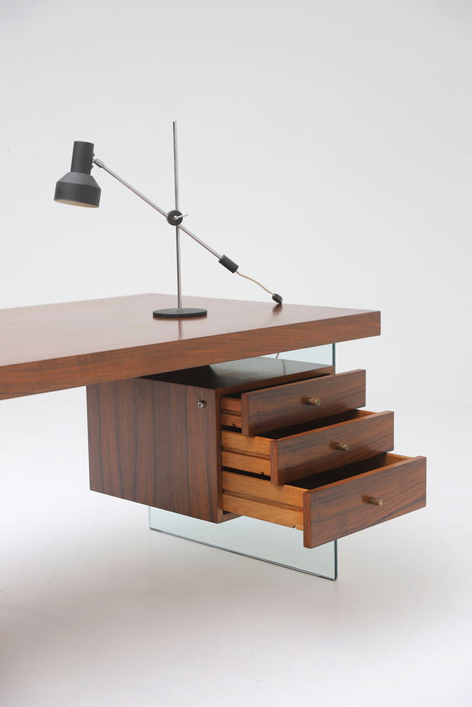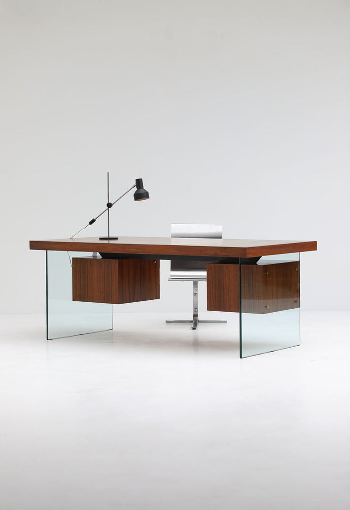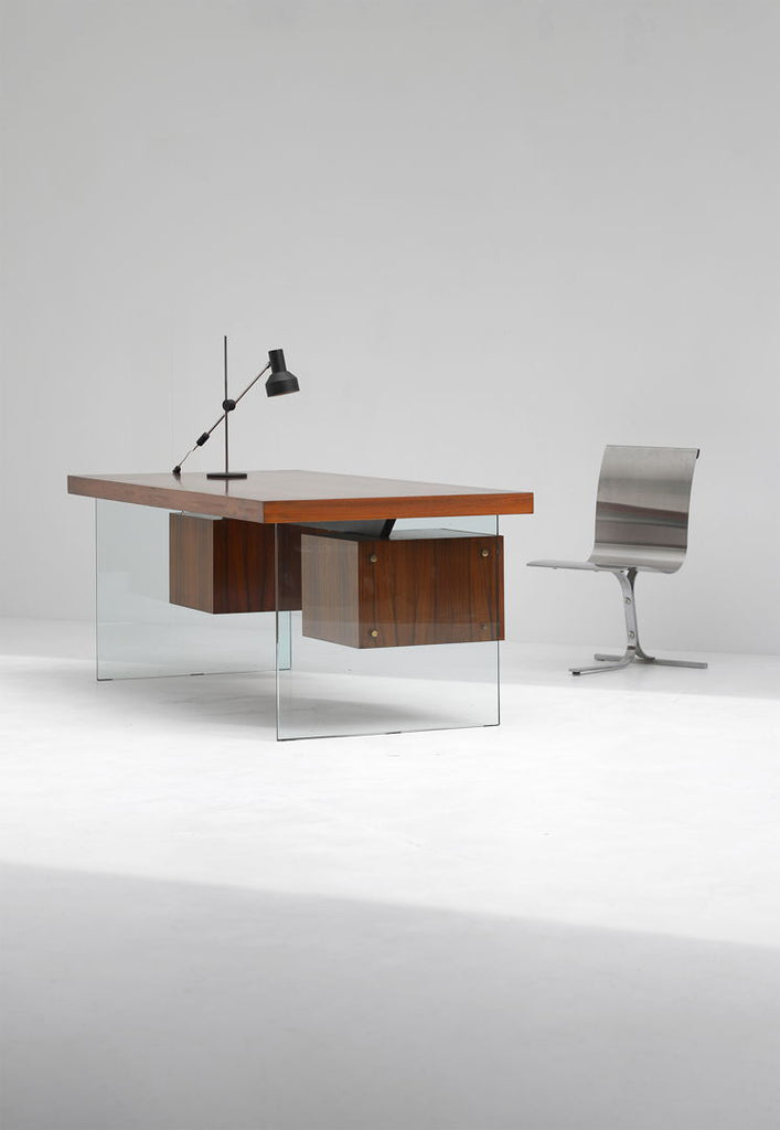 Jos de Mey가 Van den Berghe Pauvers를 위해 디자인한 희귀한 사무용 책상. 이 책상은 De Coene을 위해 그와 함께 여러 프로젝트를 함께 작업한 Stéphane Jasinski의 동료가 사전 소유했습니다. 책상은 다소 독특한 발견이며 거의 독점적이라고 말할 수 있습니다. 그것은 강화 유리 다리와 황동 색상 마운트가 있는 어두운 색상의 목재로 만들어졌습니다. 3개의 서랍과 수납공간이 있습니다. 서랍 칸에 Van den Berghe 로고가 표시되어 있습니다.