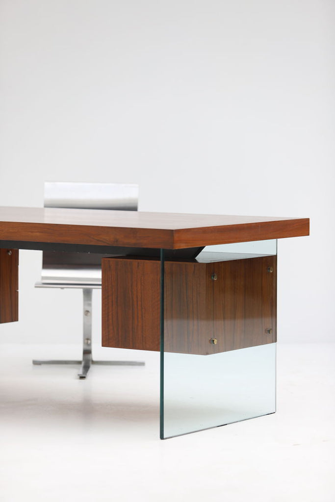 Rare executive desk designed by Jos de Mey for Van den Berghe Pauvers. This desk was pre owned by a co worker from Stéphane Jasinski who worked together on several projects with him for De Coene. The desk is rather a unique find, almost exclusive I can say. It is made out of a dark colored wood with tempered glass legs and brass colored mounts. It has 3 drawers and a storage compartment. Marked with the Van den Berghe logo in the drawer compartment.