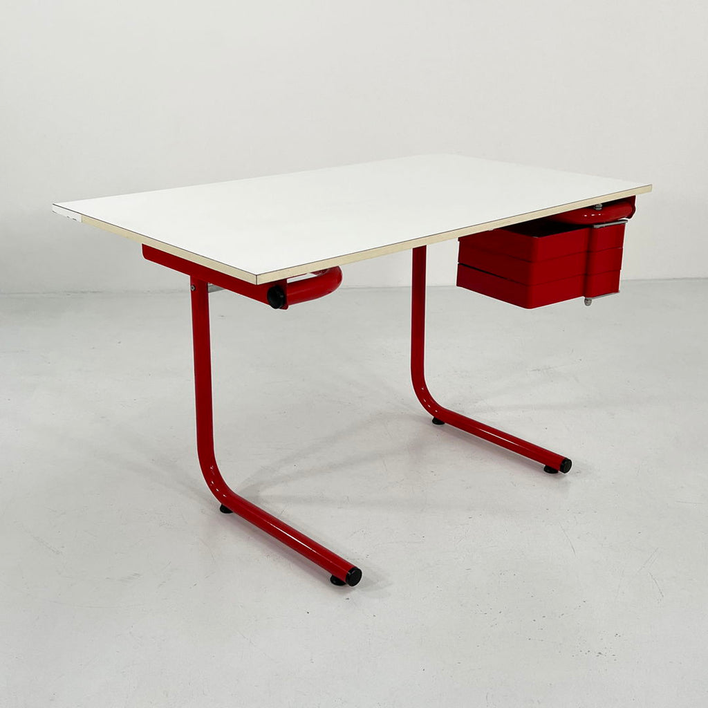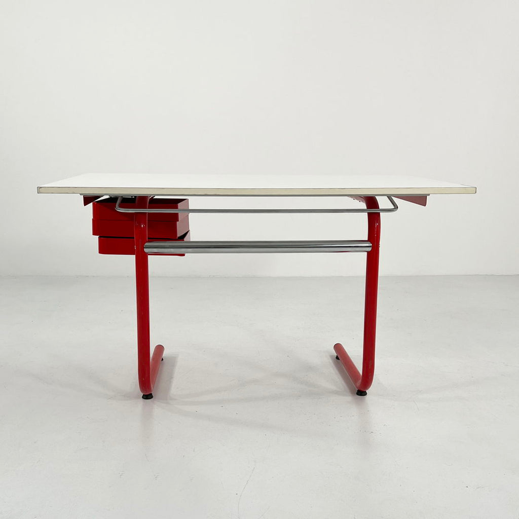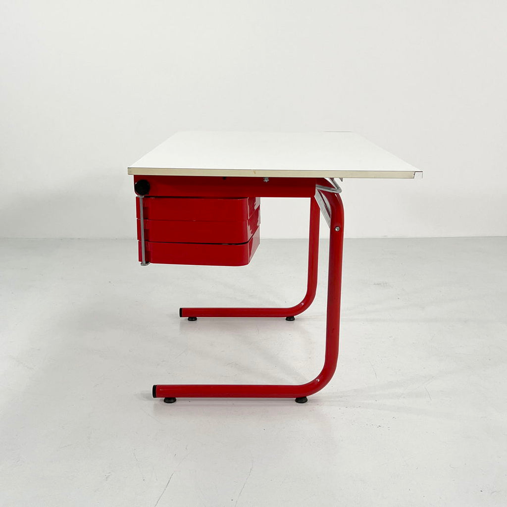 Red Drafting Table/Desk by Joe Colombo for Bieffeplast, 1970s Designer - Joe Colombo Producer - Bieffeplast Model - Drafting Table/Desk Design Period - Seventies Measurements - 폭 125cm x 깊이 74cm x 높이 75cm 재료 - 적층, 금속, 플라스틱 색상 - 빨간색, 흰색 상태 - 좋은 의견 - 경년 및 사용과 일치하는 가벼운 마모. 라미네이트는 특히 가장자리에 노화 및 황변의 흔적이 있습니다. 가벼운 흠집이 있습니다. 마지막 플라스틱 서랍에는 금속 부분에 닿는 부분에 플라스틱 요소가 없습니다. 자세한 내용은 사진을 참조하세요.