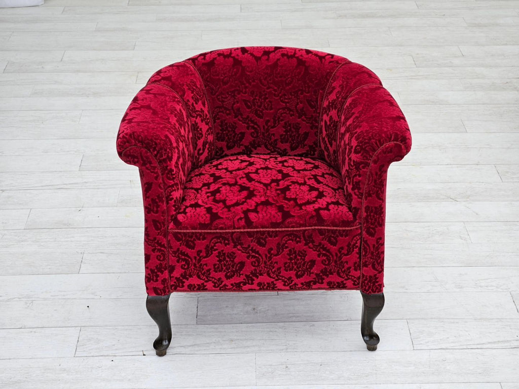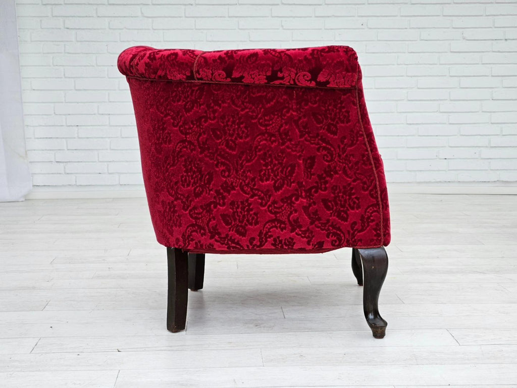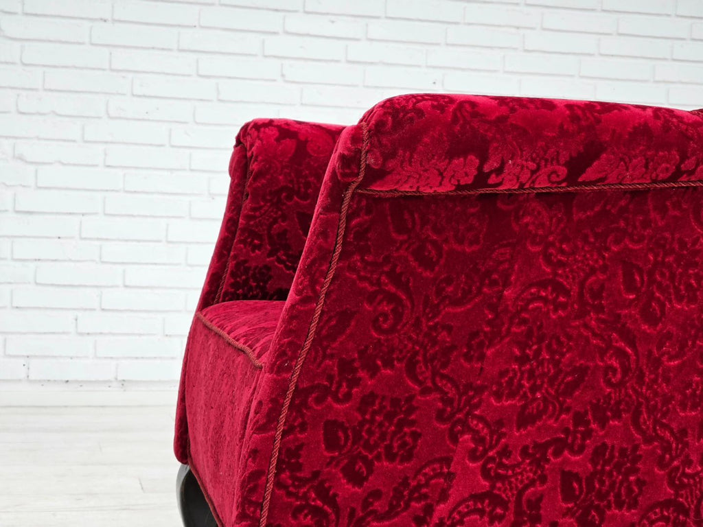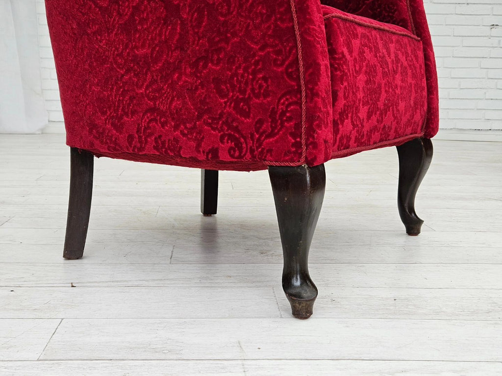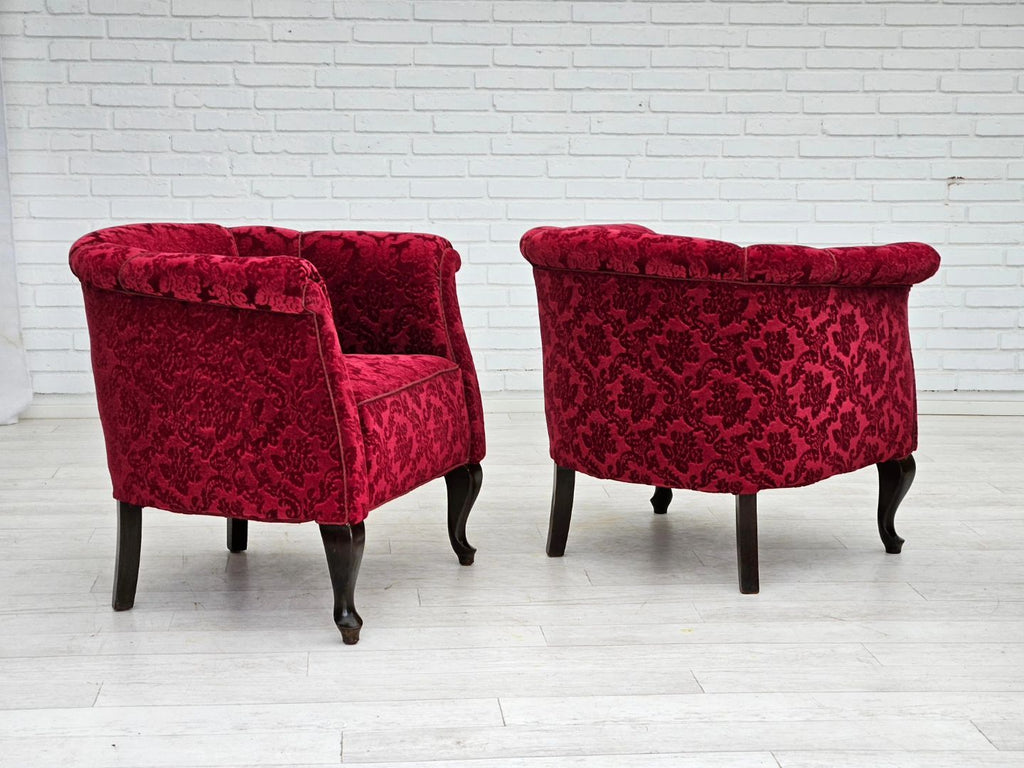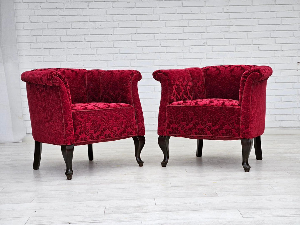 1950s, pair of Danish lounge chairs, red cotton/wool fabric, beech wood.