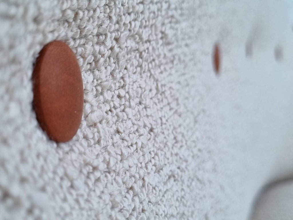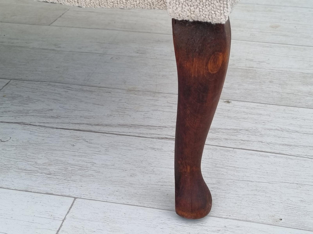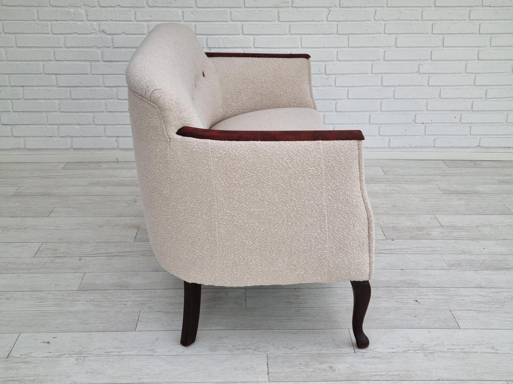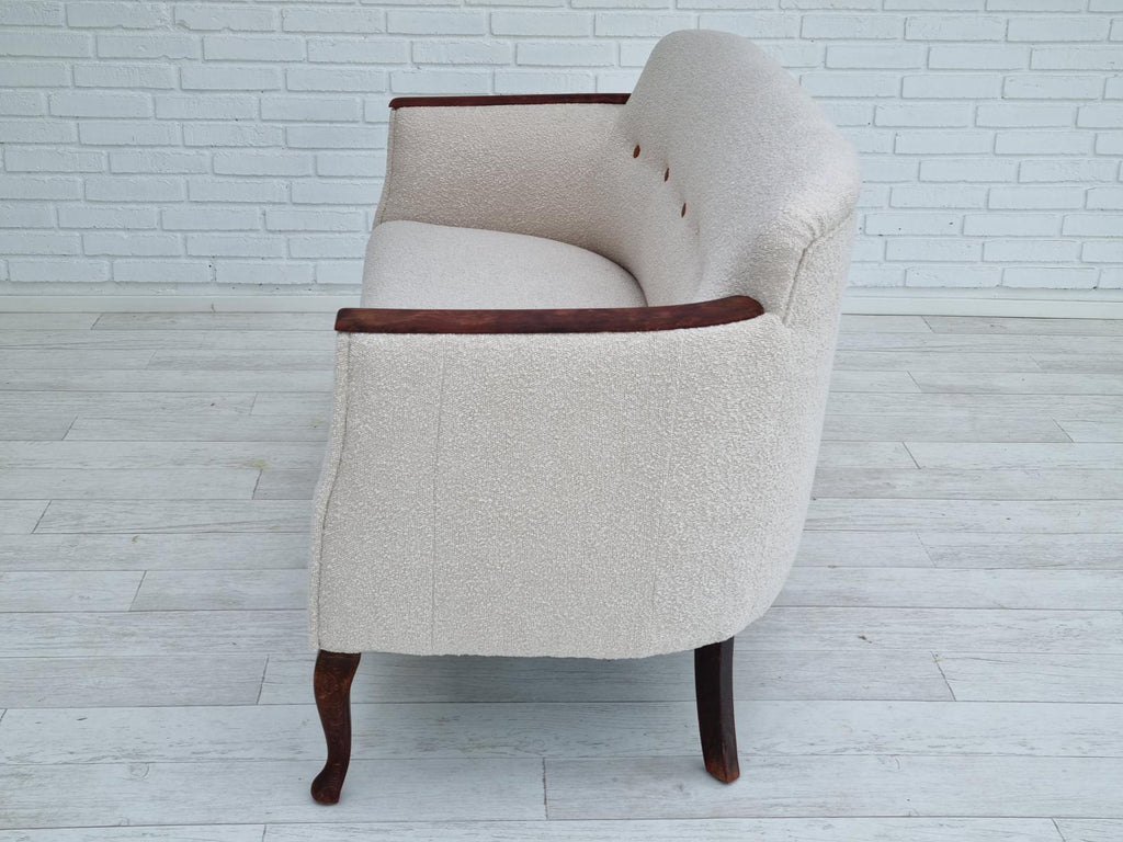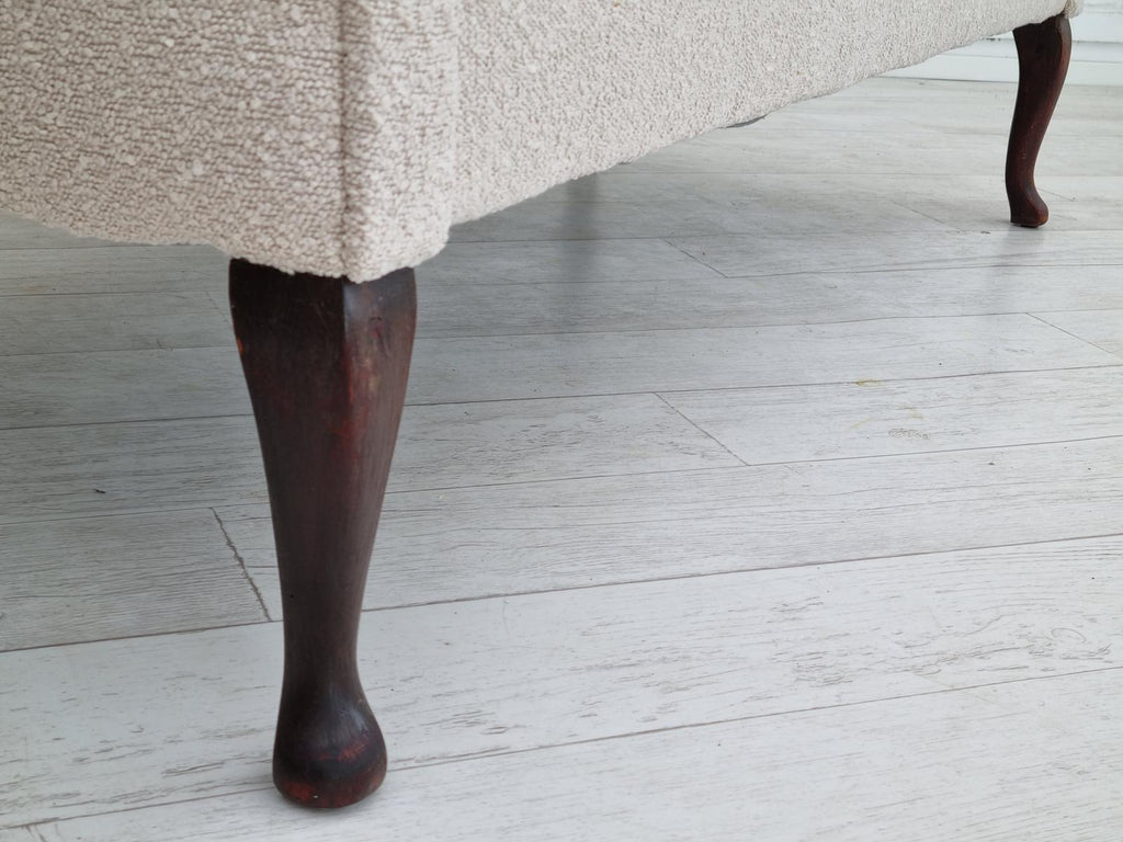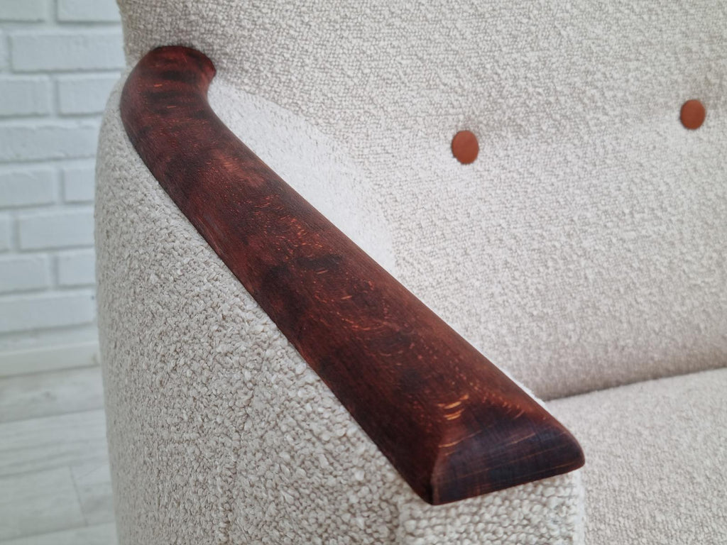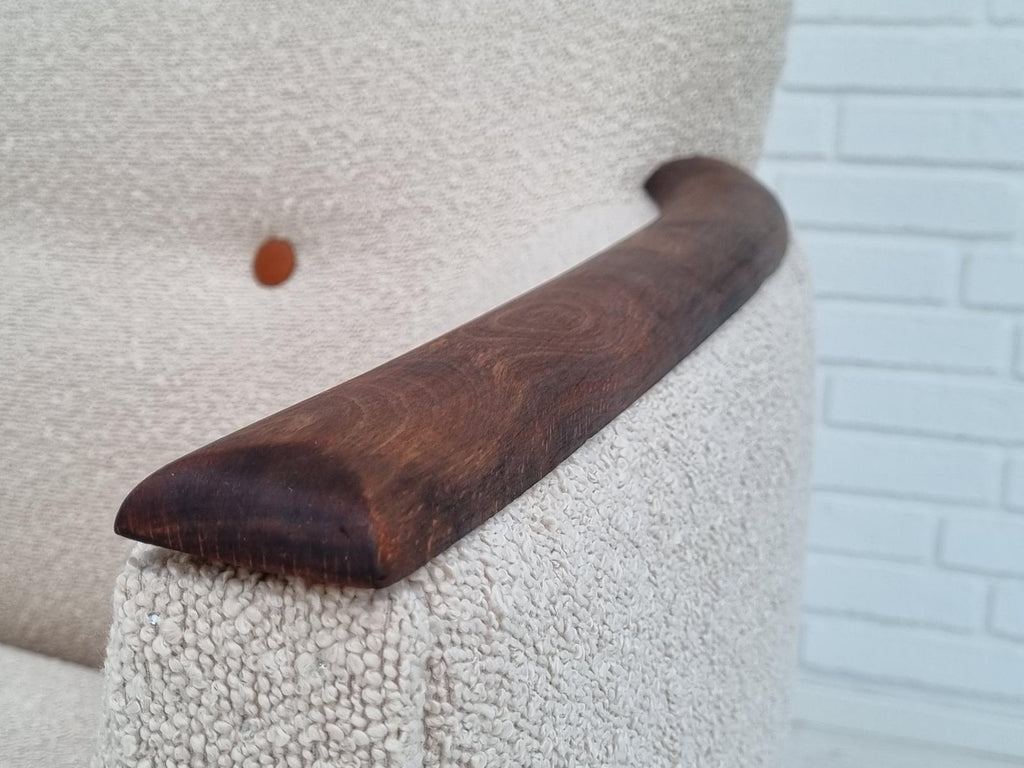 50년대 덴마크 장인 정신의 조각. 고급 밝은 베이지색 흰색 실내 장식품. 천연 코냑 가죽 버튼. 스테인드 너도밤나무로 만든 다리와 팔걸이. 시트의 원래 황동 스프링은 유지됩니다. 새 실내 장식품. 약 1955-60년에 덴마크 가구 제조업체에서 제조했습니다. 전문 실내 장식가, 장인에 의해 개조되었습니다.