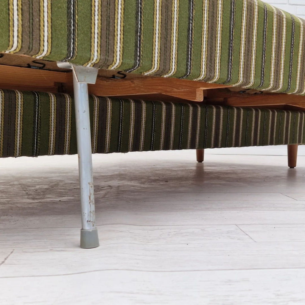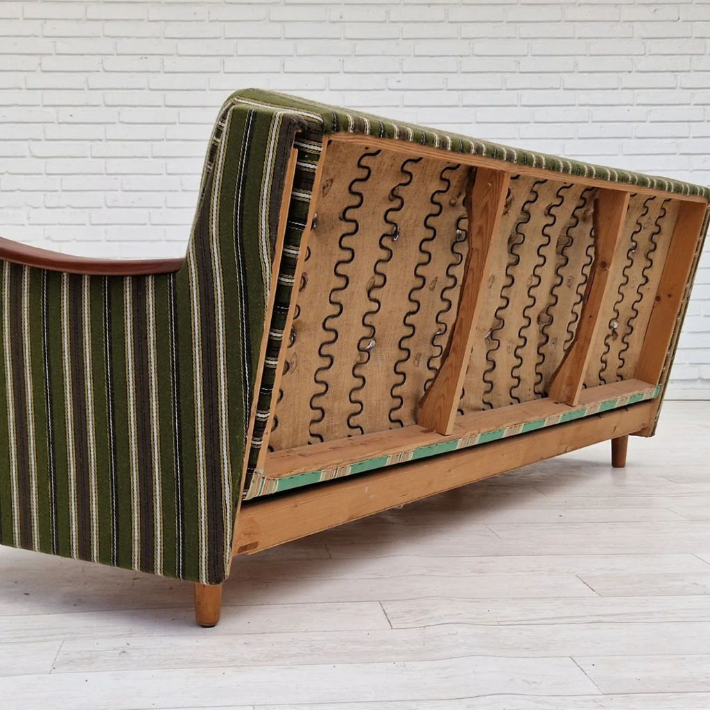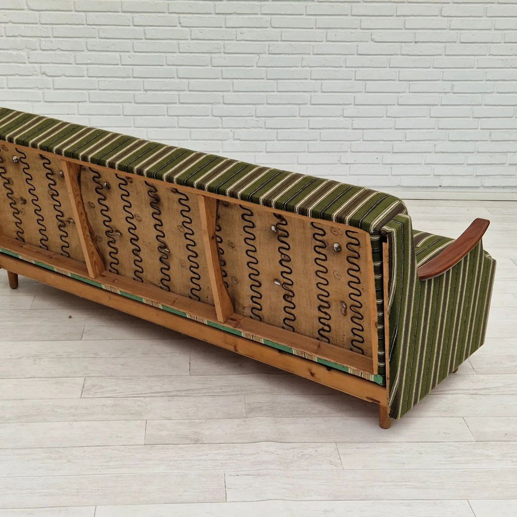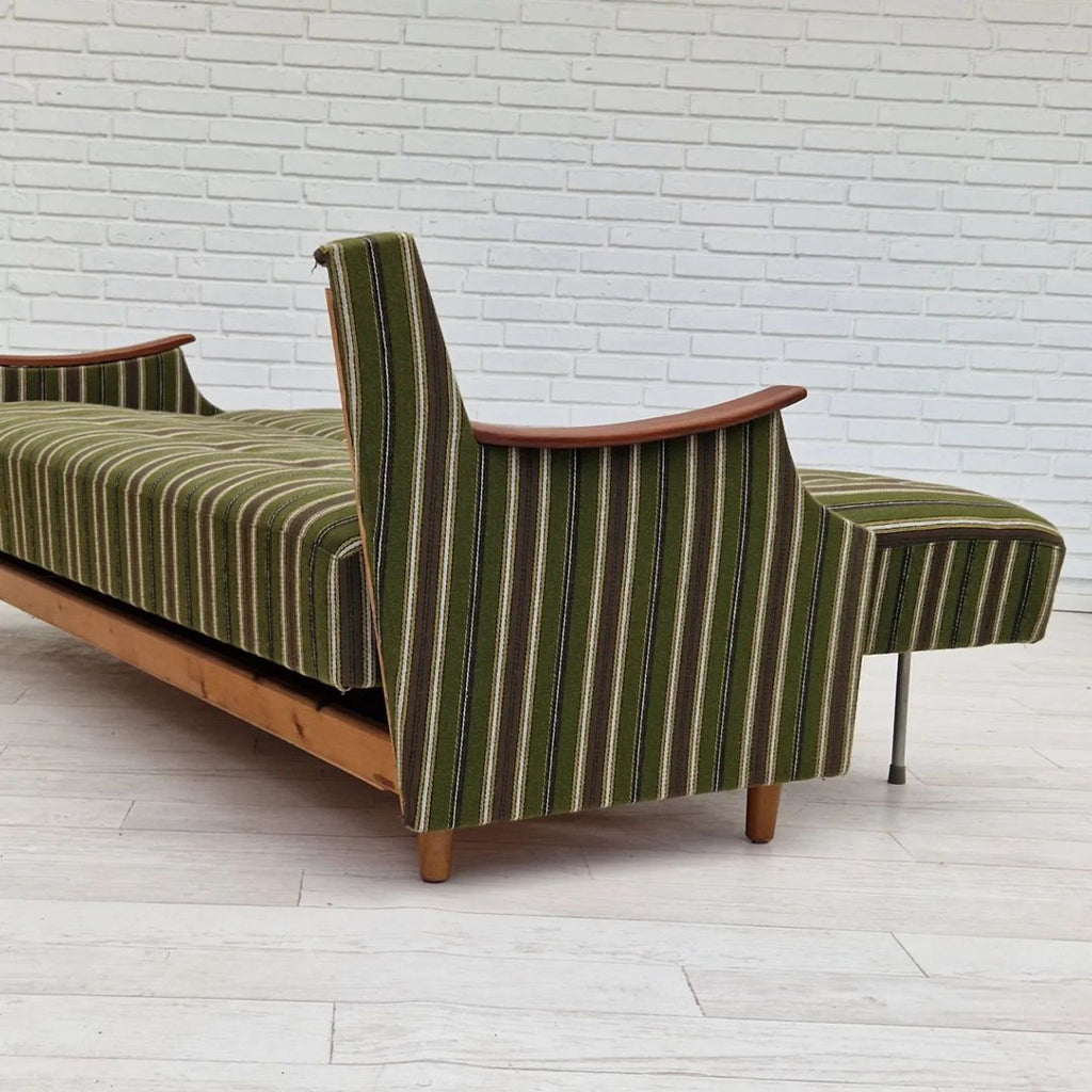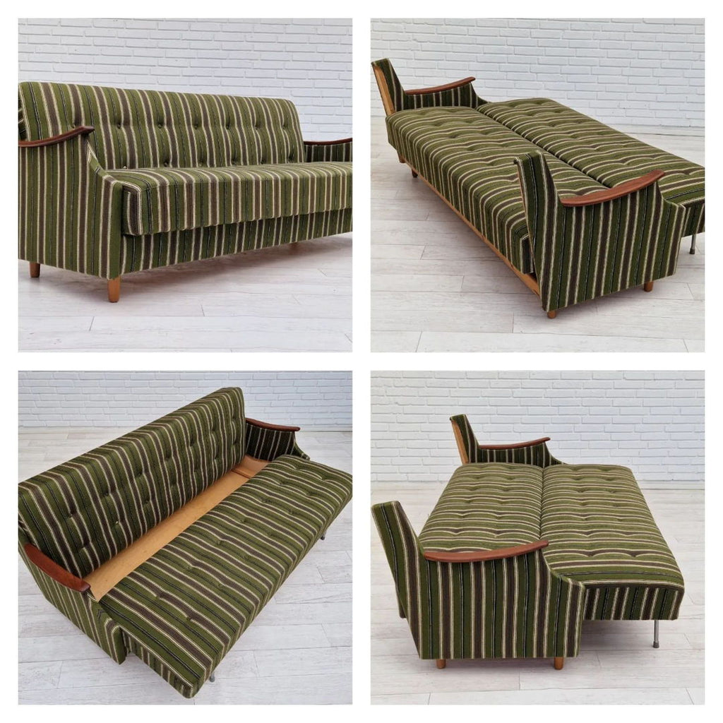 1960s, danish 3 seater folded sleeping sofa. Original very good condition, no smells and no stains. Springs in the seat and back. Renewed teak wood armrest, beech wood legs. Original furniture wool fabric in green vintage color.