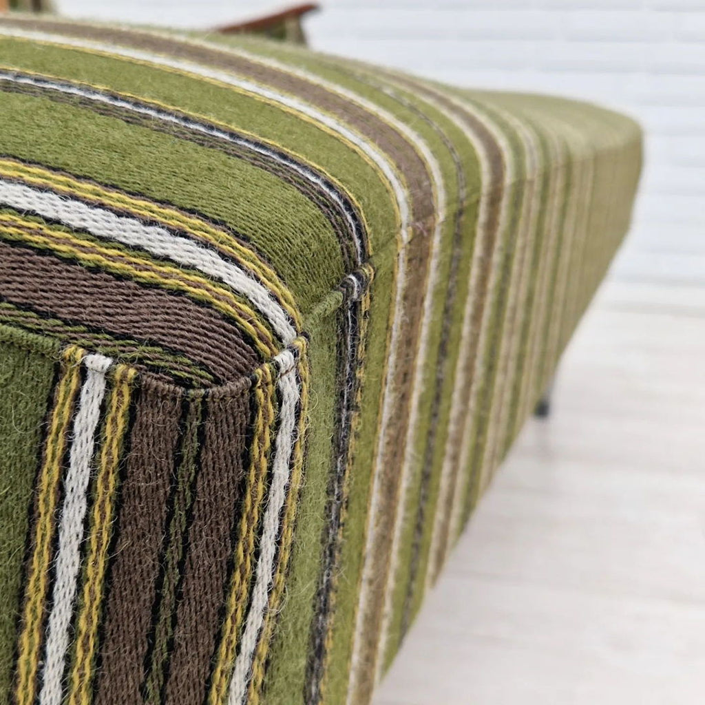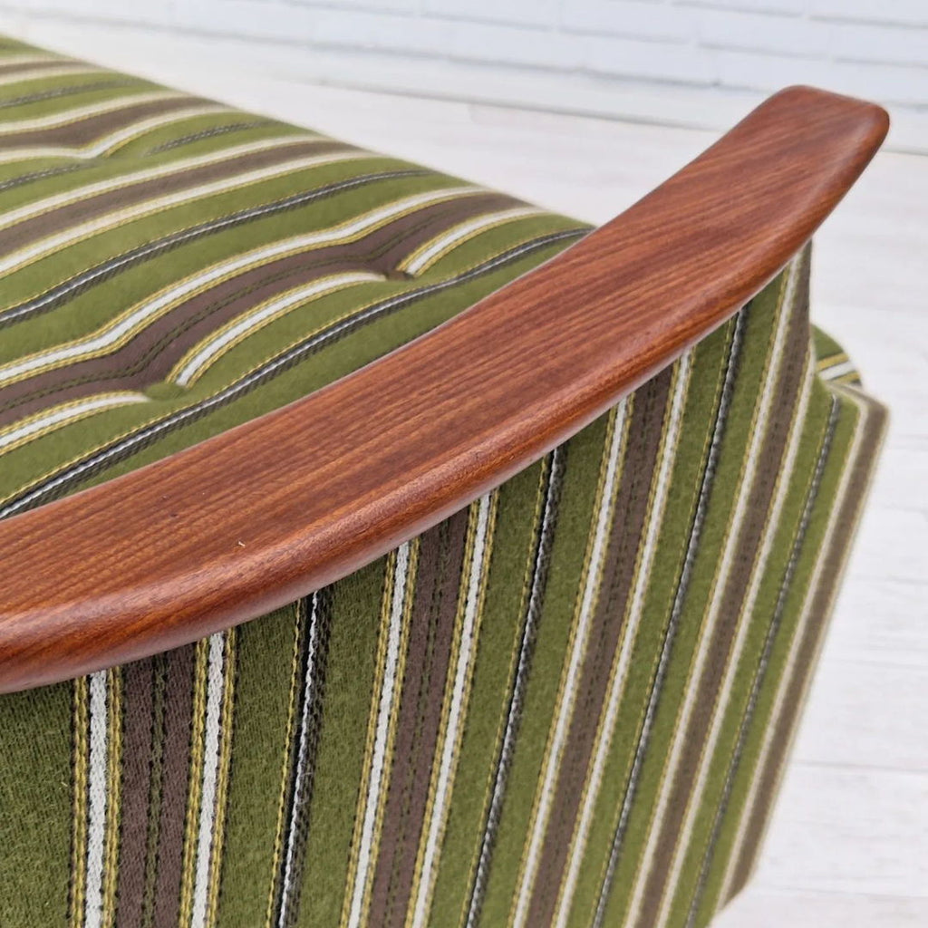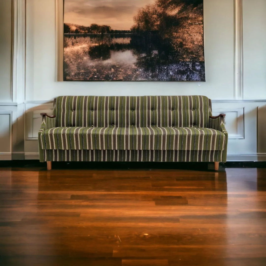 1960년대 덴마크 3인용 접이식 수면소파. 원래 상태 매우 양호하고 냄새도 없고 얼룩도 없습니다. 좌석과 등받이에 스프링이 있습니다. 티크재 팔걸이, 너도밤나무 다리를 리뉴얼했습니다. 그린 빈티지 색상의 오리지널 가구 울 원단.