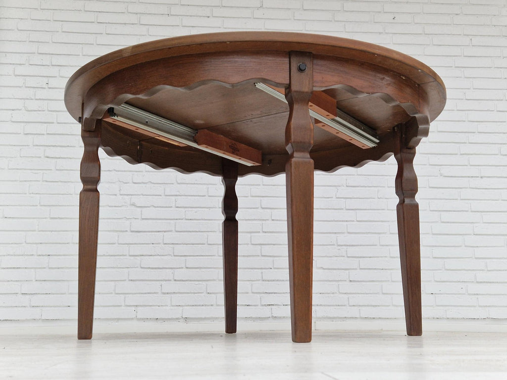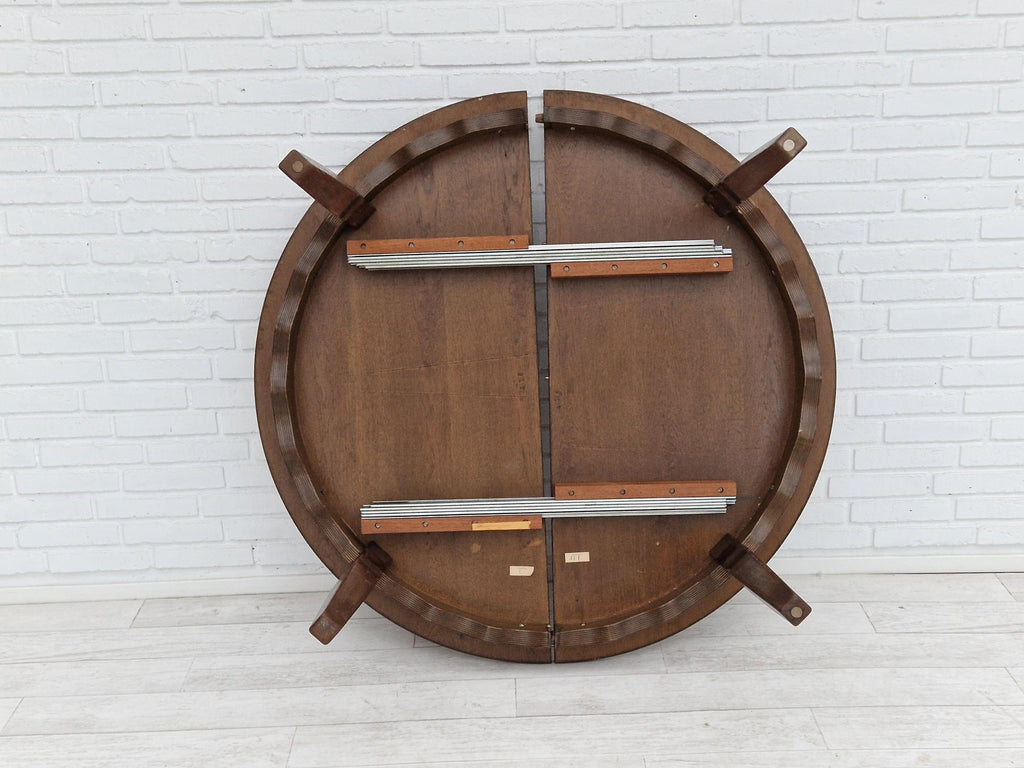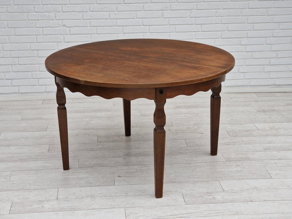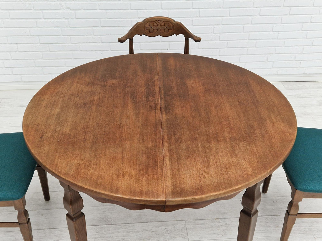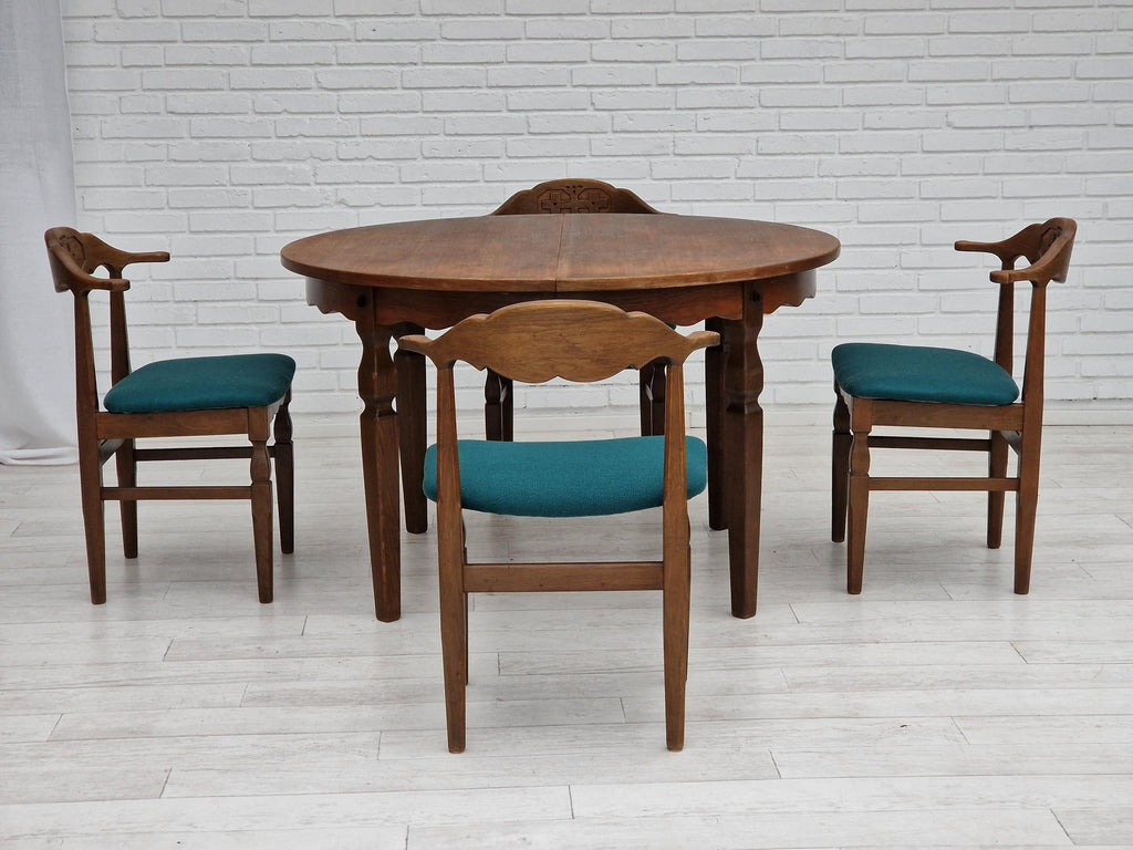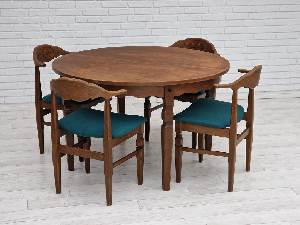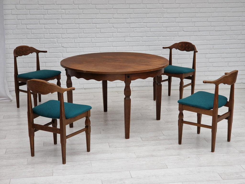 1960년대, Henning Kjærnulf의 덴마크 디자인, 테이블과 의자 4개 세트. 참나무, 가구 양모로 다시 천을 씌운 의자 좌석. 매우 좋은 상태의 원목 원목. 접이식 테이블(추가 센터 플레이트 없음). 이동식 다리. 1960년경 덴마크 가구 제조업체에서 제작. 크기: 테이블(Ø 120cm, H 73cm), 의자(H 78cm, W 54cm, D 50cm, SH 45cm, SW 50cm, SD39cm). 목재는 하자가 없으나 약간의 사용 흔적이 있을 수 있습니다.
