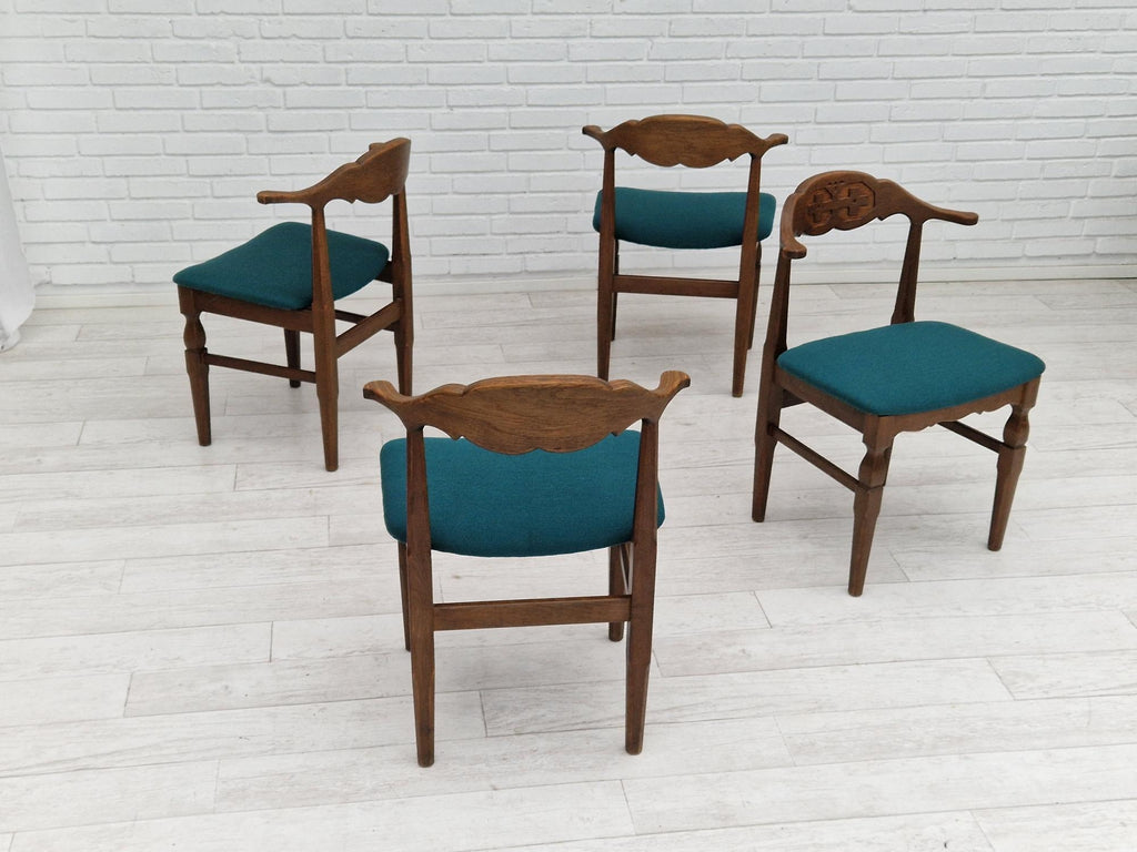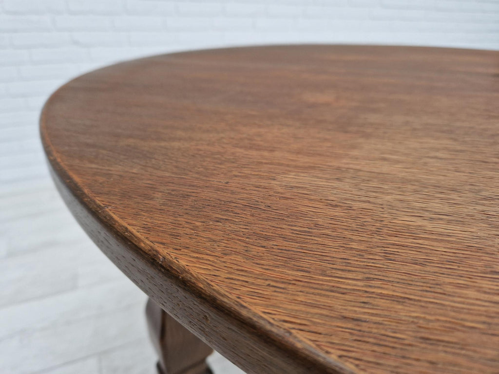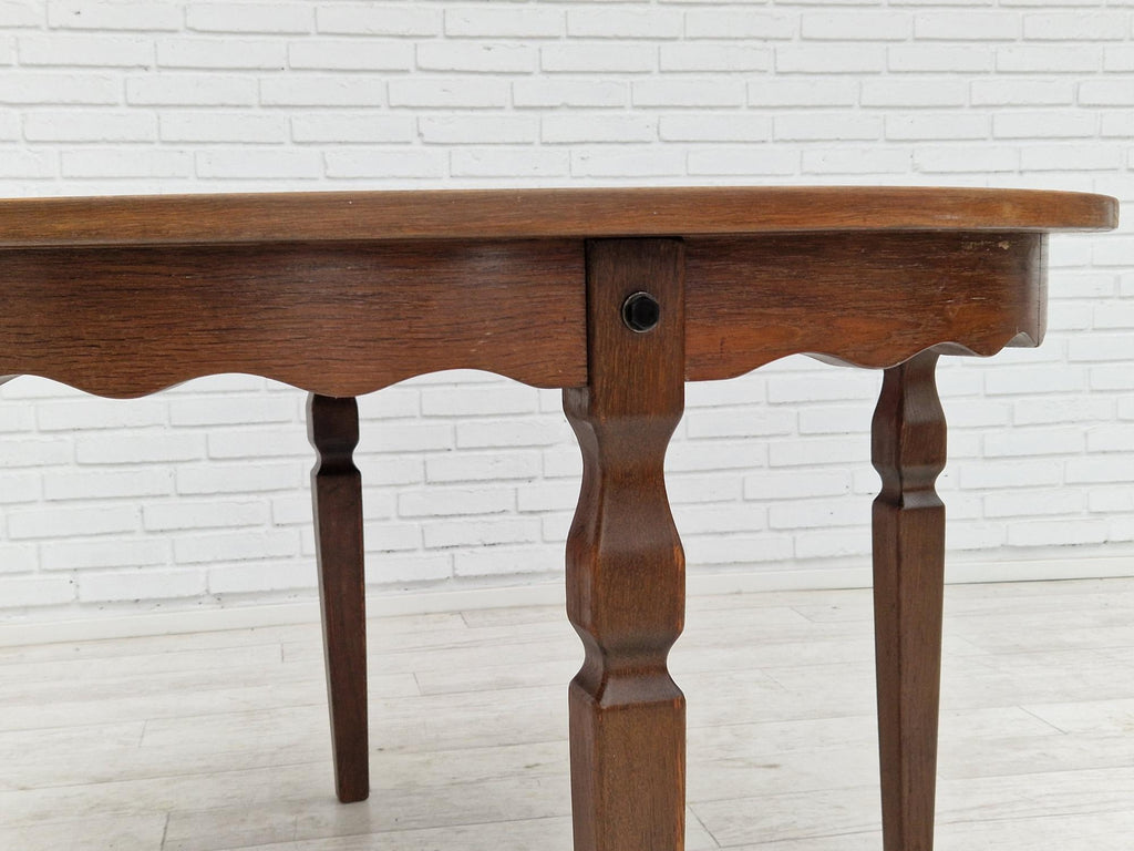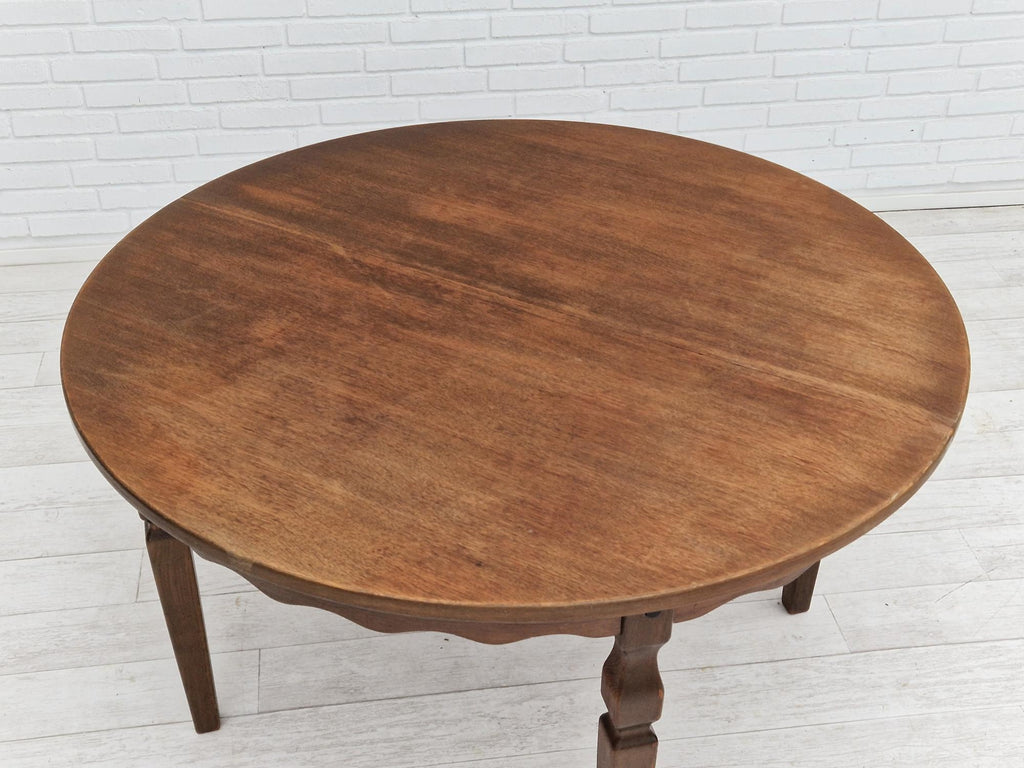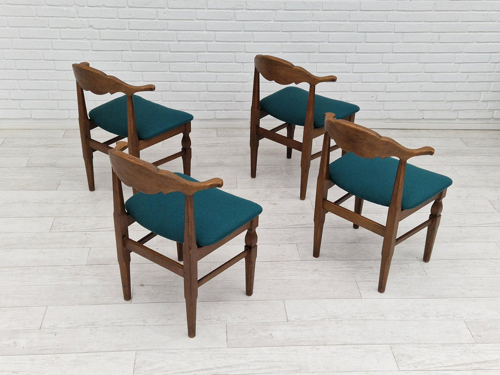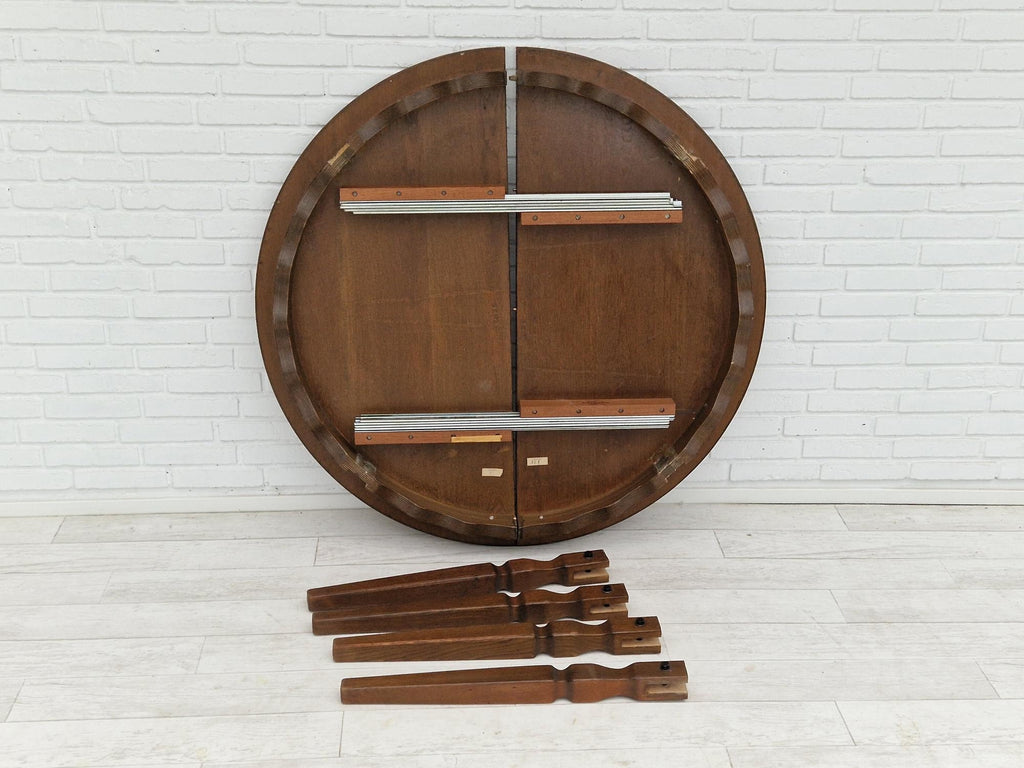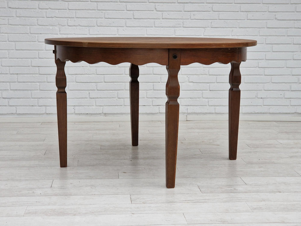 1960년대, Henning Kjærnulf의 덴마크 디자인, 테이블과 의자 4개 세트. 참나무, 가구 양모로 다시 천을 씌운 의자 좌석. 매우 좋은 상태의 원목 원목. 접이식 테이블(추가 센터 플레이트 없음). 이동식 다리. 1960년경 덴마크 가구 제조업체에서 제작. 크기: 테이블(Ø 120cm, H 73cm), 의자(H 78cm, W 54cm, D 50cm, SH 45cm, SW 50cm, SD39cm). 목재는 하자가 없으나 약간의 사용 흔적이 있을 수 있습니다.