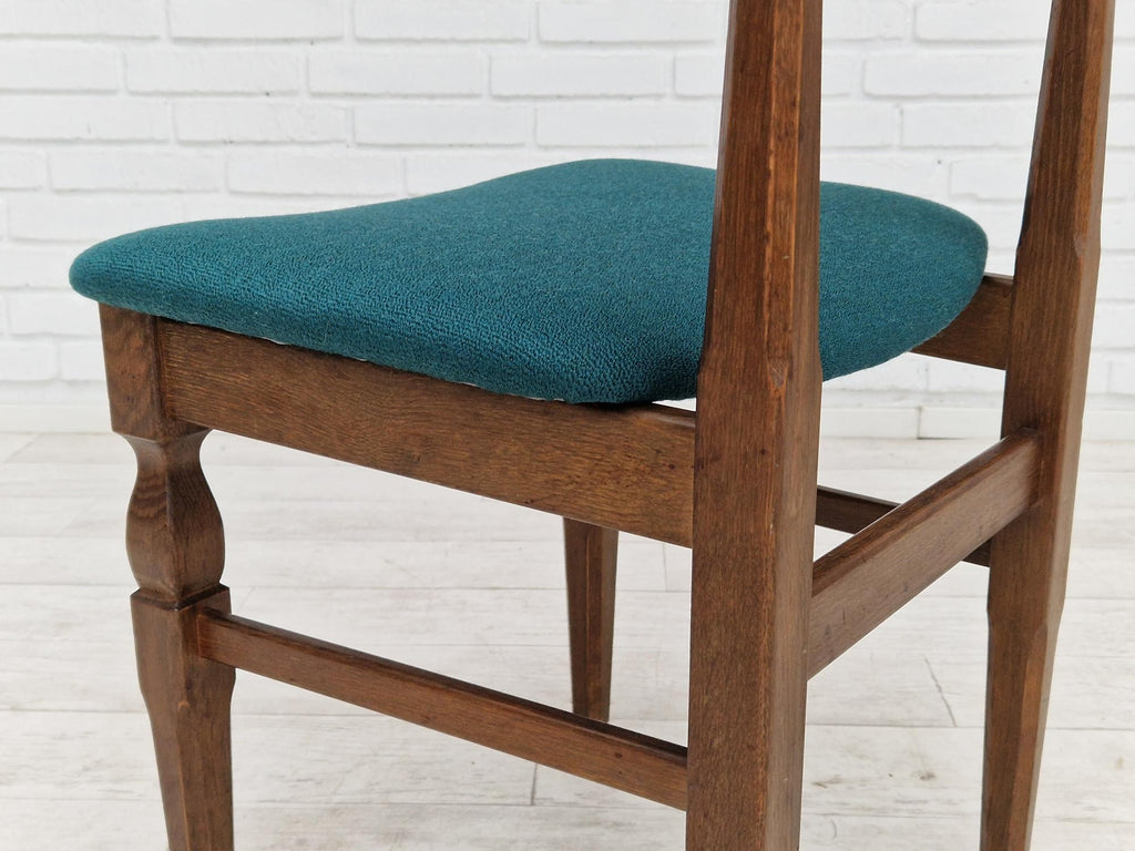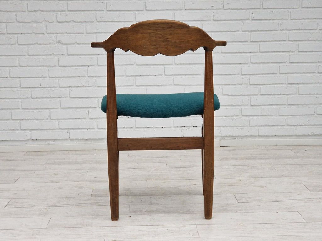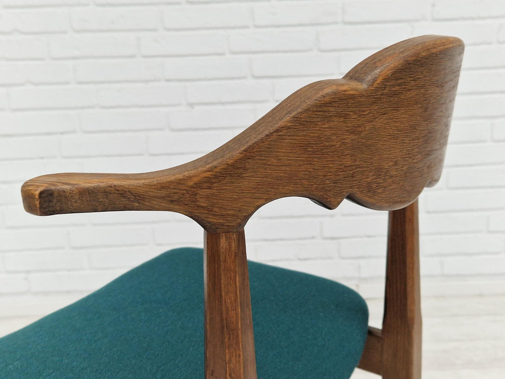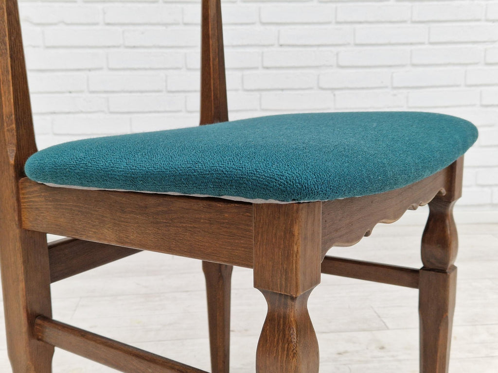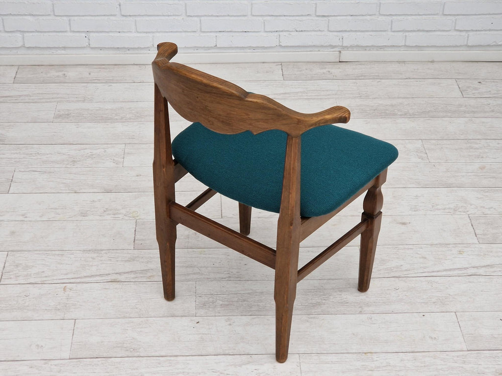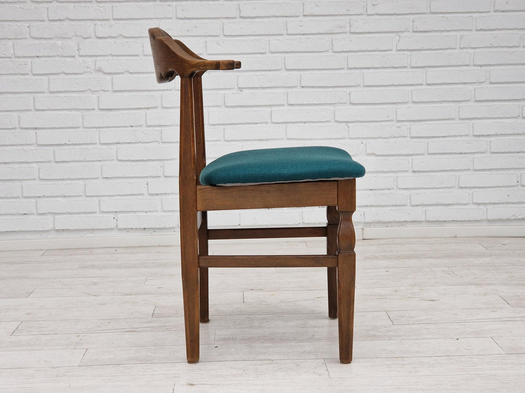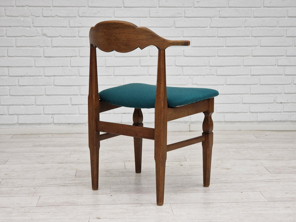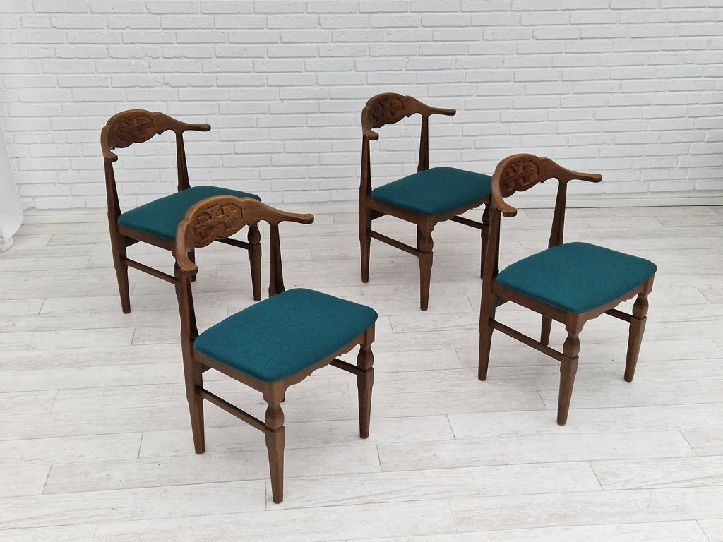 1960년대, Henning Kjærnulf의 덴마크 디자인, 테이블과 의자 4개 세트. 참나무, 가구 양모로 다시 천을 씌운 의자 좌석. 매우 좋은 상태의 원목 원목. 접이식 테이블(추가 센터 플레이트 없음). 이동식 다리. 1960년경 덴마크 가구 제조업체에서 제작. 크기: 테이블(Ø 120cm, H 73cm), 의자(H 78cm, W 54cm, D 50cm, SH 45cm, SW 50cm, SD39cm). 목재는 하자가 없으나 약간의 사용 흔적이 있을 수 있습니다.