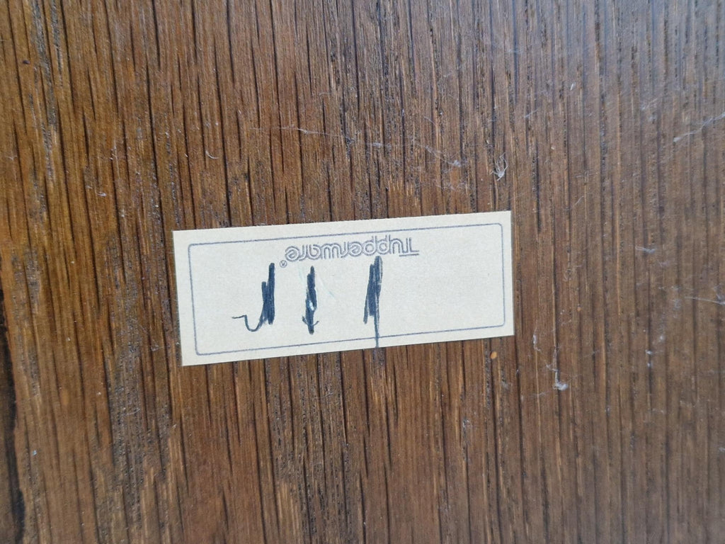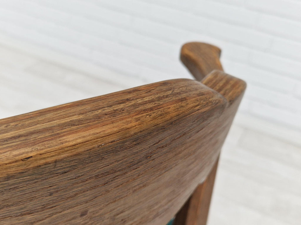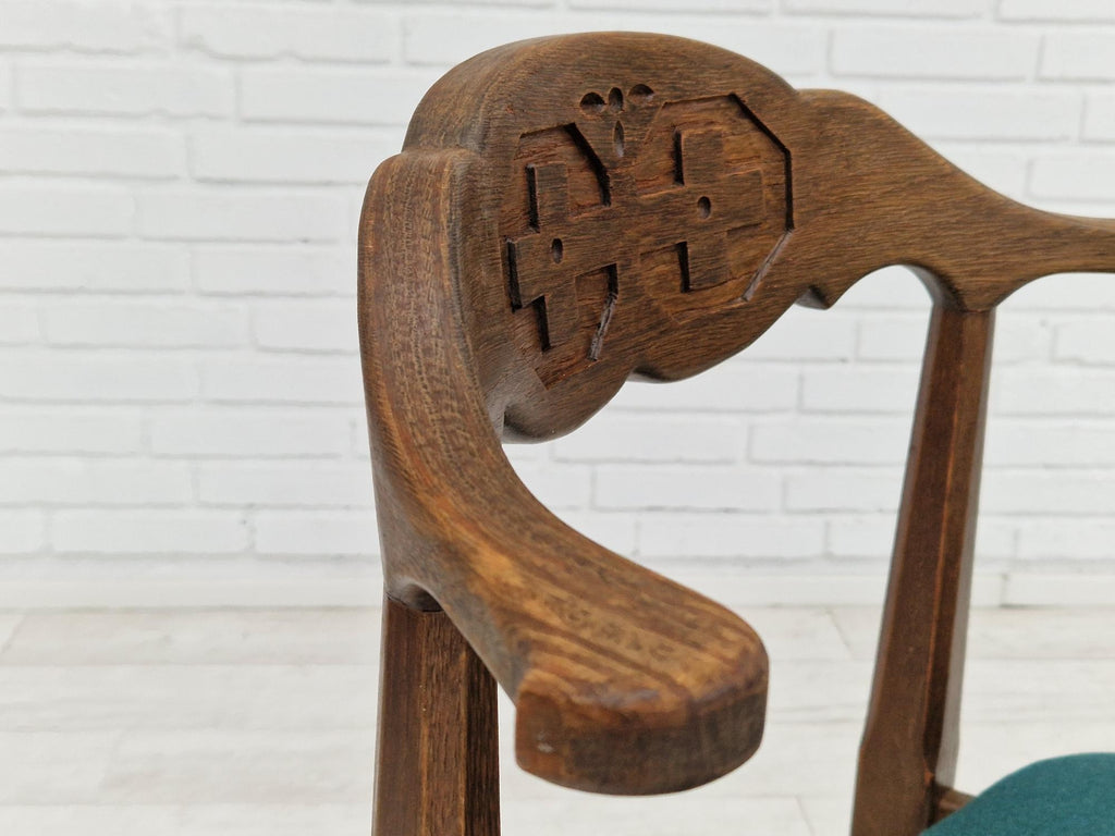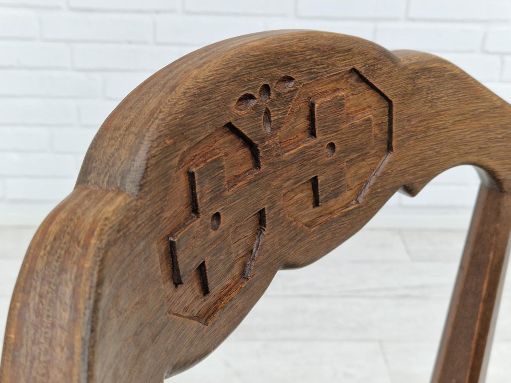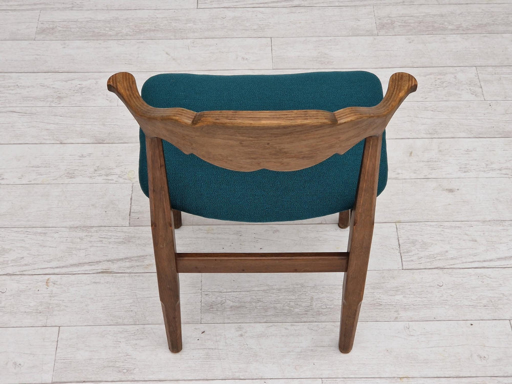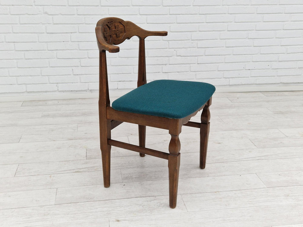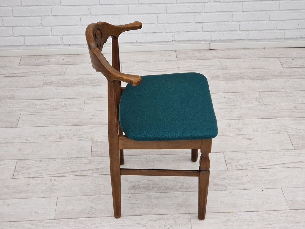 1960년대, Henning Kjærnulf의 덴마크 디자인, 테이블과 의자 4개 세트. 참나무, 가구 양모로 다시 천을 씌운 의자 좌석. 매우 좋은 상태의 원목 원목. 접이식 테이블(추가 센터 플레이트 없음). 이동식 다리. 1960년경 덴마크 가구 제조업체에서 제작. 크기: 테이블(Ø 120cm, H 73cm), 의자(H 78cm, W 54cm, D 50cm, SH 45cm, SW 50cm, SD39cm). 목재는 하자가 없으나 약간의 사용 흔적이 있을 수 있습니다.