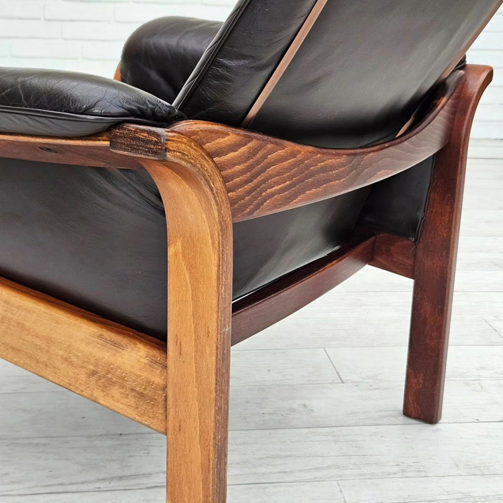 1970년대 스웨덴 디자인, 괴테 뫼블러(Göte Möbler). 등받이가 있는 조절 가능한 좌석. 원래 매우 좋은 상태: 냄새도 없고 얼룩도 없습니다. 갈색 가죽 너도밤나무.