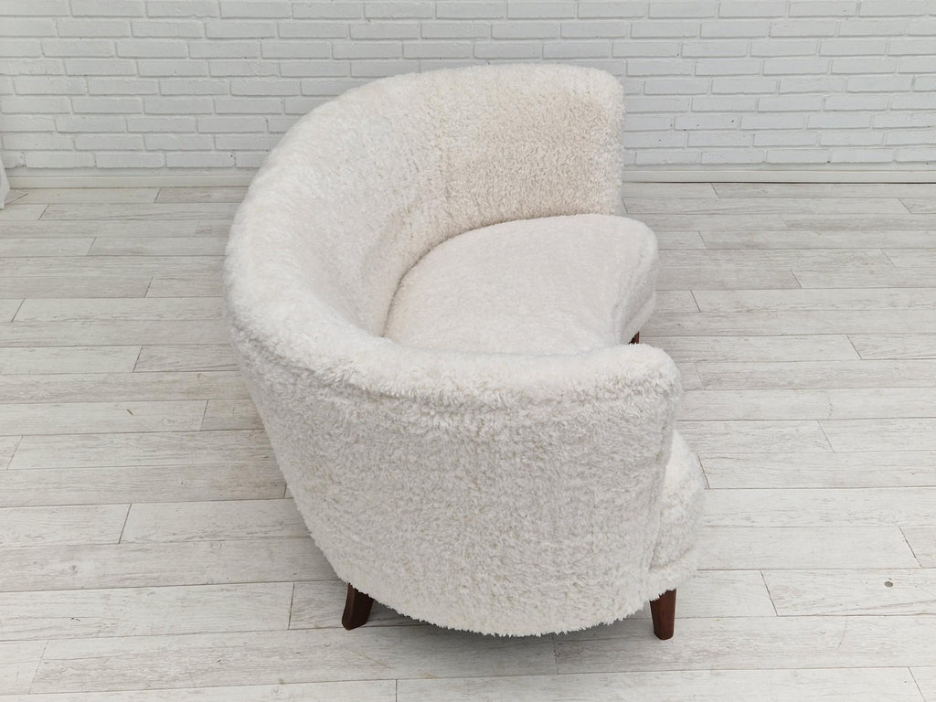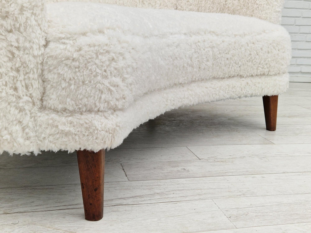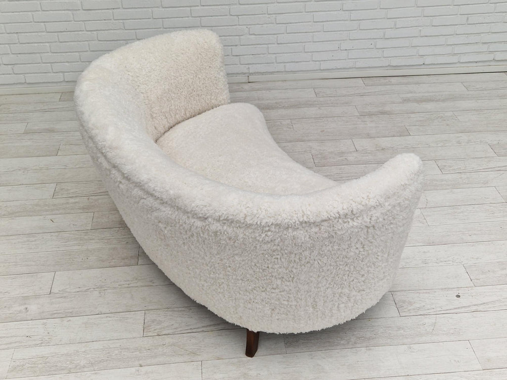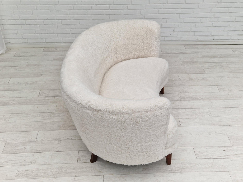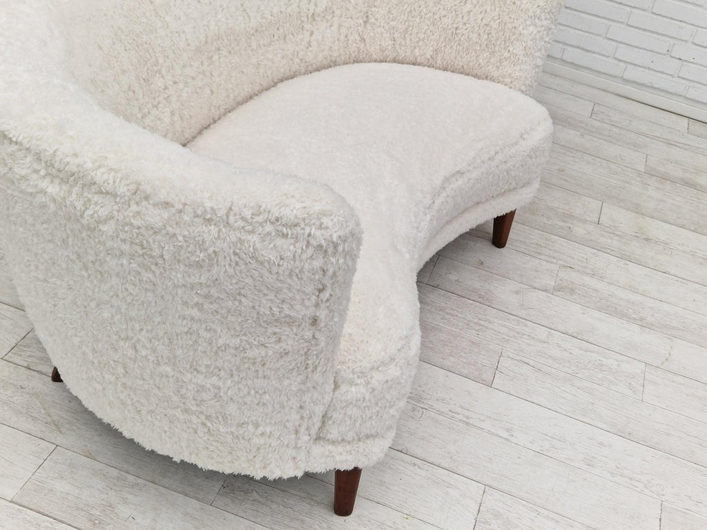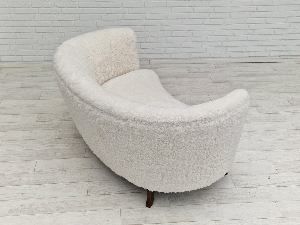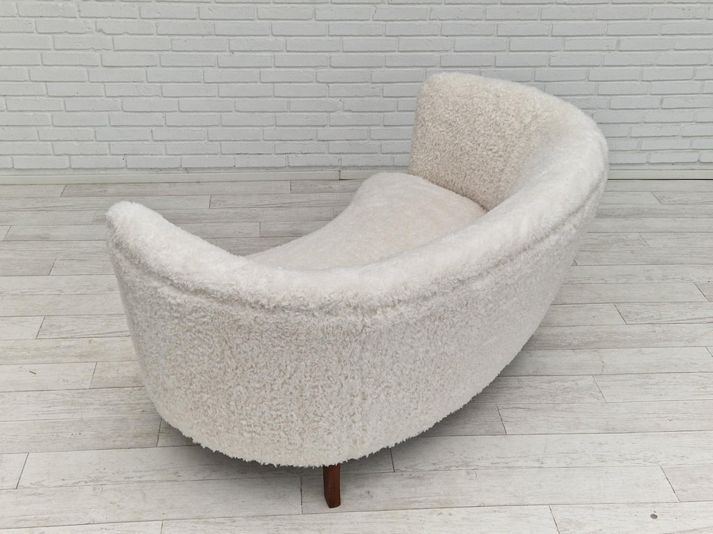60년대, 덴마크 디자인. 리폼된 2인용 "바나나 소파". 품질 Nevotex 가구 양가죽 모방 "Ulrikke". 얼룩진 너도밤나무 다리. 원래 황동 스프링이 유지됩니다. 1960년경 덴마크 가구 제조업체에서 제조. 전문 가구 장식가, 장인이 개조했습니다.