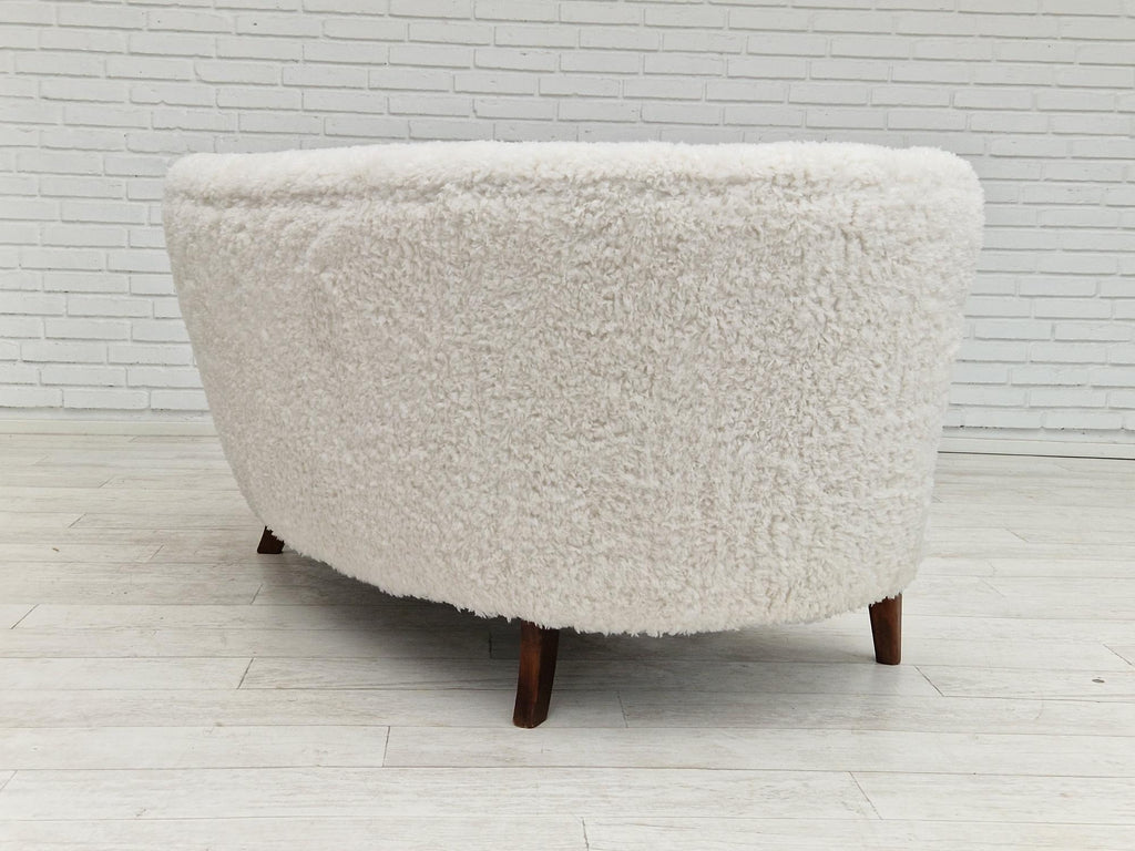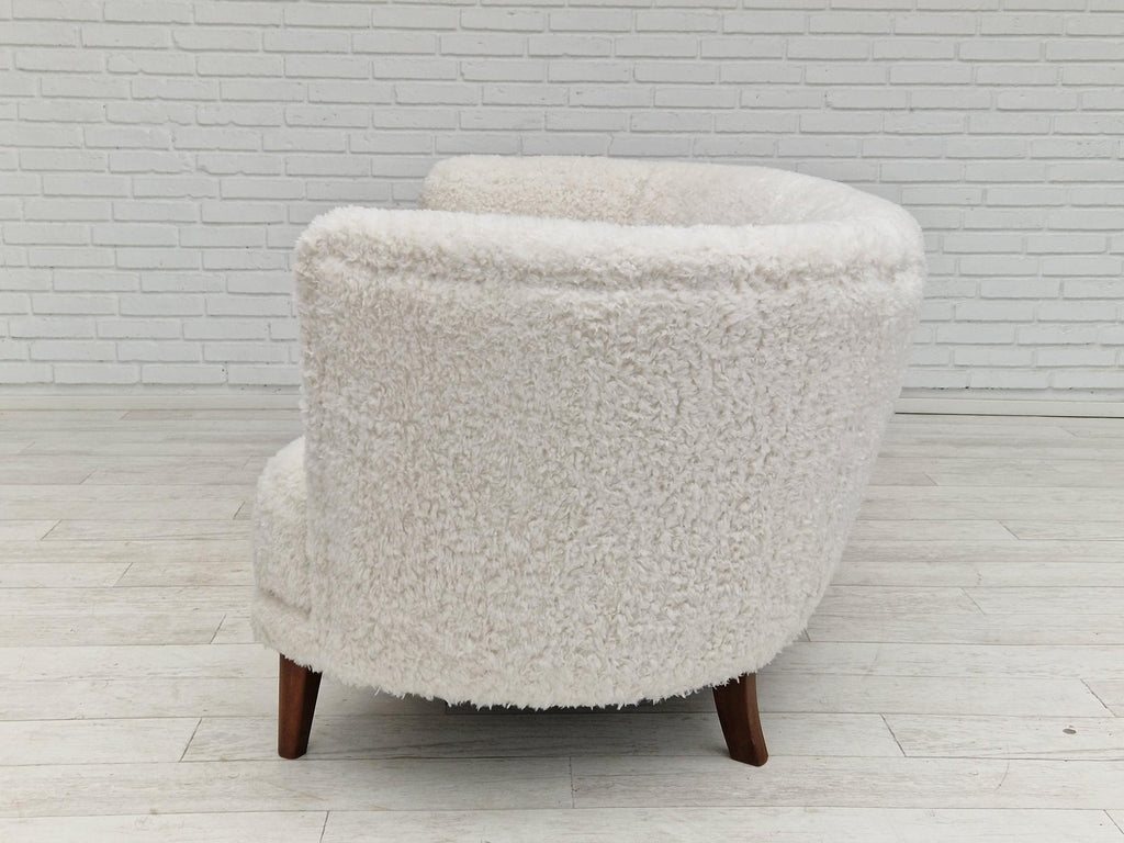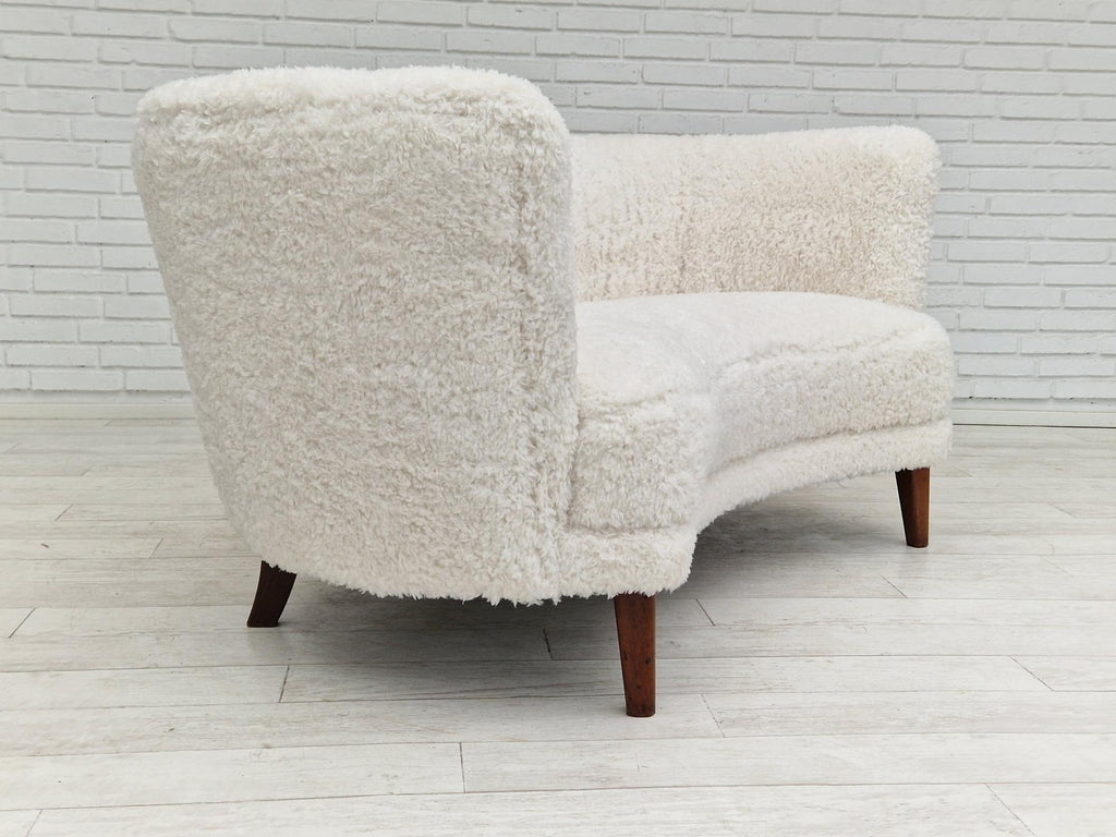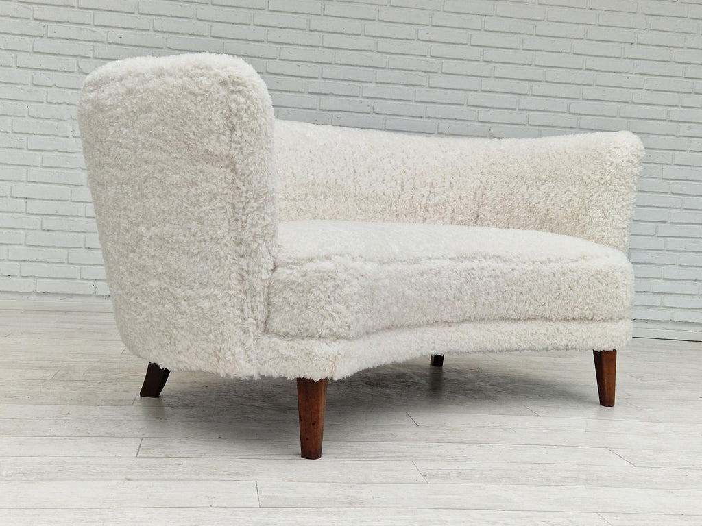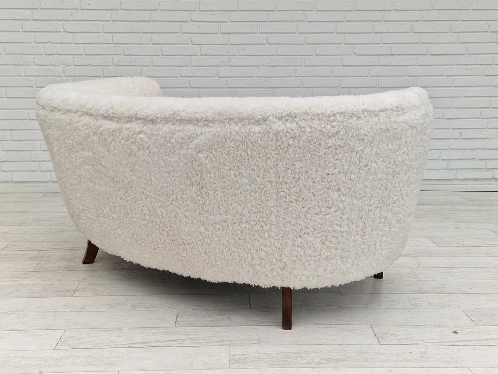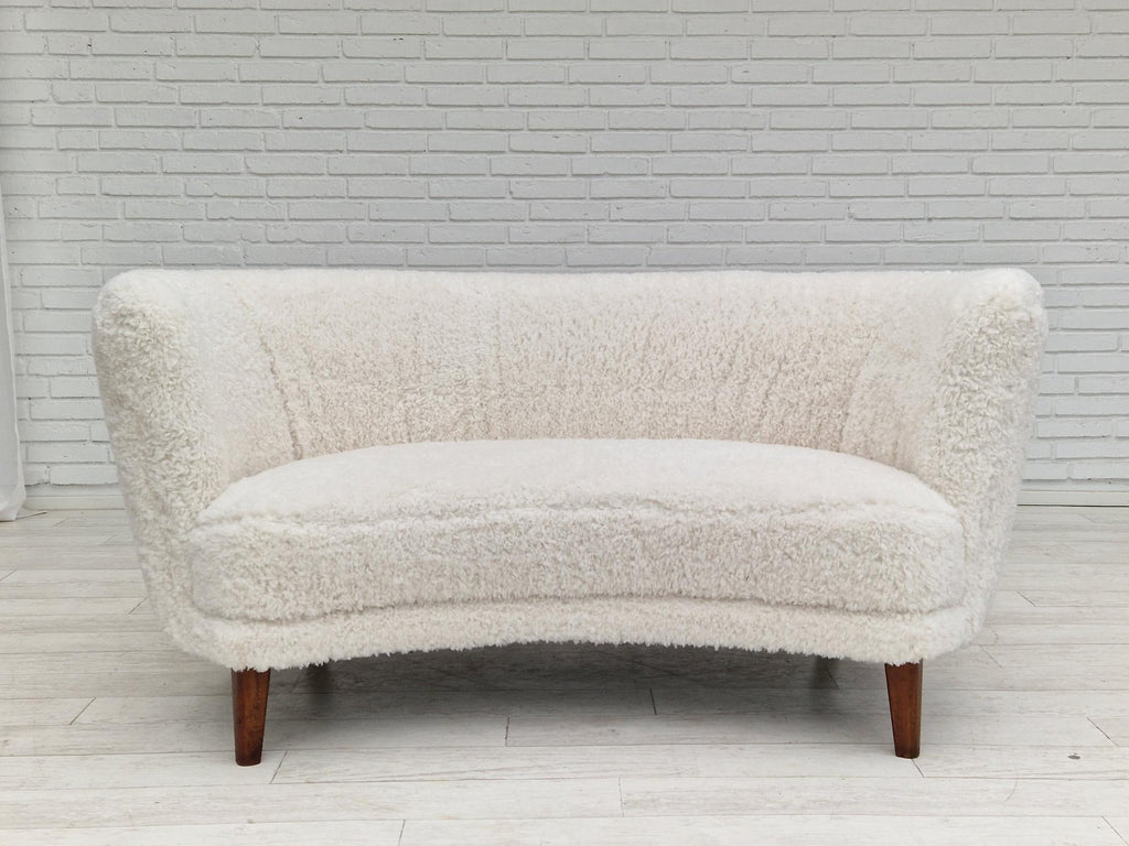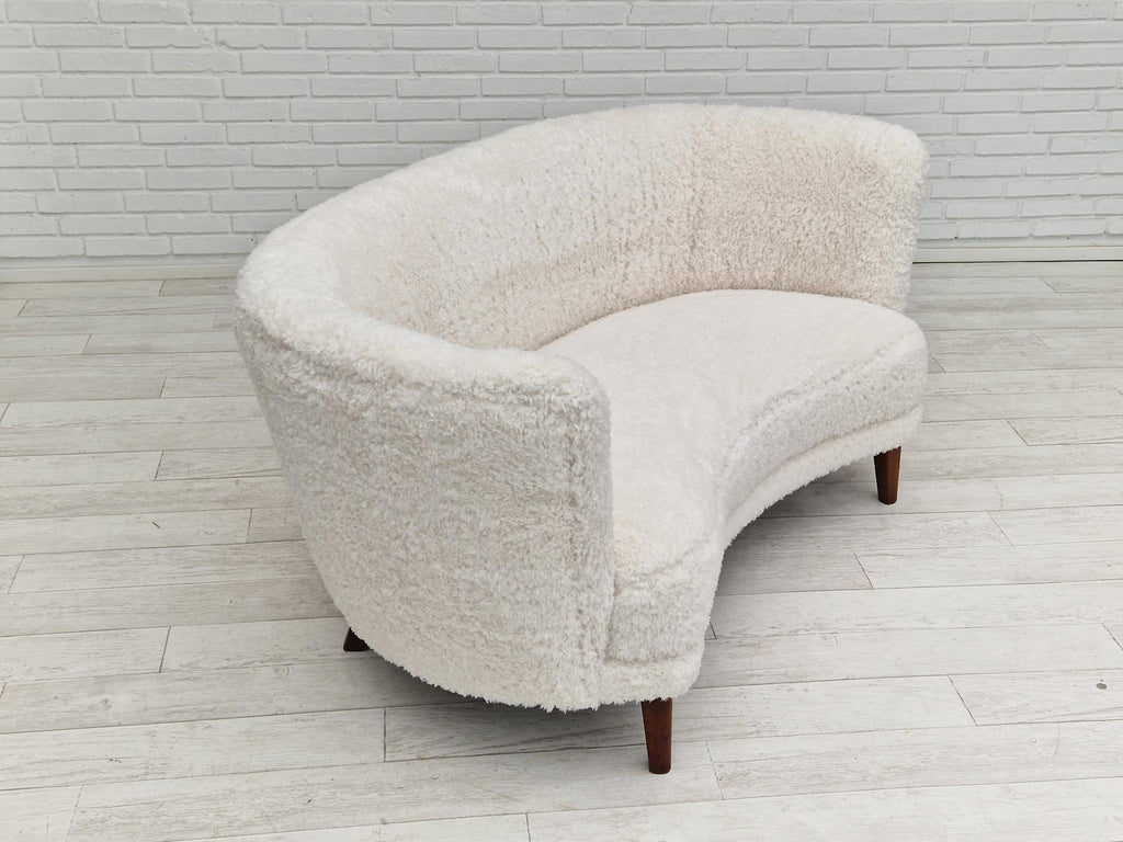 60년대, 덴마크 디자인. 리폼된 2인용 "바나나 소파". 품질 Nevotex 가구 양가죽 모방 "Ulrikke". 얼룩진 너도밤나무 다리. 원래 황동 스프링이 유지됩니다. 1960년경 덴마크 가구 제조업체에서 제조. 전문 가구 장식가, 장인이 개조했습니다.
