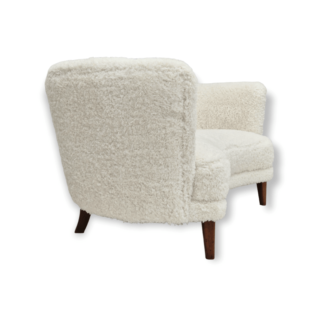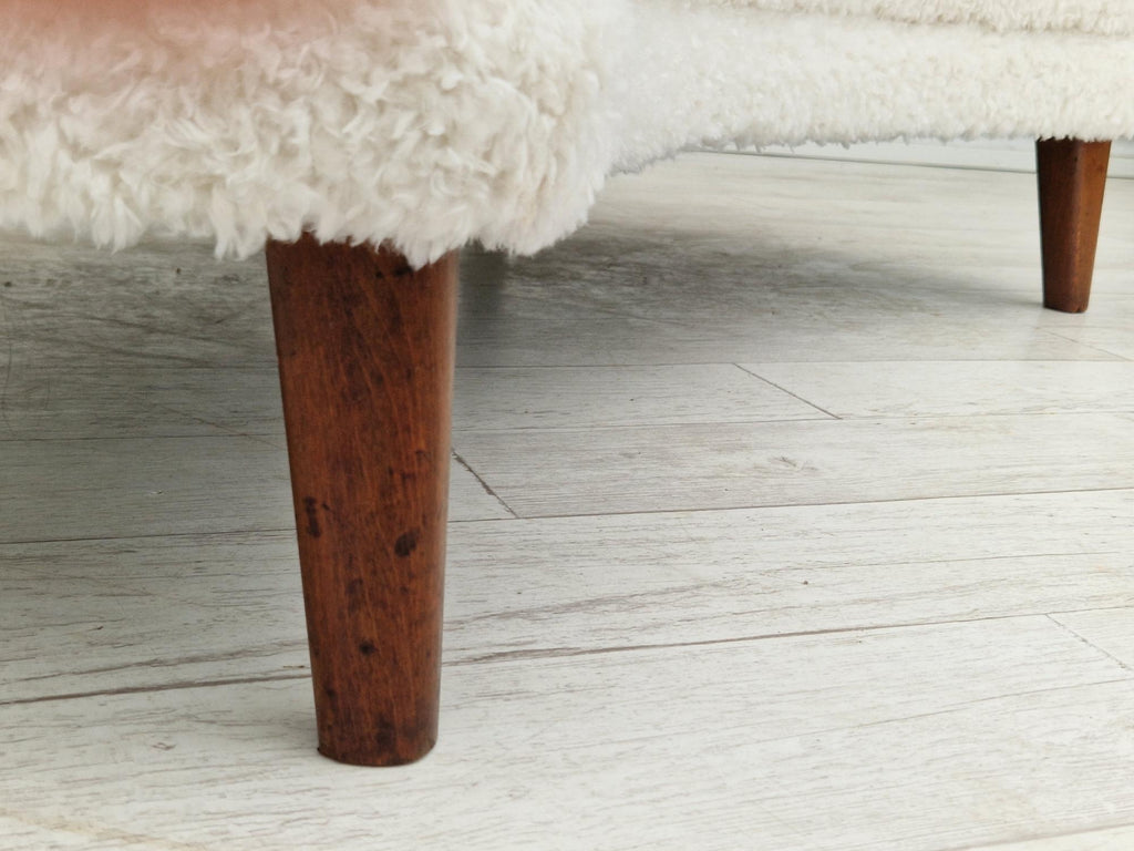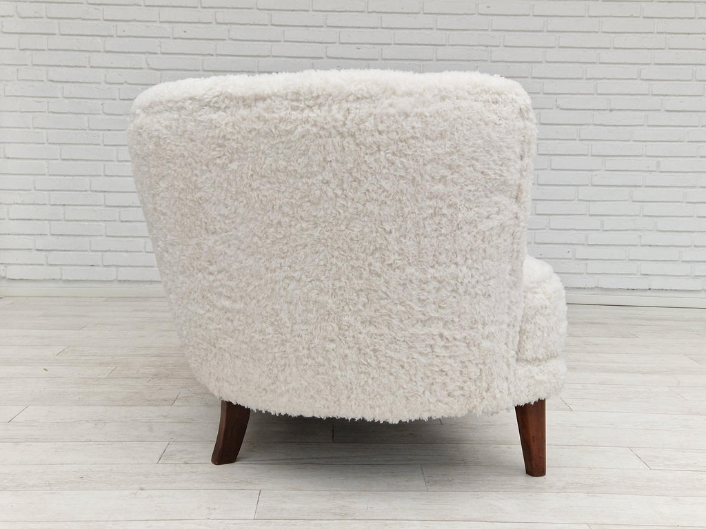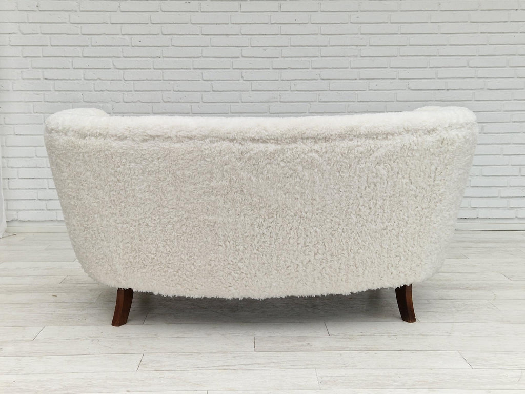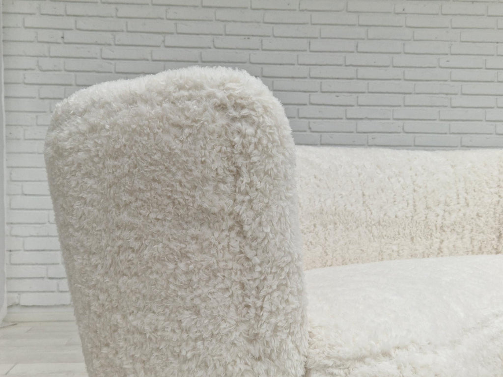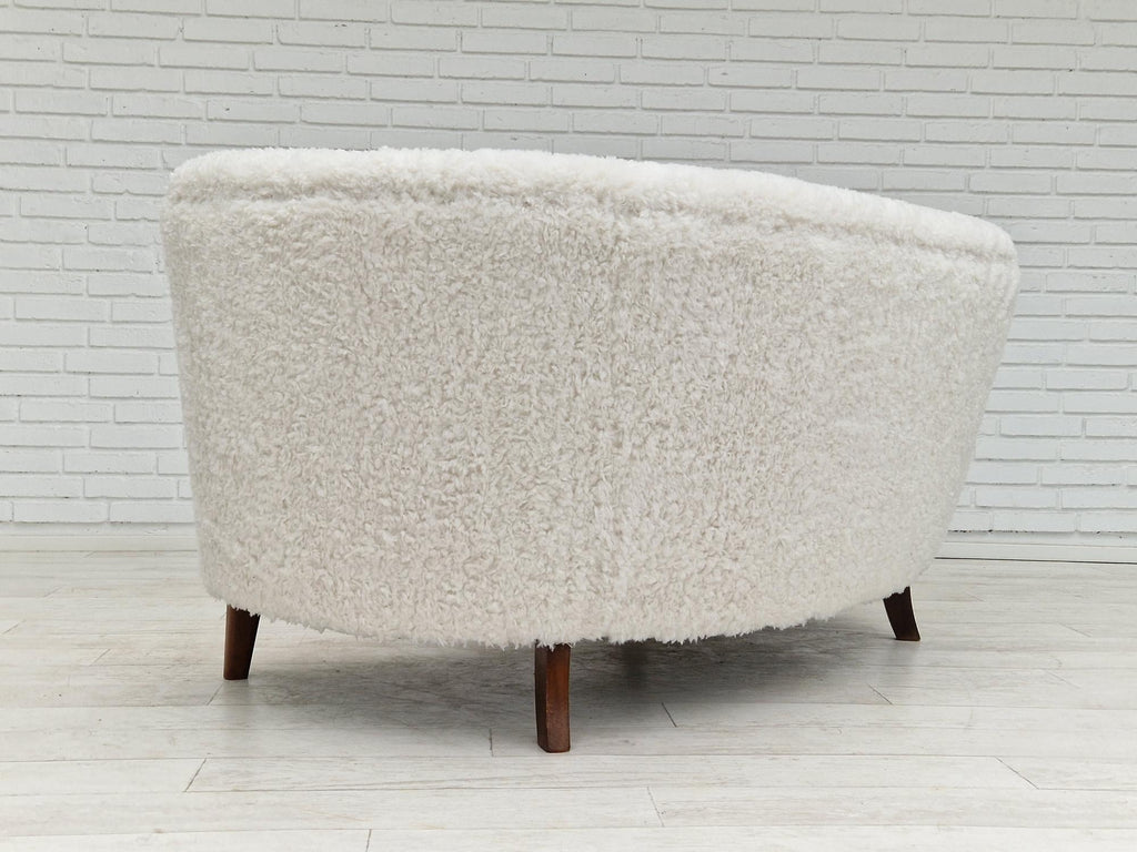 60년대, 덴마크 디자인. 리폼된 2인용 "바나나 소파". 품질 Nevotex 가구 양가죽 모방 "Ulrikke". 얼룩진 너도밤나무 다리. 원래 황동 스프링이 유지됩니다. 1960년경 덴마크 가구 제조업체에서 제조. 전문 가구 장식가, 장인이 개조했습니다.