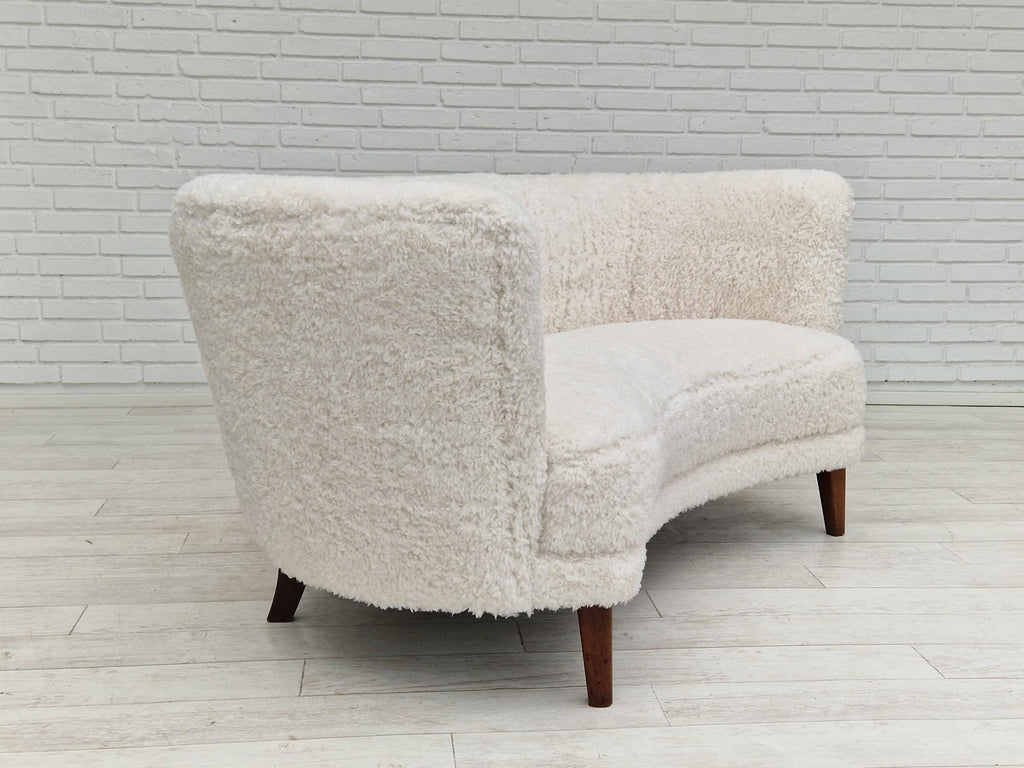 60s, Danish design, 2 seater banana sofa, refurbished, imitation furniture lambskin.