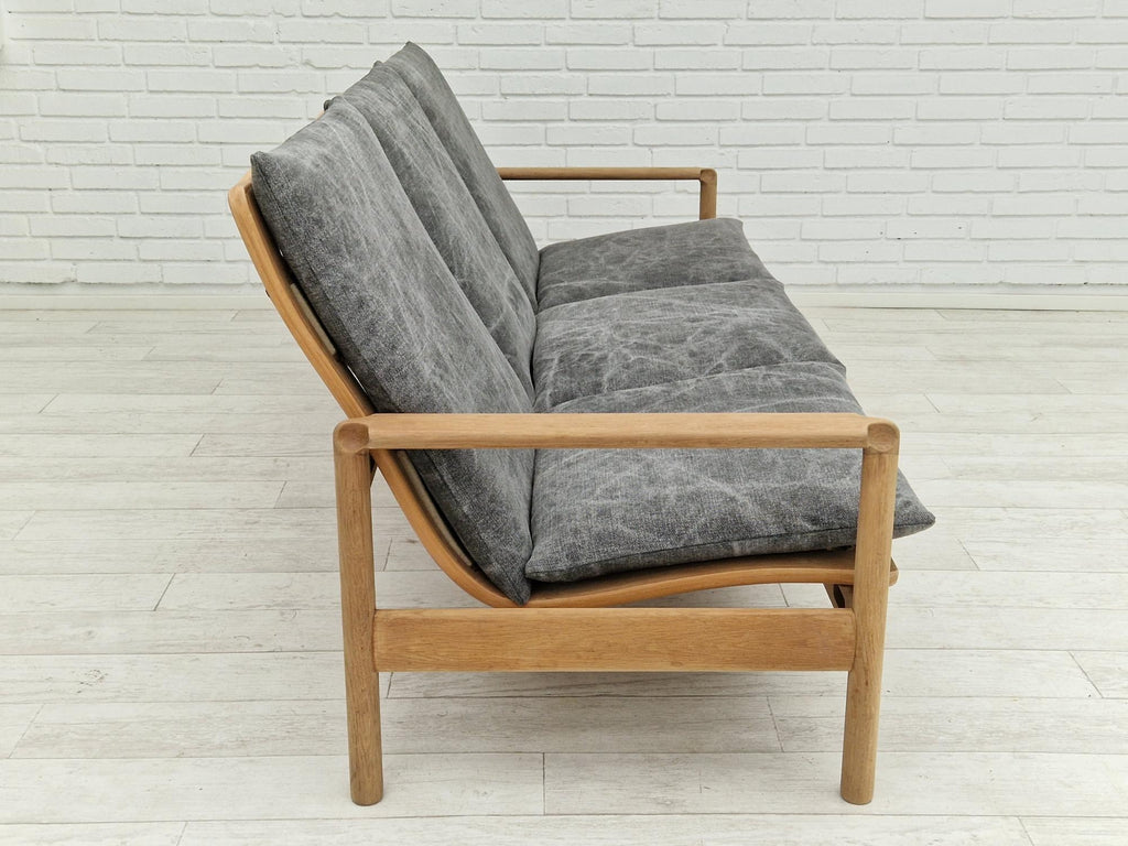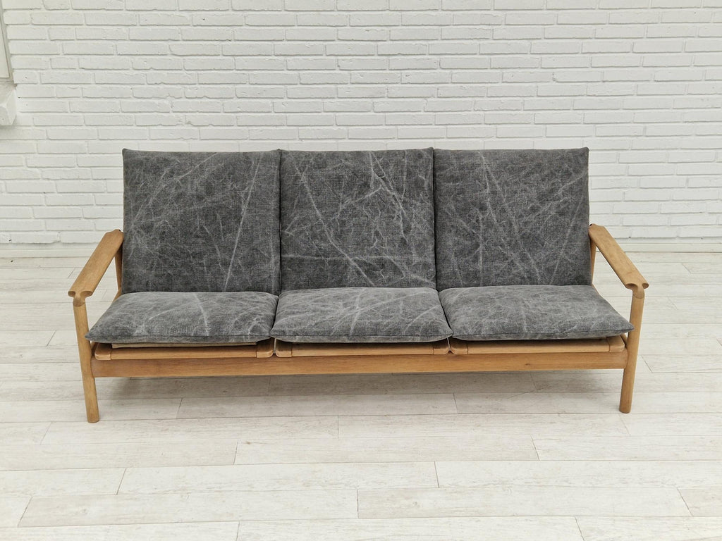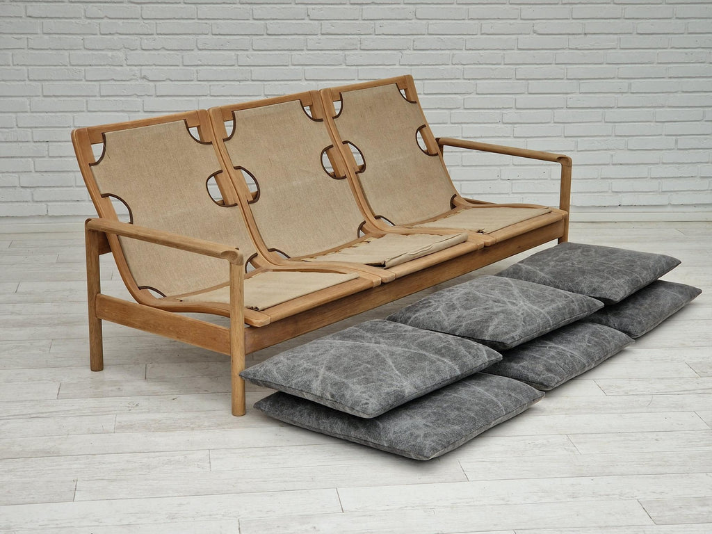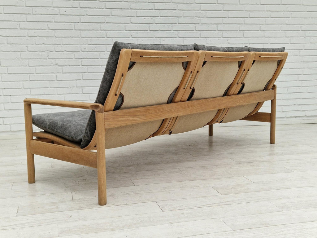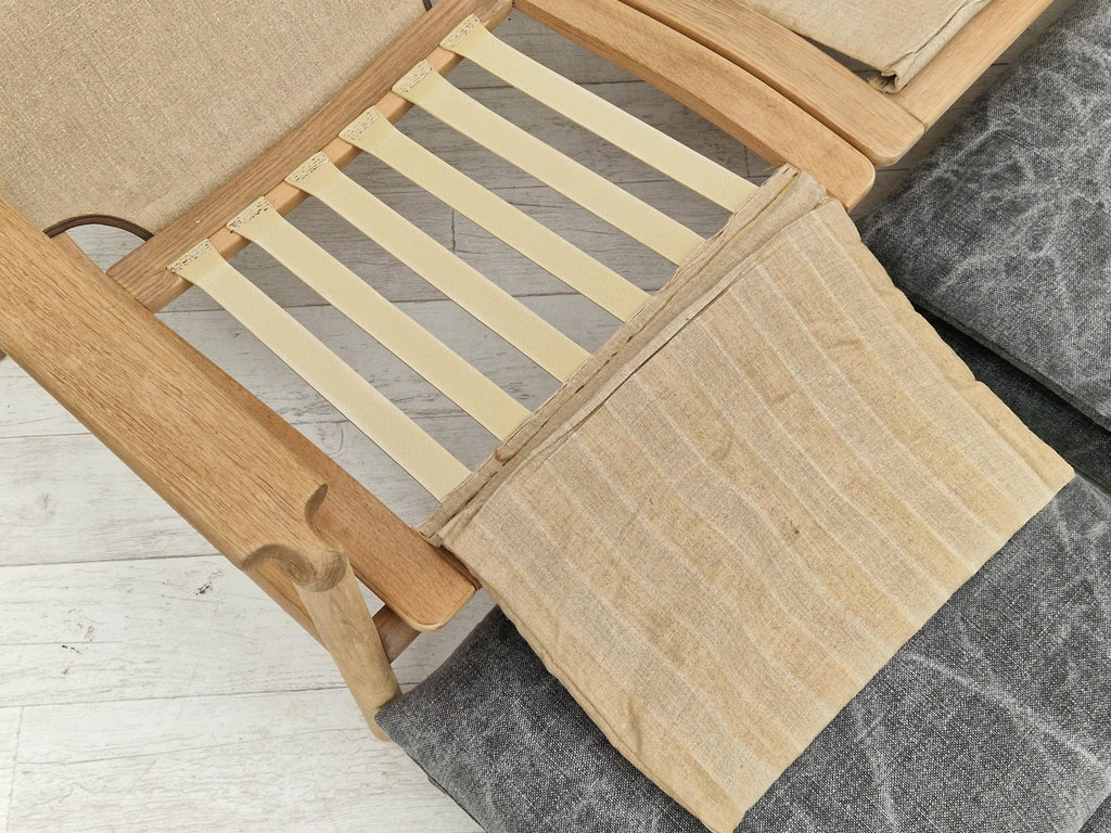 70s, Danish design, renovated 3 seater sofa, patinated linen furniture fabric, oak wood
