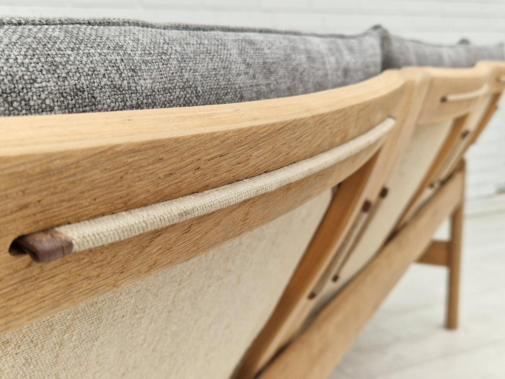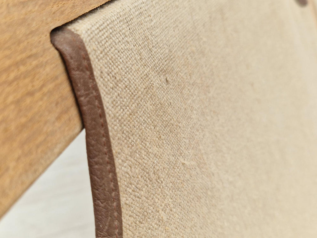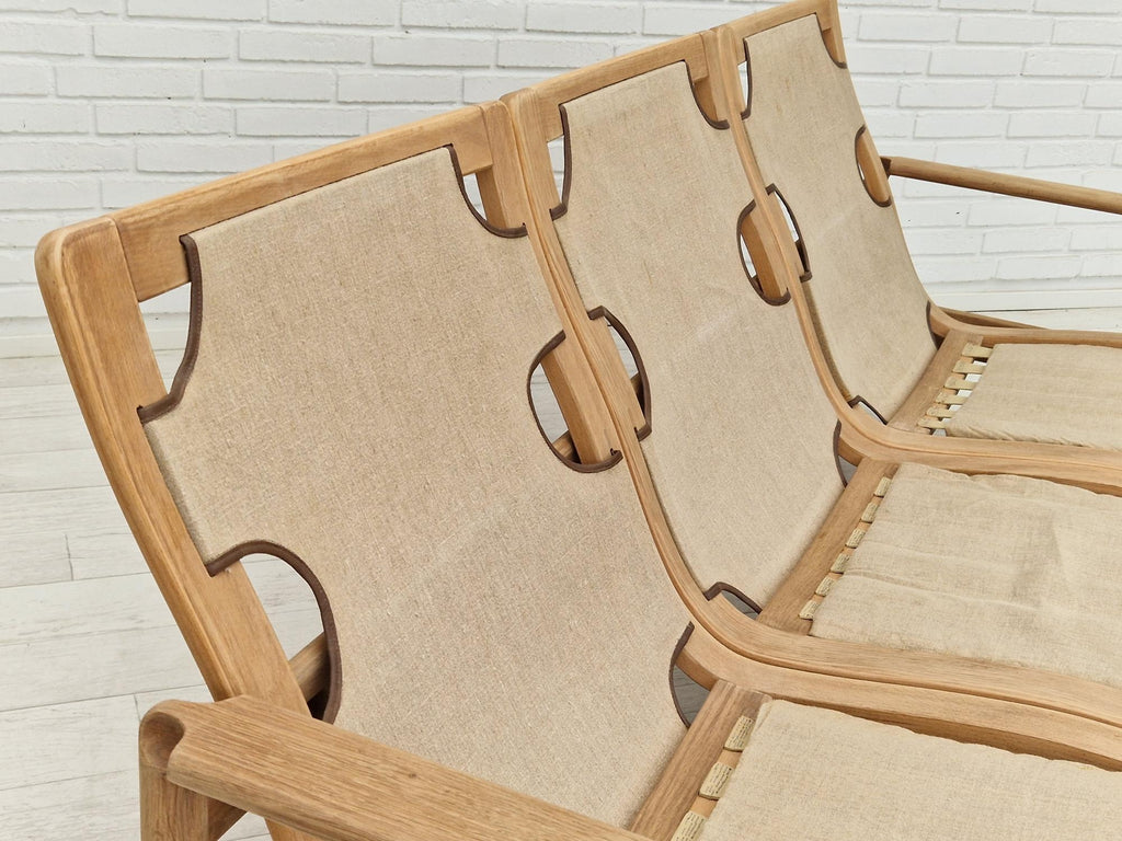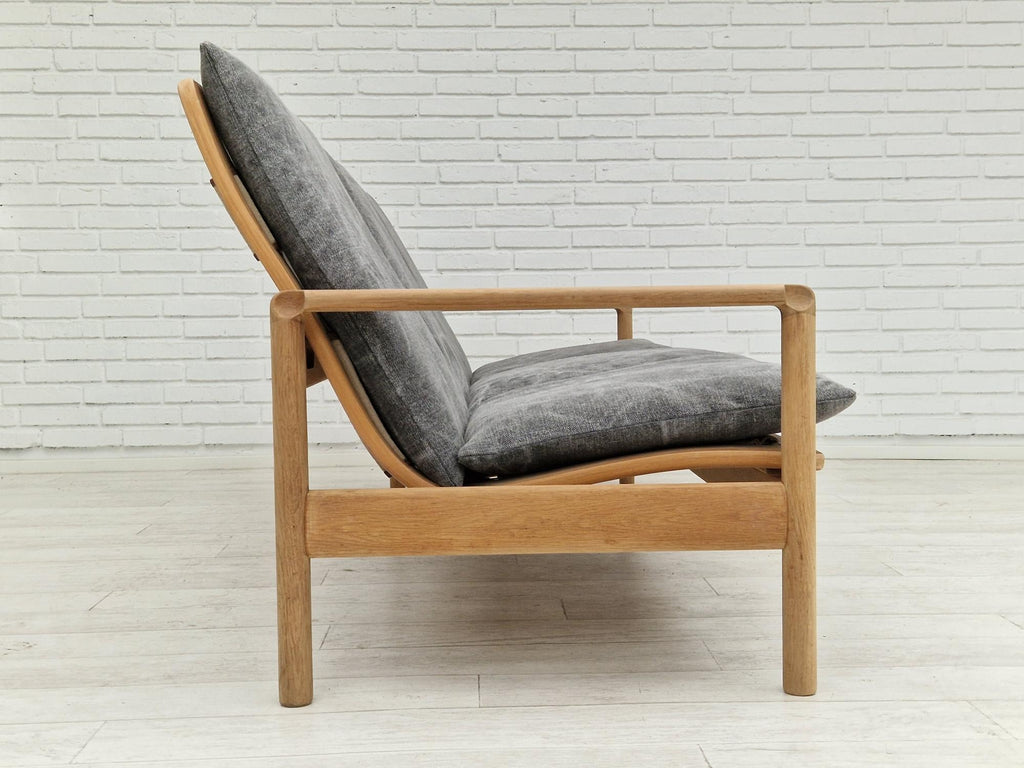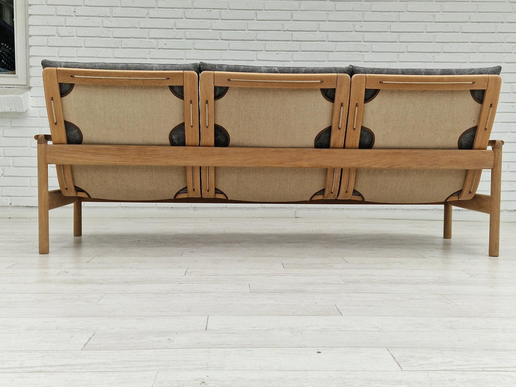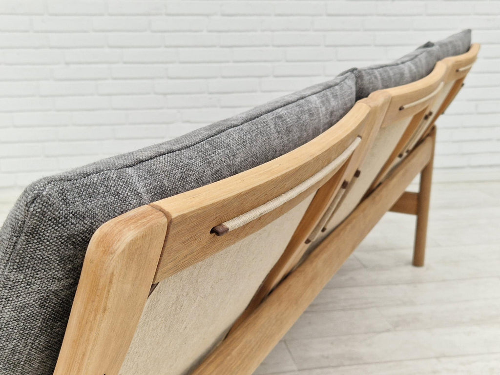 70s, Danish design, renovated 3 seater sofa, patinated linen furniture fabric, oak wood
