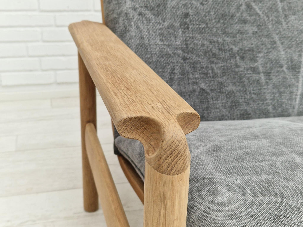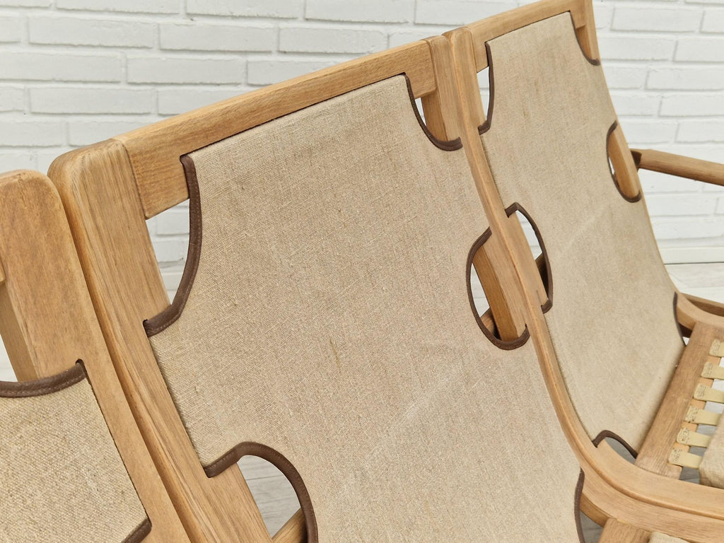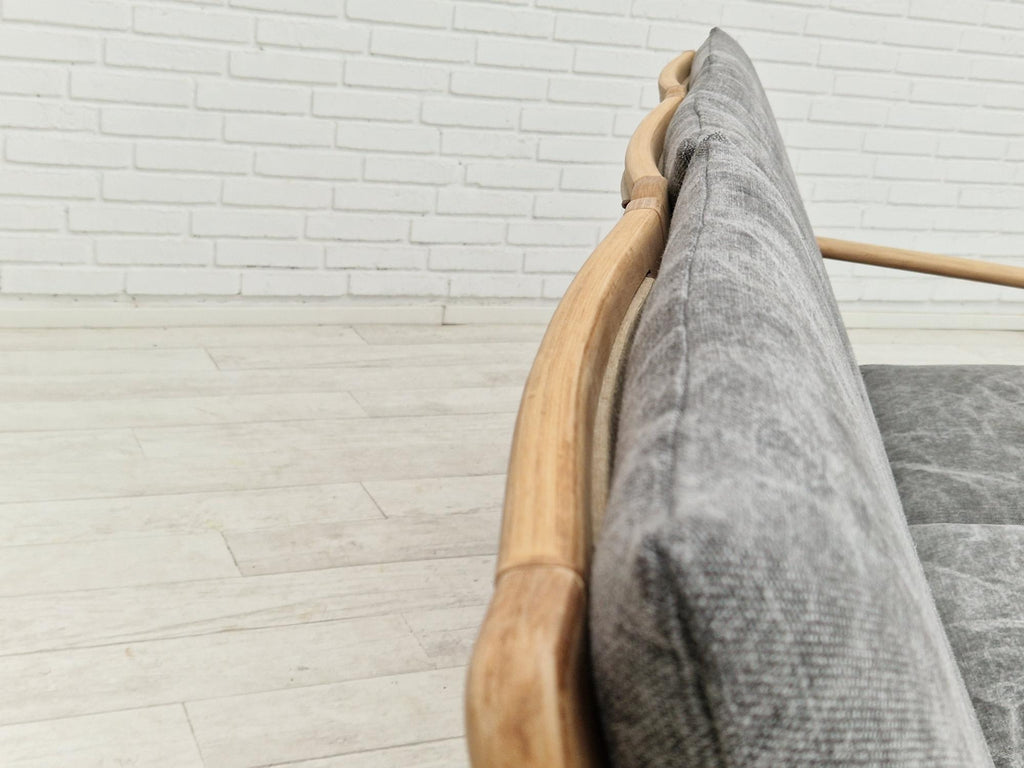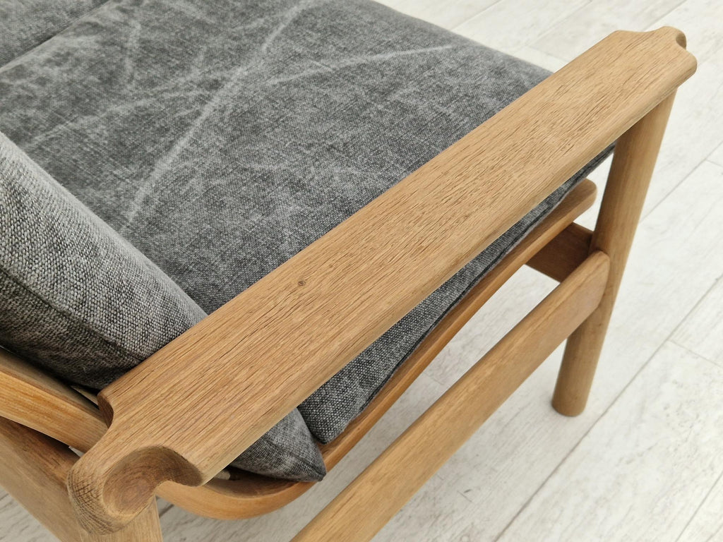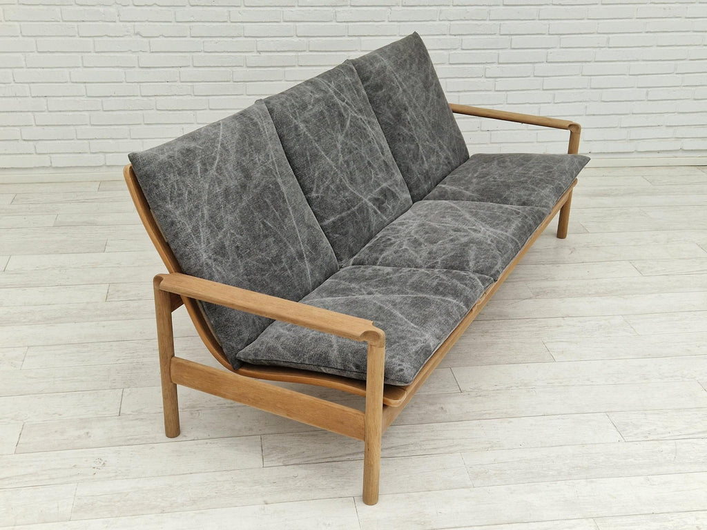 70s, Danish design, renovated 3 seater sofa, patinated linen furniture fabric, oak wood