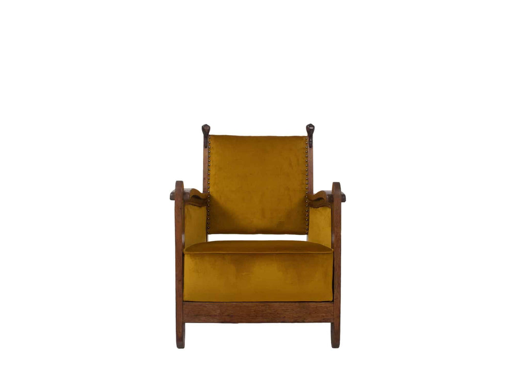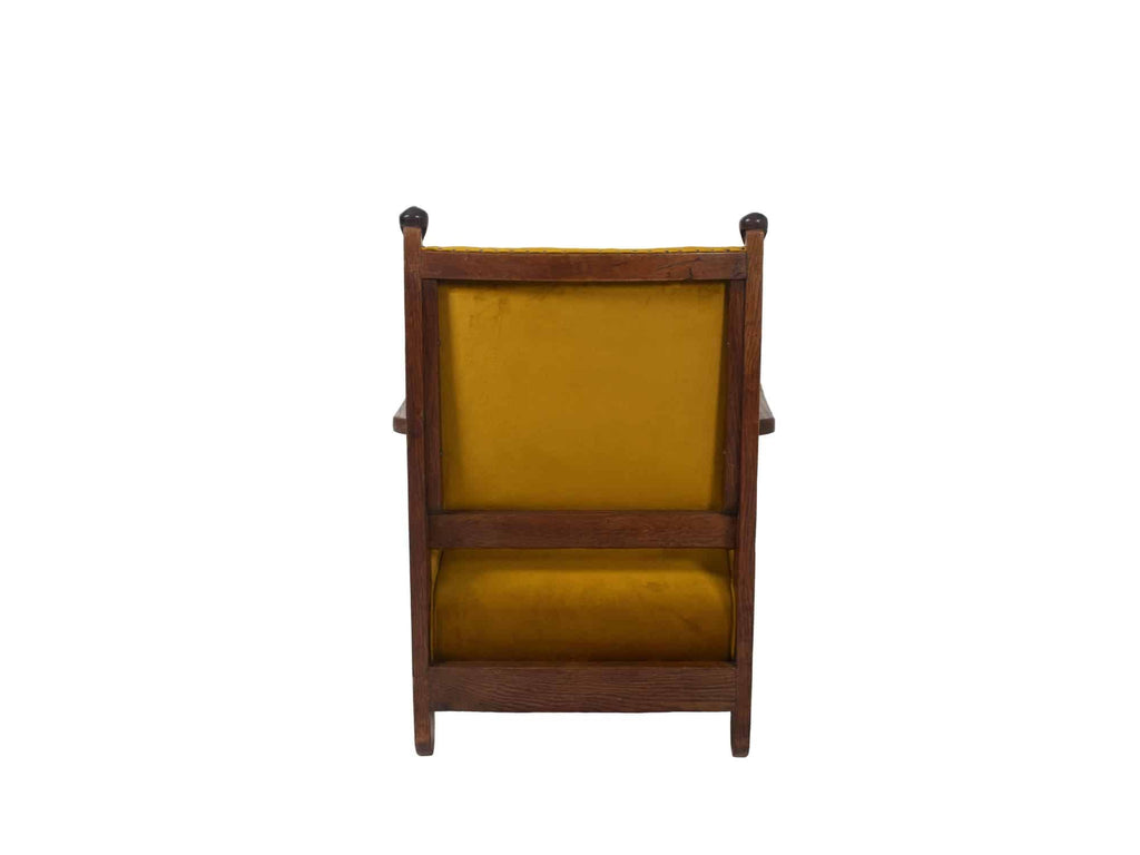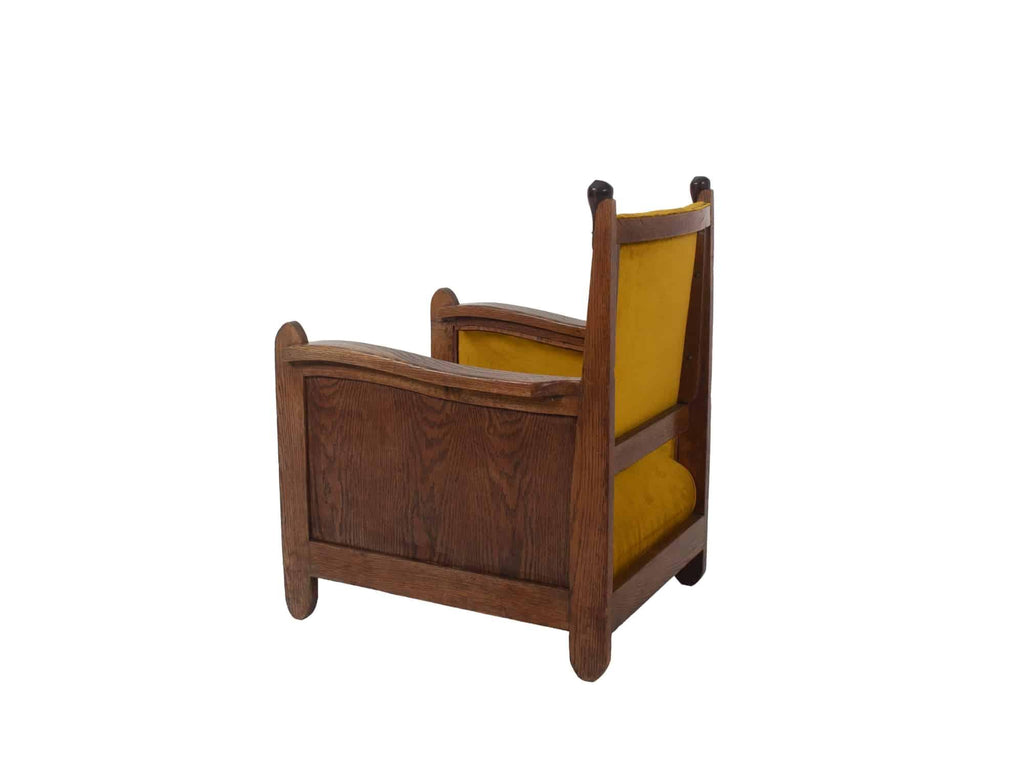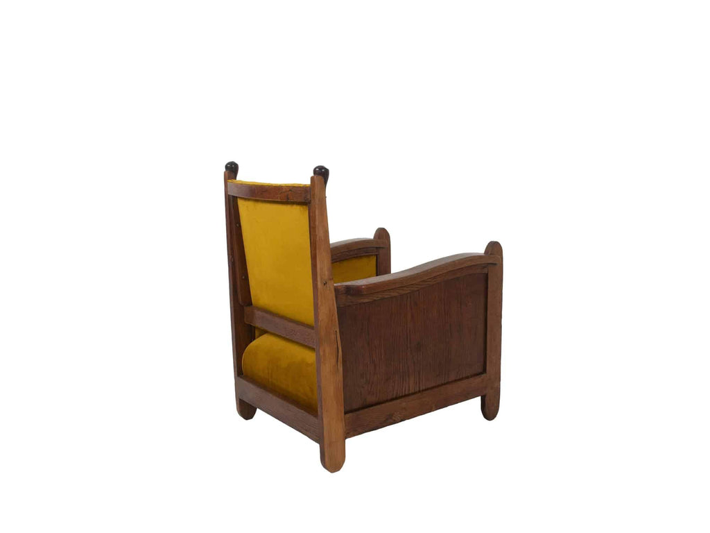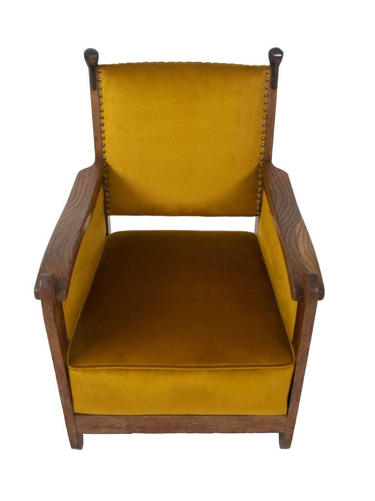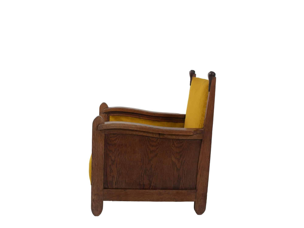 1930년대에 네덜란드에서 온 정말 놀라운 암스테르담 학교 안락의자. 이 의자는 오크 나무와 코로만델 나무로 아름답게 물드는 골드 옐로우 패브릭으로 새롭게 덮개를 씌웠습니다.