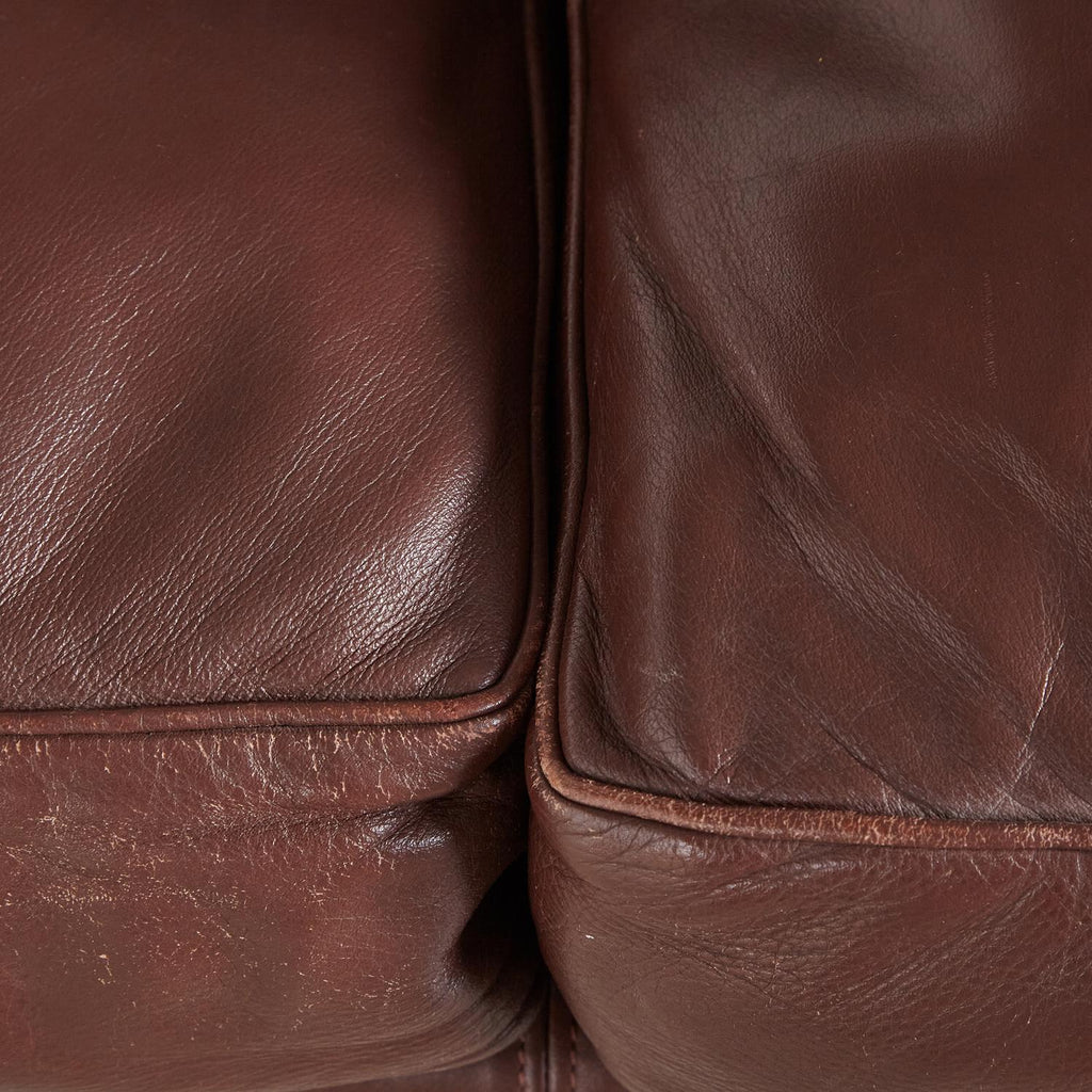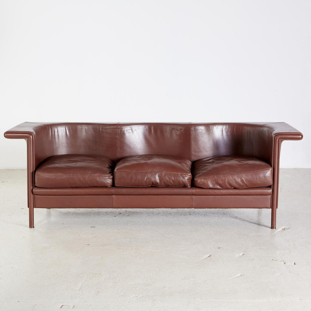 갈색 가죽 덮개를 씌운 하키 3인용 소파.