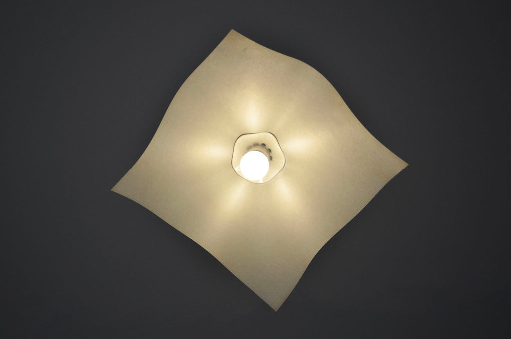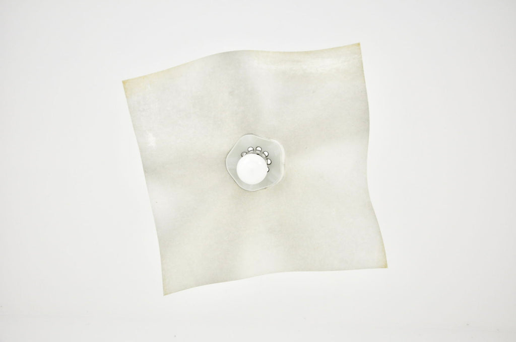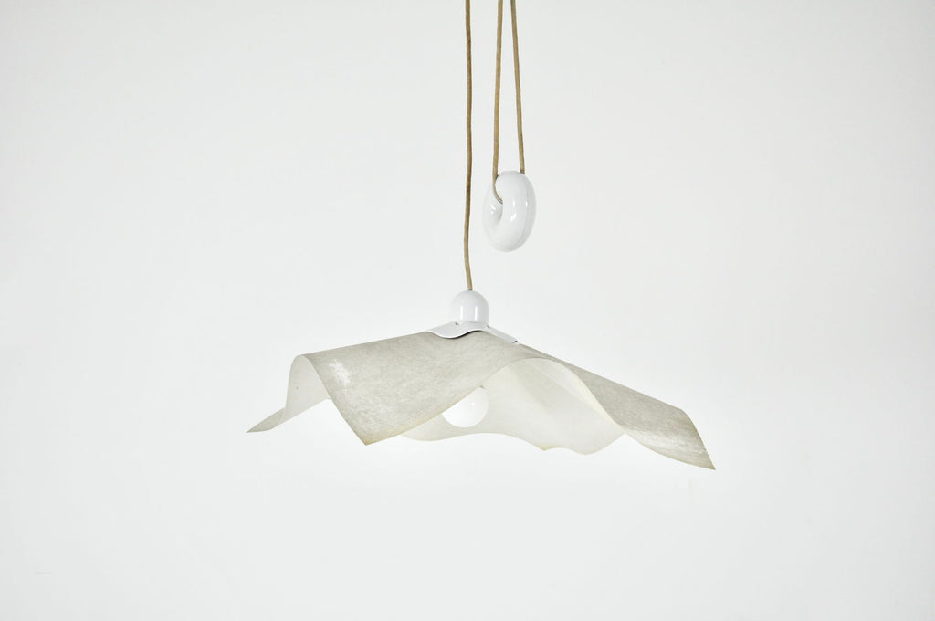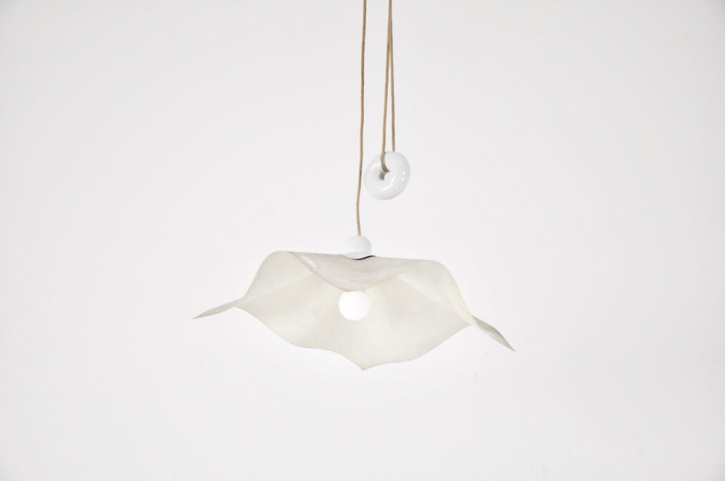 Paper and plastic hanging lamp by Mario Bellini with doughnut-shaped counterweight, model: Area 50. Easily adjustable in height. Minimum height with wedge: 100 cm, maximum height with cable: 260 cm. Wear due to time and age.