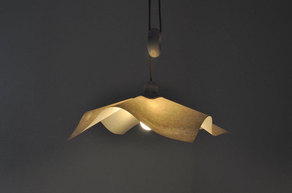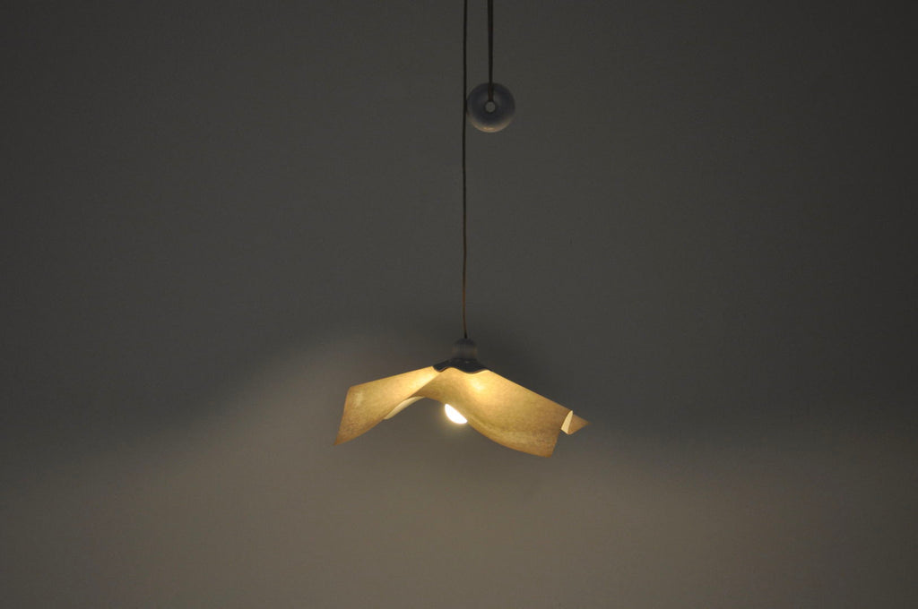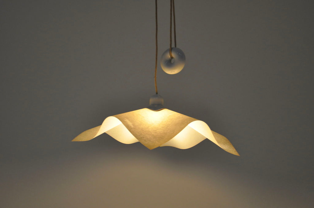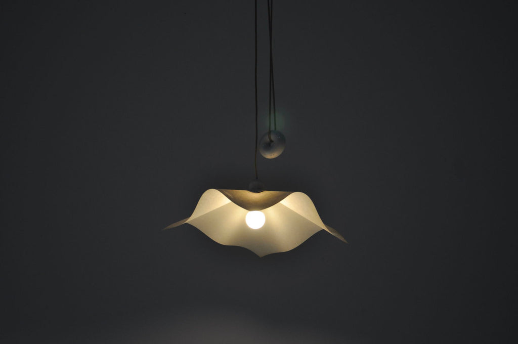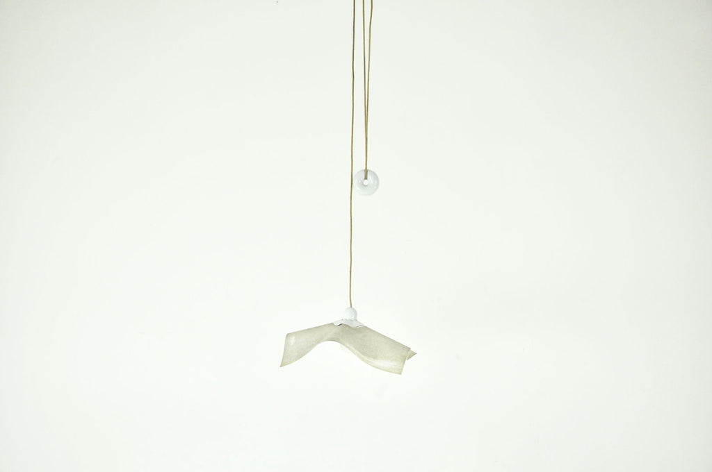 도넛 모양의 균형추를 갖춘 Mario Bellini의 종이 및 플라스틱 걸이 램프, 모델: Area 50. 높이를 쉽게 조절할 수 있습니다. 웨지 포함 최소 높이: 100cm, 케이블 포함 최대 높이: 260cm. 시간과 나이로 인한 마모.