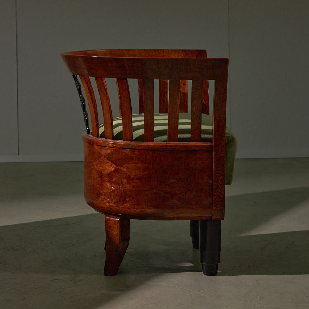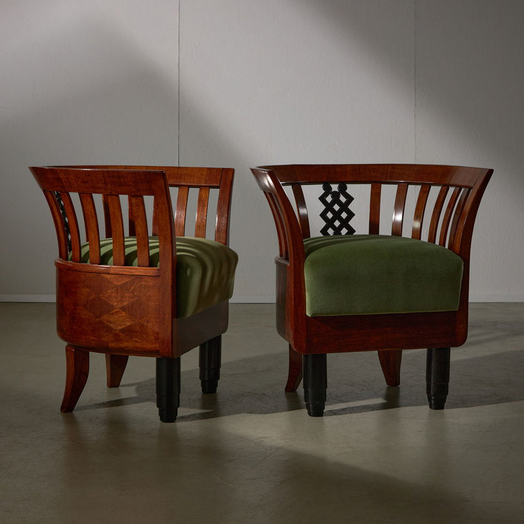 This striking duo features green velvet upholstery and intricate decorative accents. The wooden detailing on the back adds a touch of whimsy, while the elaborate carvings and shapes on the legs showcase expert craftsmanship. In addition to their visual appeal, these chairs offer exceptional comfort. They are in very nice vintage condition with small signs of age and use, and one of the chairs has a little gap in the wooden part, as shown.