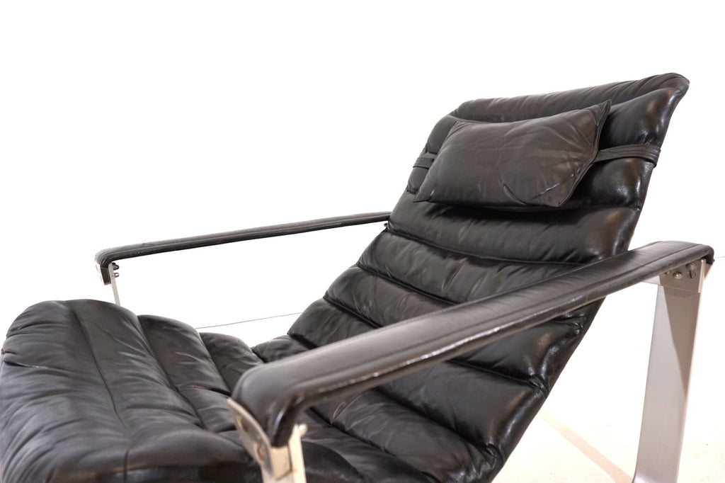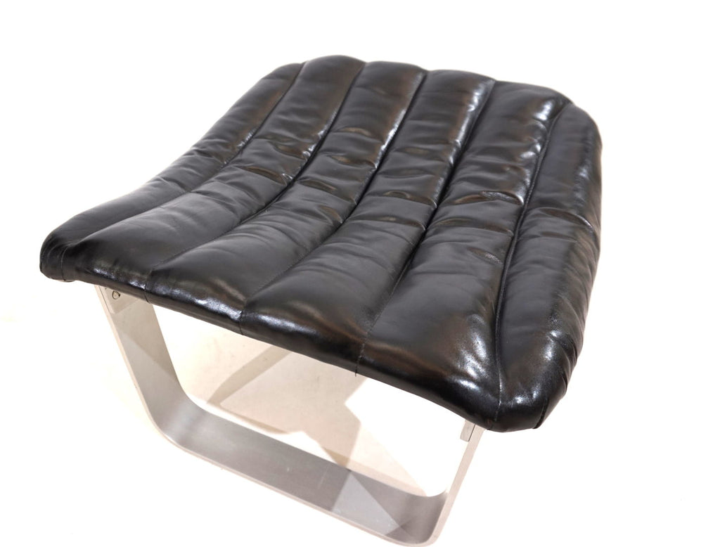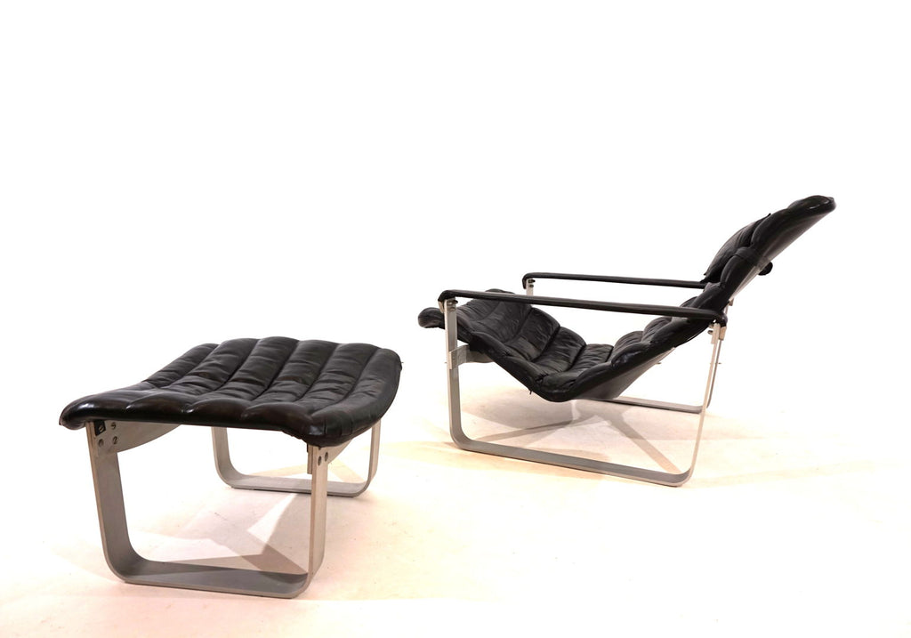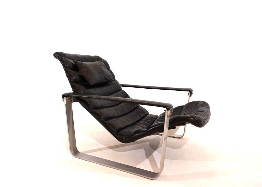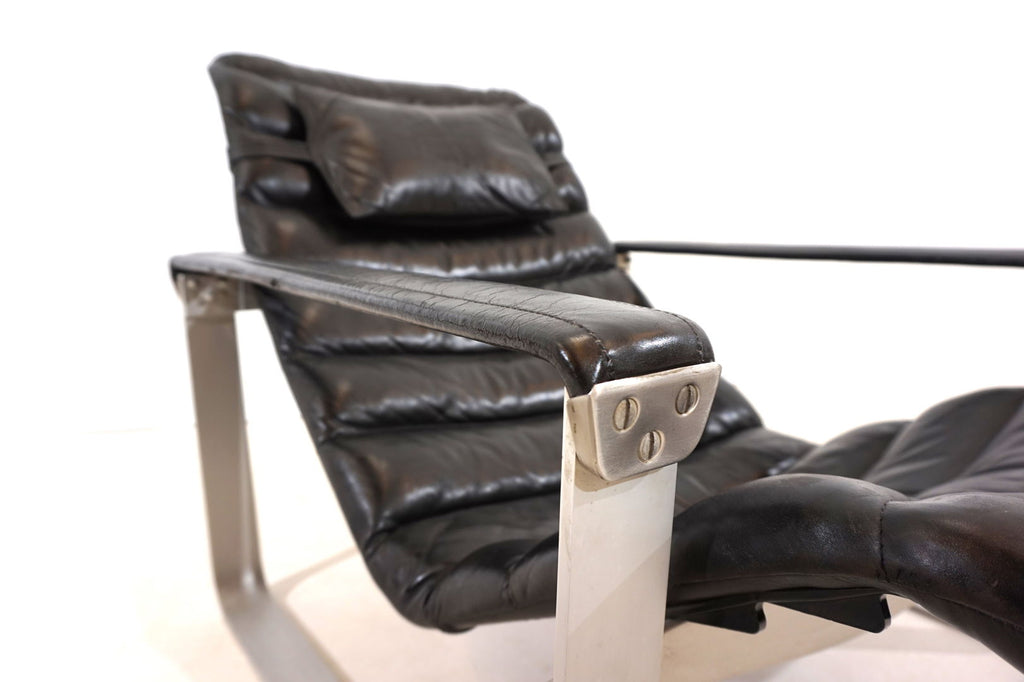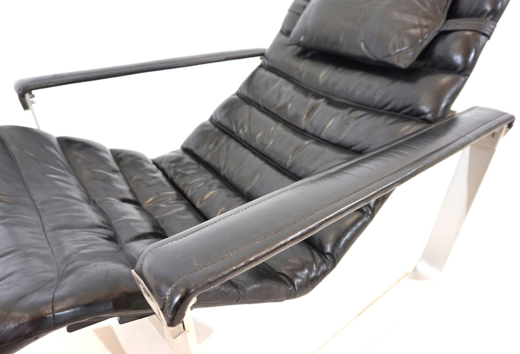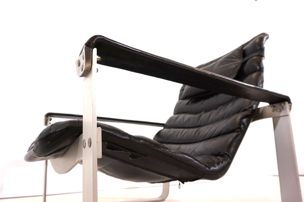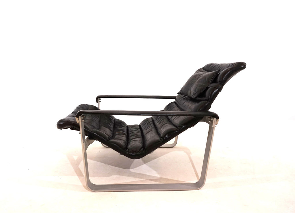 The Asko Pulkka leather armchair in black leather is, like the ottoman, in very good condition. The leather is soft and undamaged, the seams are all in good condition. The seat shell of the armchair rests on an aluminum frame and is multi-adjustable. The frame shows minimal signs of wear. In combination with the ottoman, the Pulkka armchair offers a fantastic sitting experience.