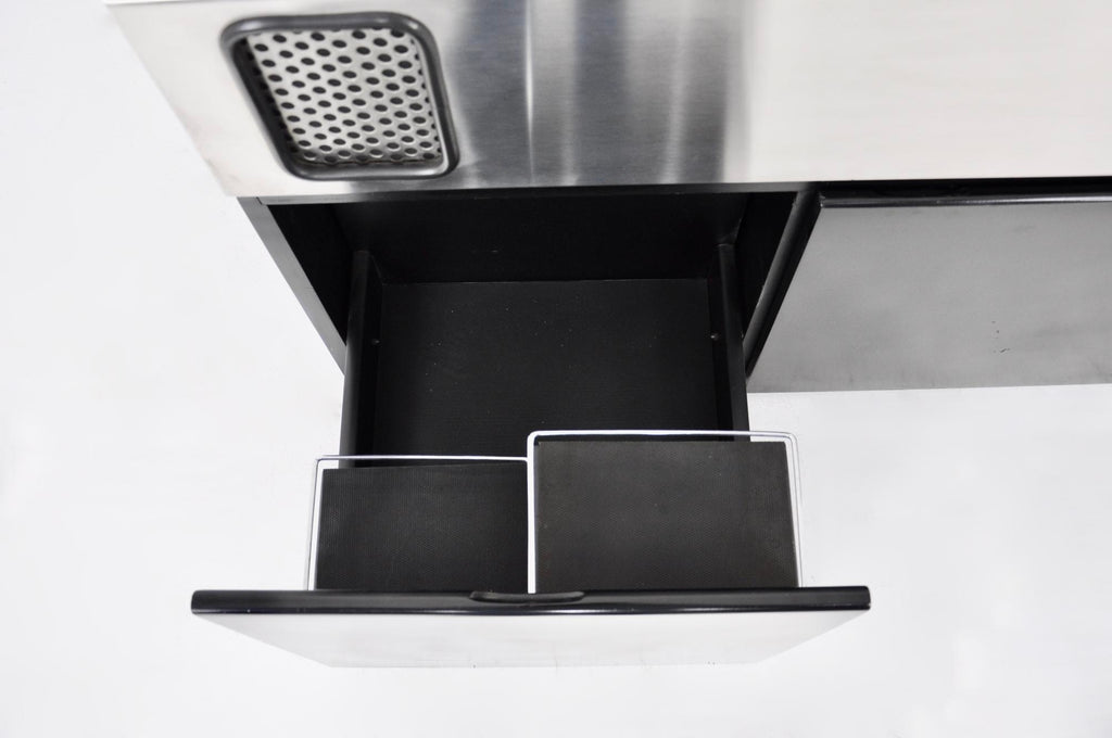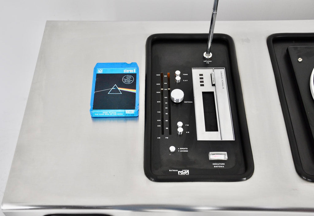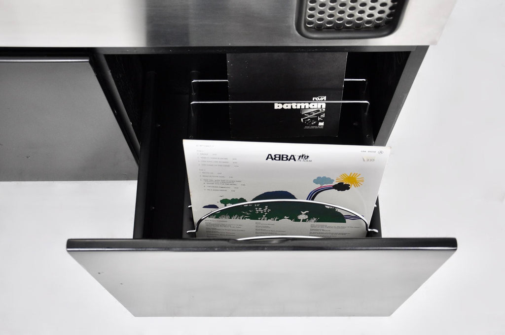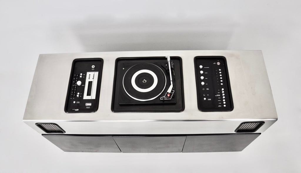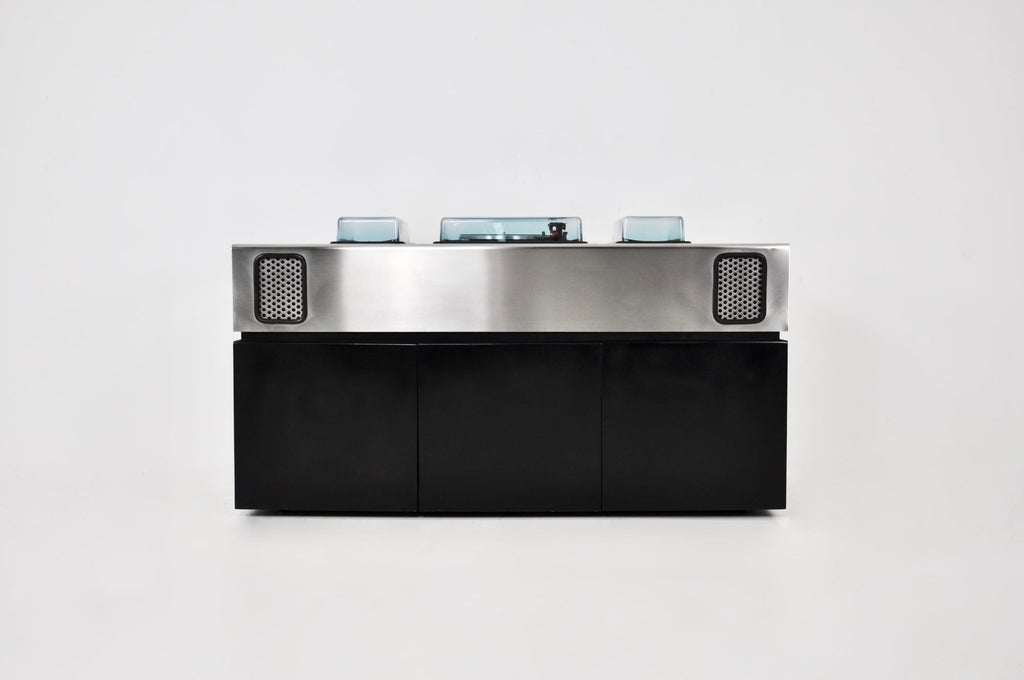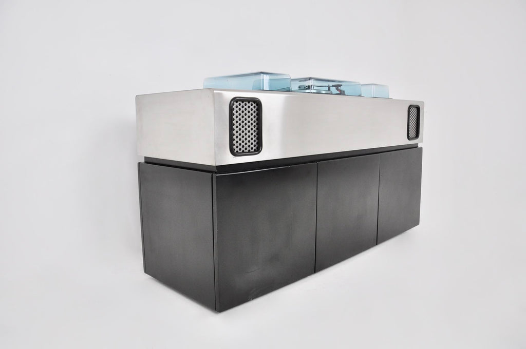 Giuseppe Rossi를 위한 Adalberto dal Lago & Adam Tihany의 배트맨 레코드 플레이어, 라디오, 바. 상단은 스피커가 통합된 브러시드 크롬 메탈이고 하단은 블랙 우드입니다. 중간에 2개의 수납서랍과 냉장고가 있습니다. 각인된 배트맨 Giuseppe Rossi. 8트랙용 카세트 플레이어, 라디오 및 레코드 플레이어가 있습니다. 모든 것이 완벽하게 작동하고 모든 것이 서비스되었습니다(서비스 인증서 포함). 시간과 노후로 인한 마모.