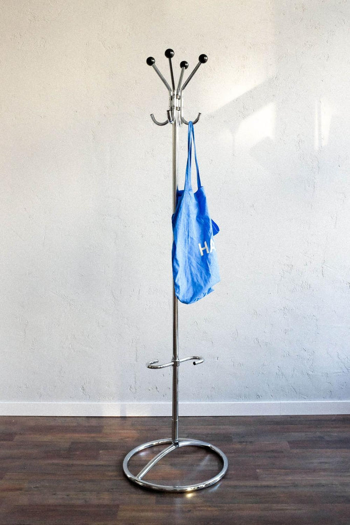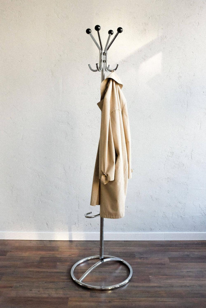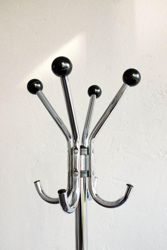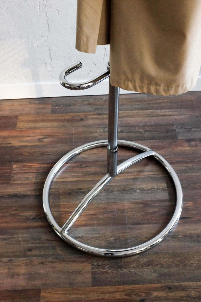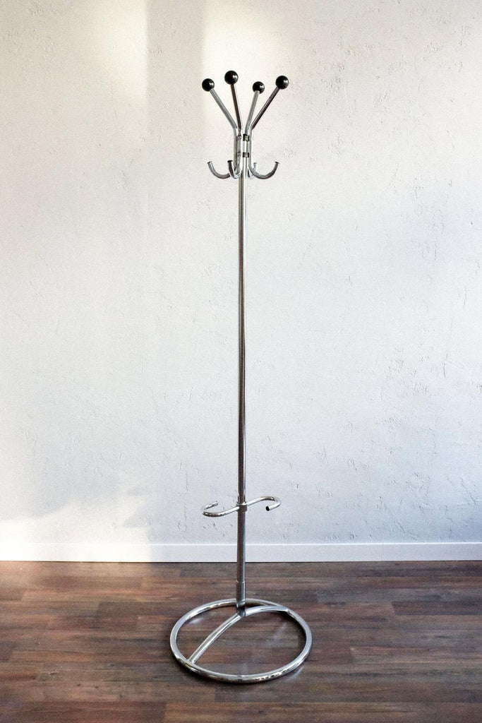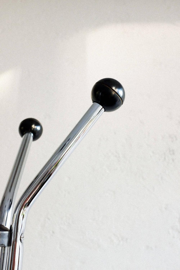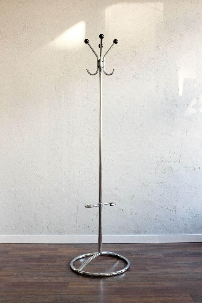 30년대 Hynek Gottwald가 디자인한 Bauhaus 크롬 도금 코트 랙. 끝 부분에 둥근 팁과 우산 홀더가 있는 풀 크롬 구조가 특징입니다. 깨끗하고 광택이 나는 아주 좋은 원래 상태입니다. 사진에 보이는 파티나.
