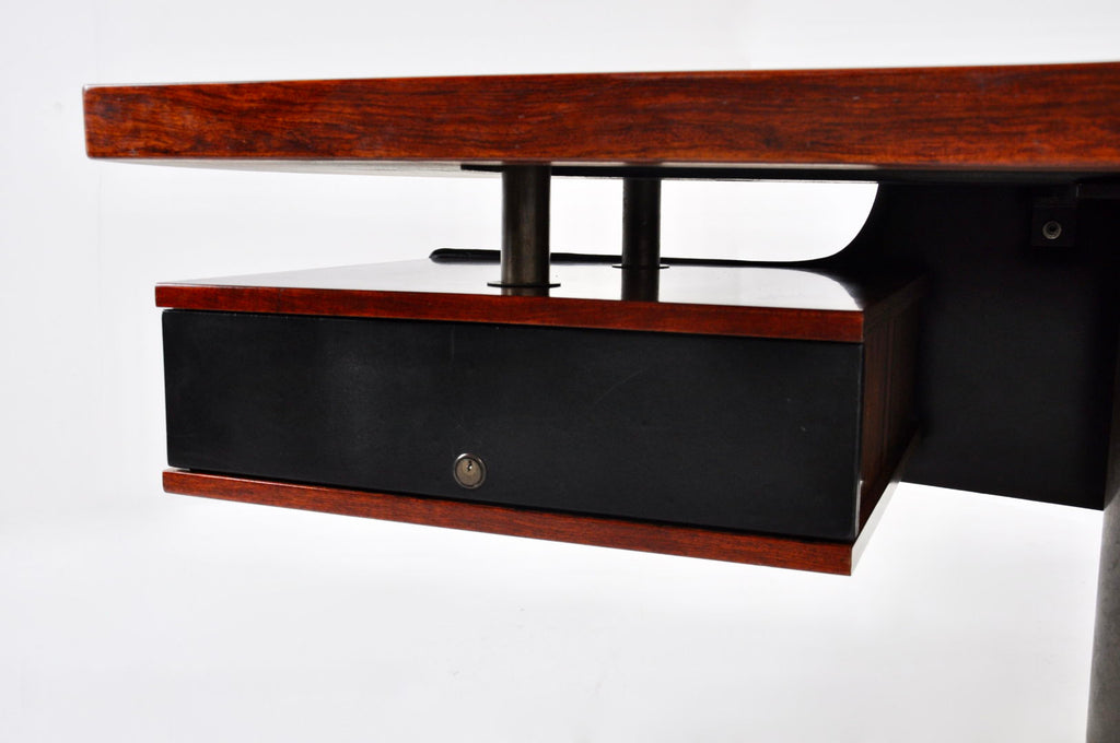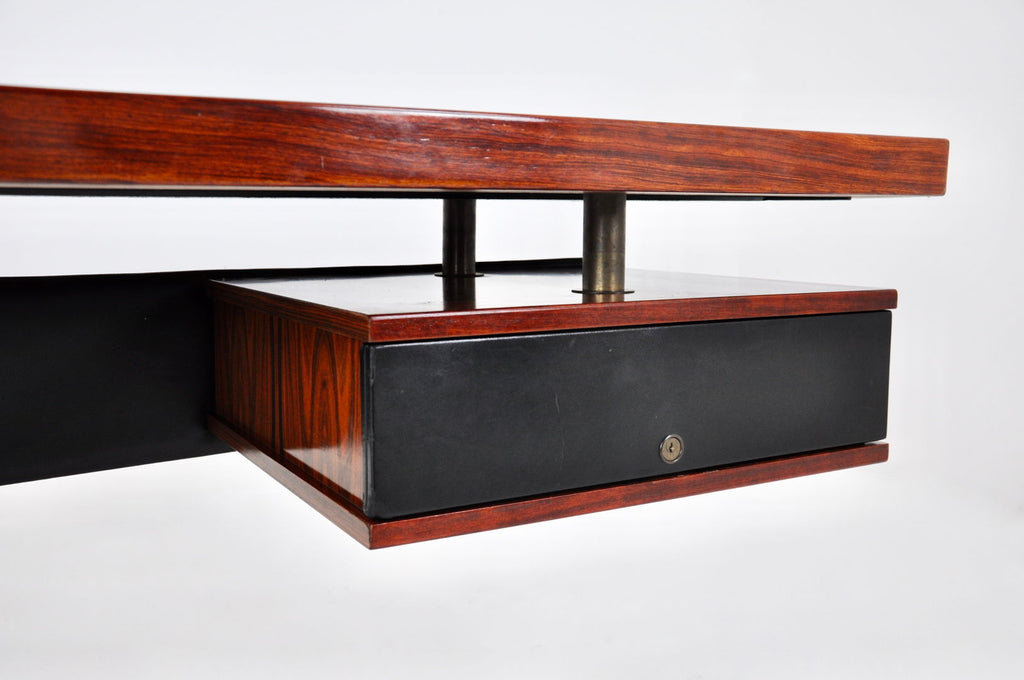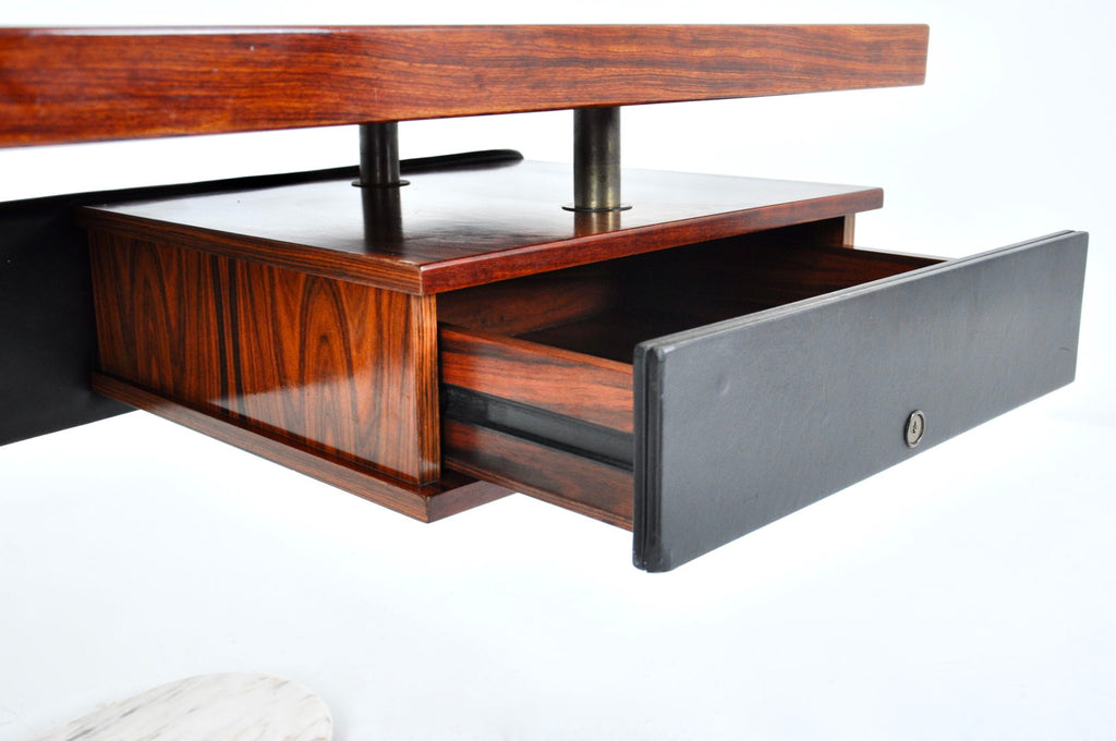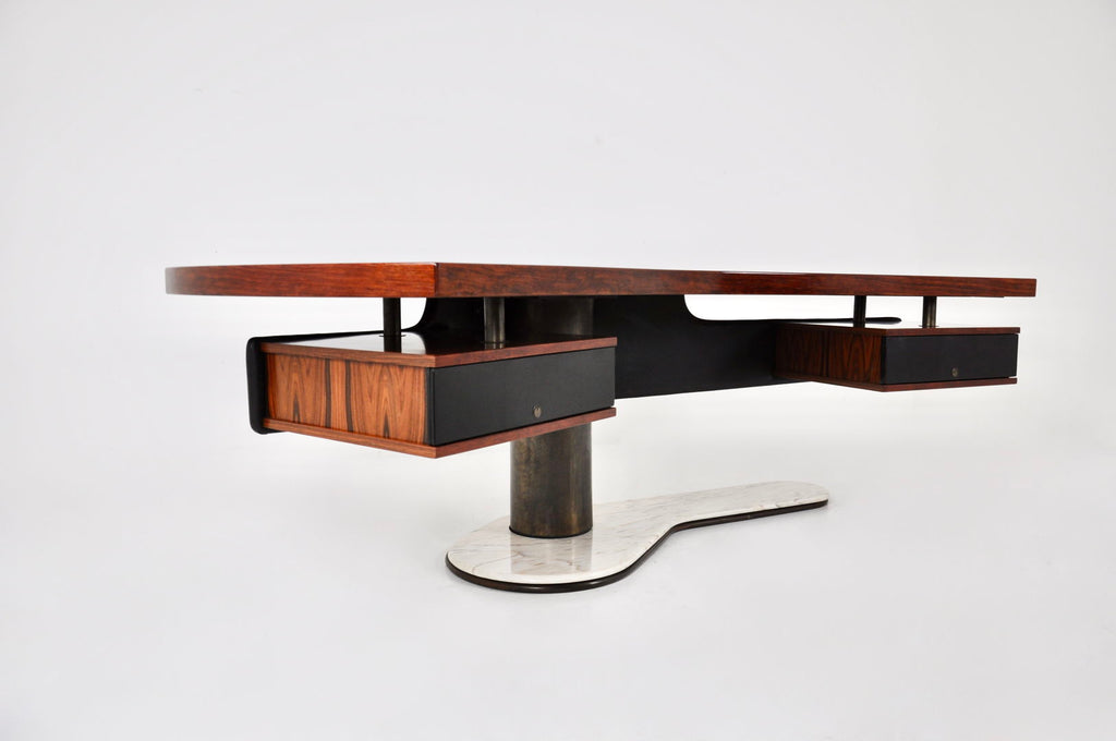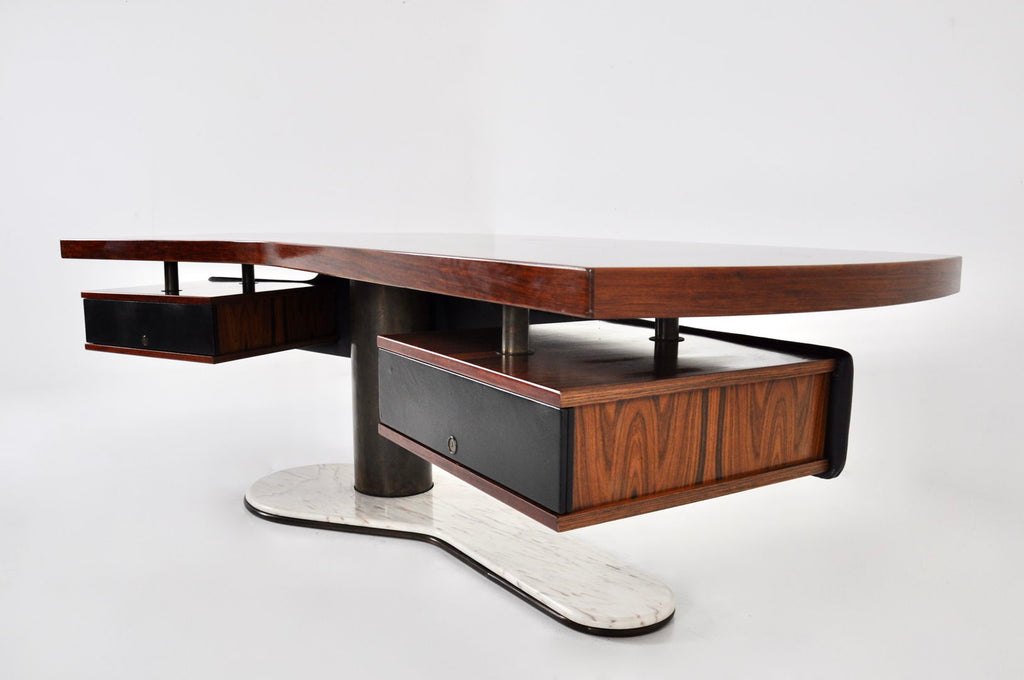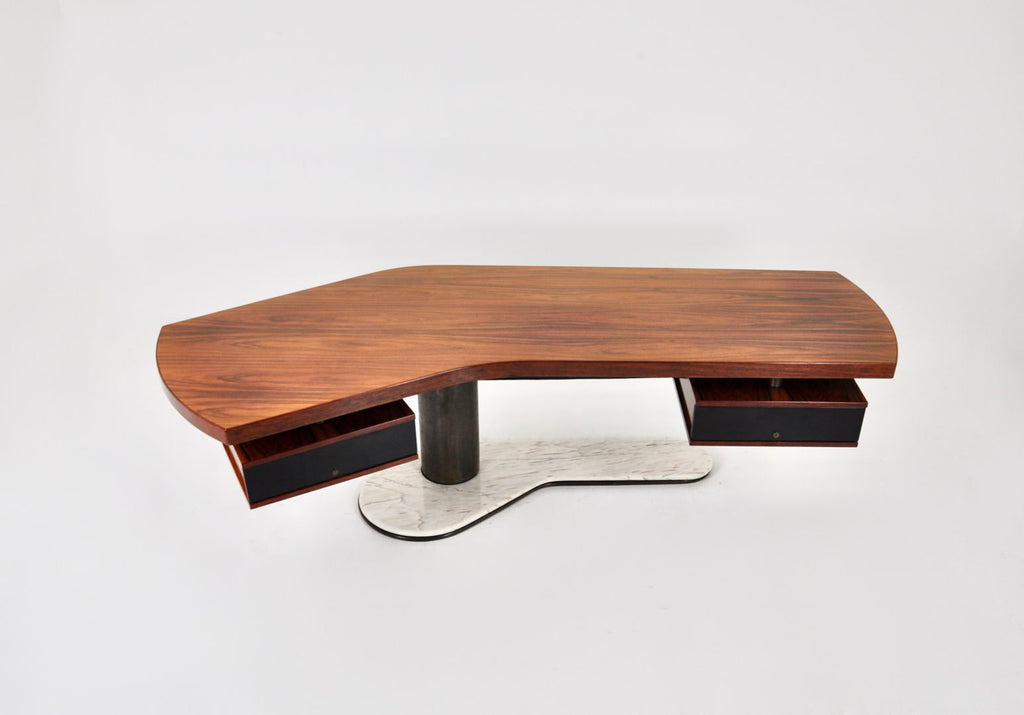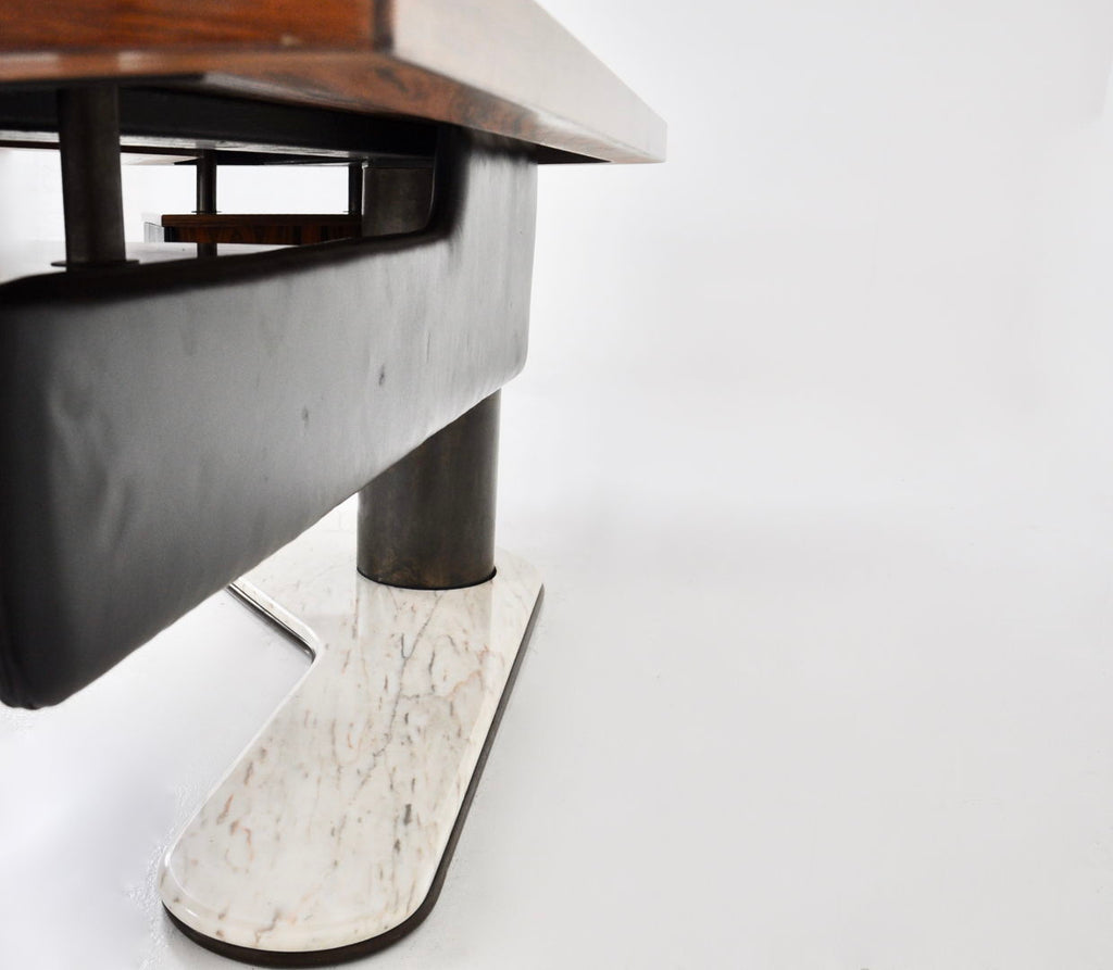 Incredible boomerang desk with floating leather back panel and wooden and leather drawers. The leg of the desk is made of marble. Wear due to time and age of the desk