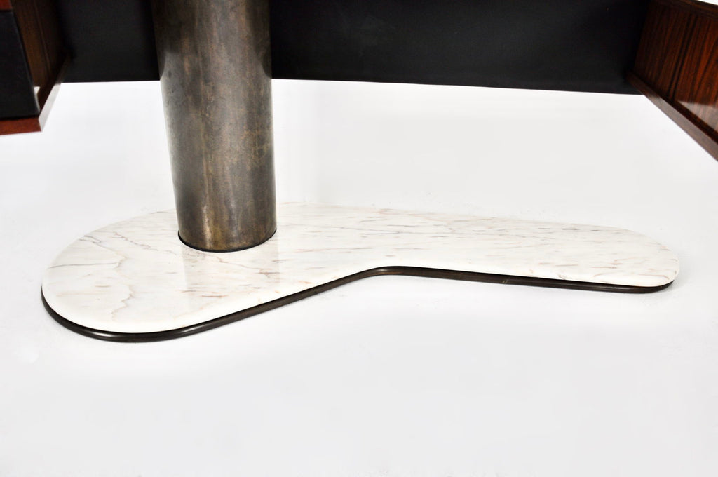 떠다니는 가죽 후면 패널과 나무 및 가죽 서랍이 있는 놀라운 부메랑 책상입니다. 책상다리는 대리석으로 되어있습니다. 책상의 시간과 노후로 인한 마모