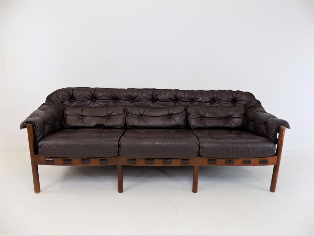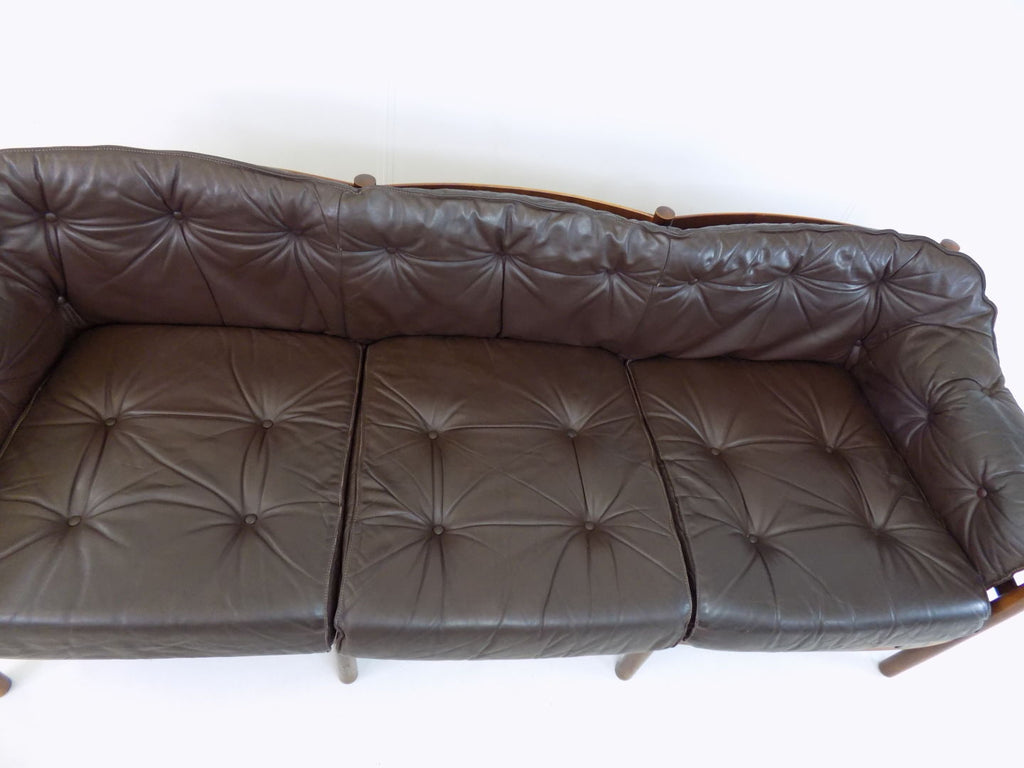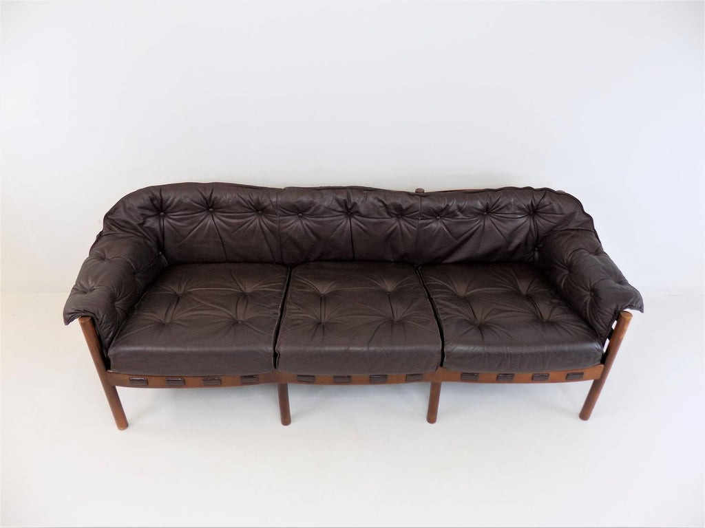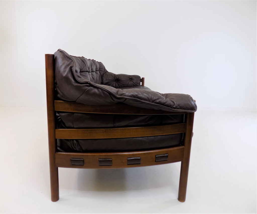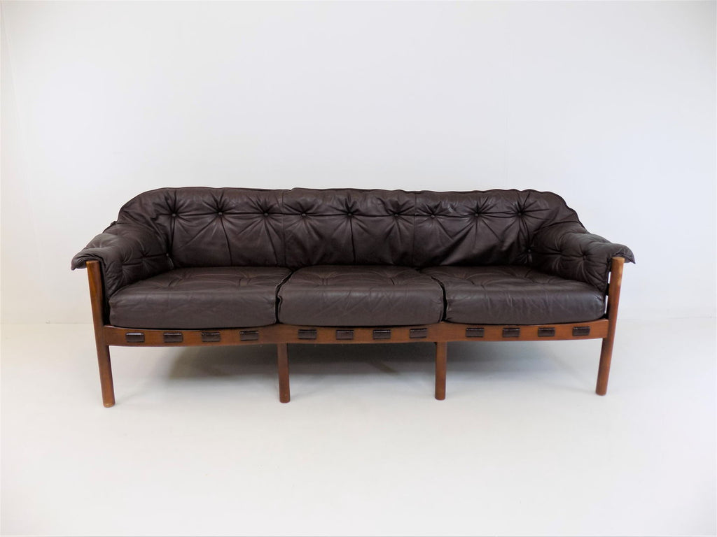 Excellent condition 3 seater leather sofa by the Swedish designer Sven Ellekaer. The chocolate brown leather is in excellent condition. The wooden frame has a beautiful color that harmonises with the leather and shows minimal signs of wear. The suspension of the sofa is almost new and offers first-class seating comfort in a classic from the 1960s.