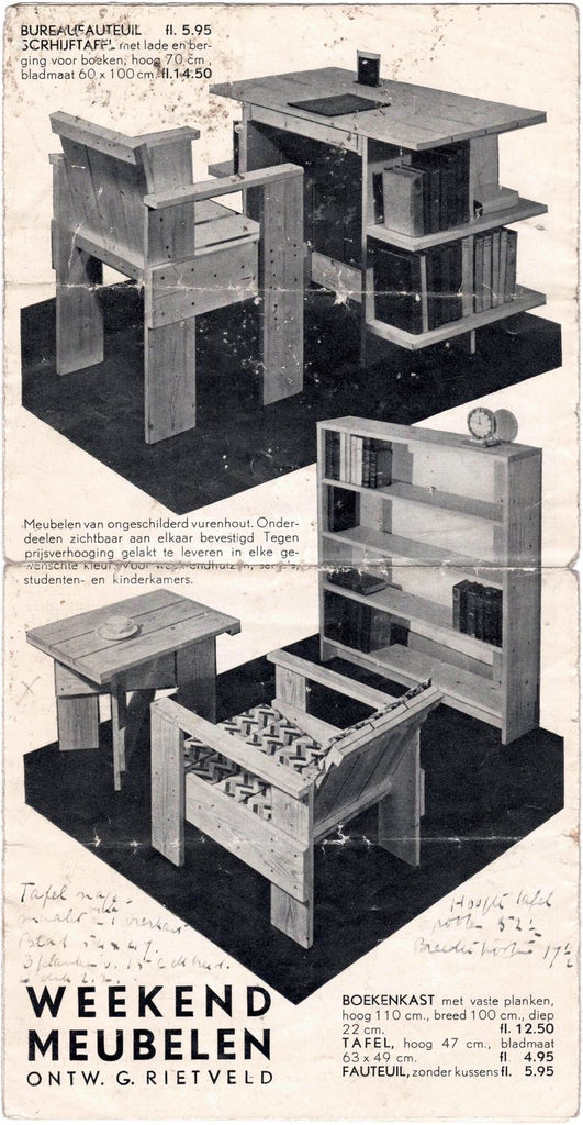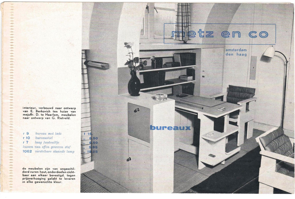 'Gerrit Rietveld'는 곧 '크레이트 가구'로 잘 알려진 표준화된 소나무 판자로 제작된 가구 '크레이트' 시리즈를 디자인했습니다. '1935년부터 Metz & Co에서 진보적인 디자인이 나타났습니다. 그곳에서 Rietveld의 가구는 이미 1930년부터 판매되었습니다. 상자 책상도 전쟁 전 이 시기의 것입니다.