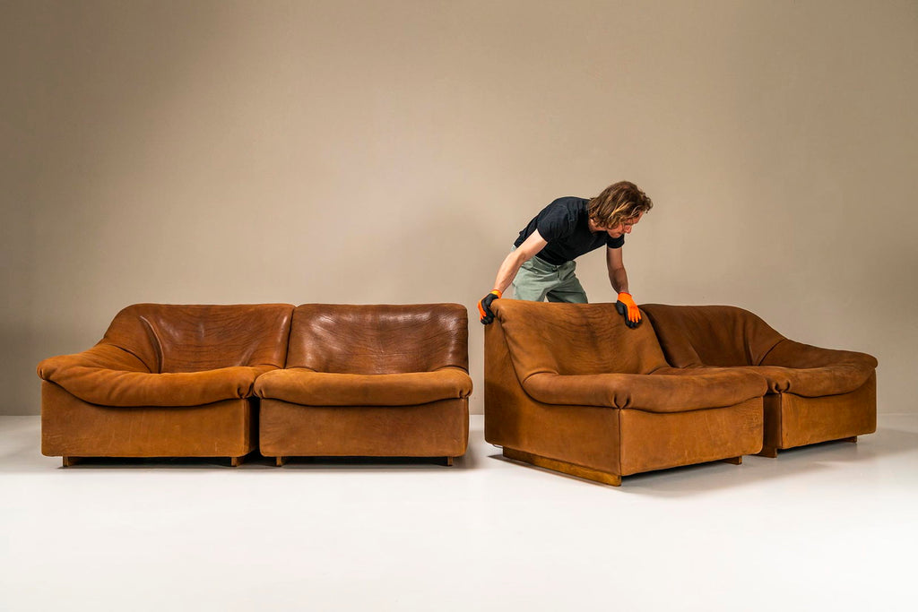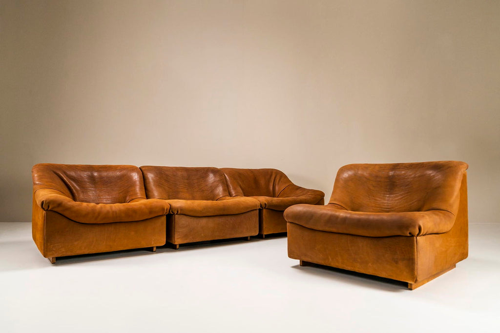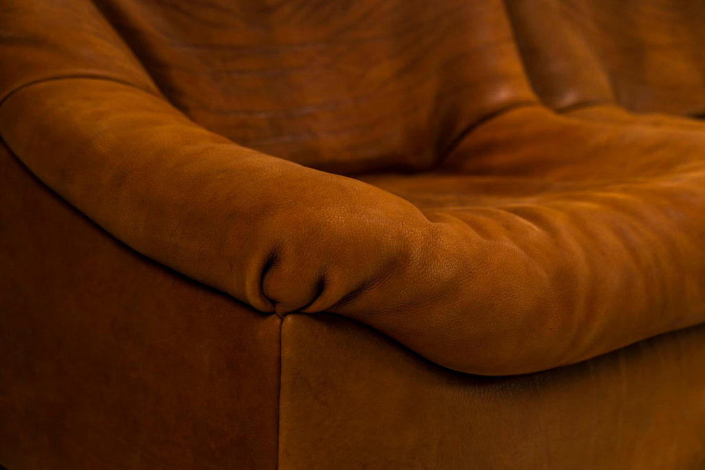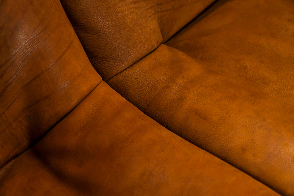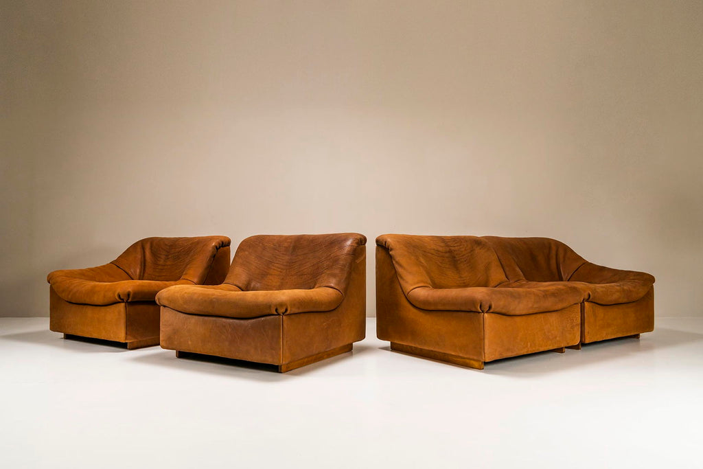 De Sede DS46 sectional sofa in cognac buffalo neck leather.In addition to pleasant seating comfort, this design classic by De Sede also has the allure of a statement piece. The Swiss brand is known for its bulky and eye-catching designs without making any compromises when it comes to quality. This set is a good example of that.The DS46 was available in a variety of leather types at the time and this one is fully made of high-quality cognac-colored nappa leather or neck leather. As you can see, this leather has acquired a pleasant and beautiful patina and seems to drape itself graciously around the frames. The pleats that are visible on the backrests provide an extra texture and aesthetic addition.Wooden elevations or feet are provided at the bottom of the individual parts. This results in a slightly higher seat and the shadow effect adds some air to it all. The condition of this DS46 is good and consistent with age and use. This means it has color differences and other imperfections such as small scratches and spots. we think this adds warmth and results in a distinctive look and feel.