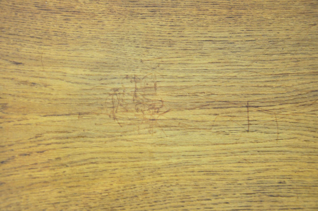 3개의 서랍이 있는 나무 책상. 서랍 하나 바닥에 찍혀 있습니다. 책상의 시간과 나이로 인한 마모.