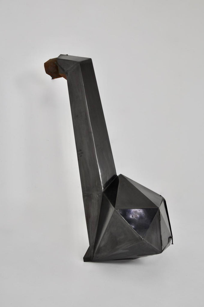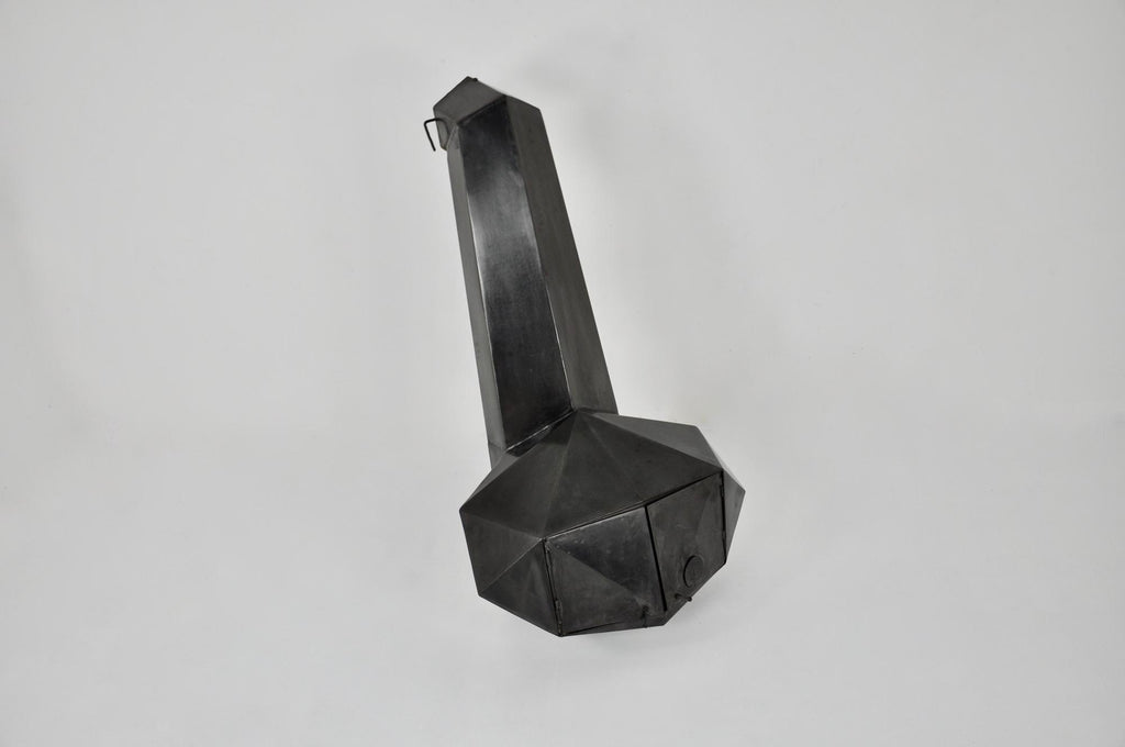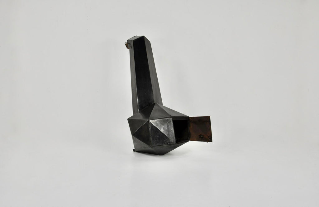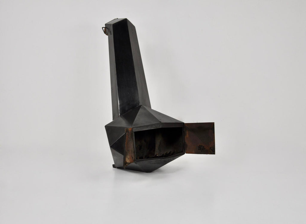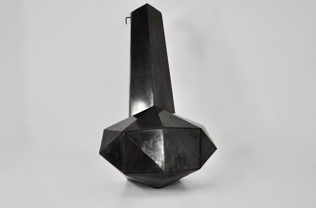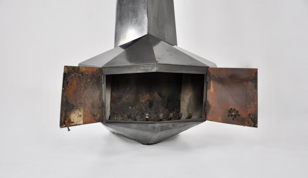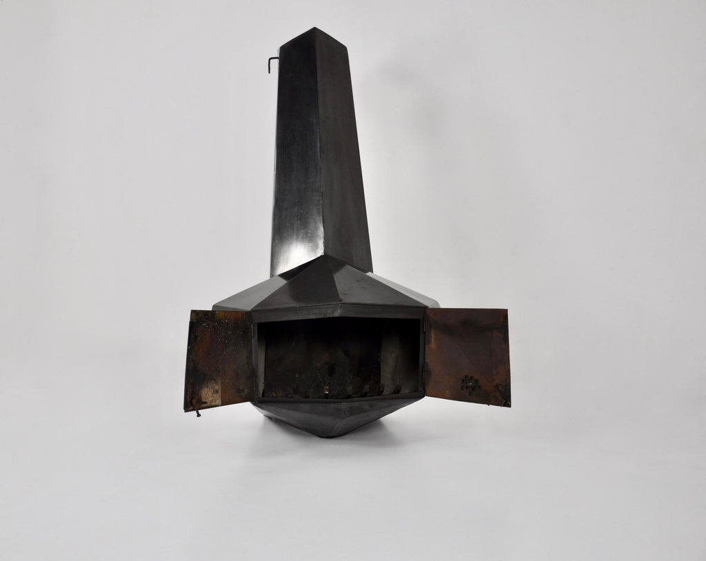 파티나 처리된 강철의 다이아몬드 모양 벽 벽난로. 시간과 나이로 인한 마모.