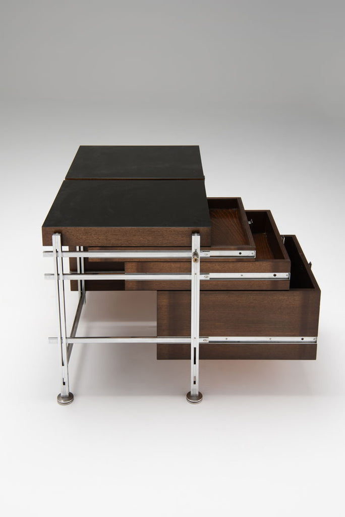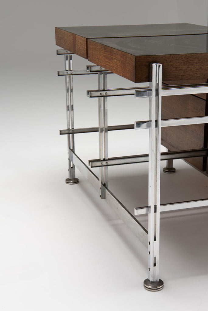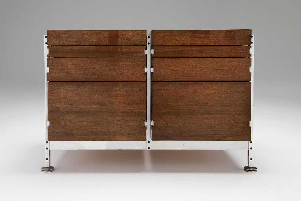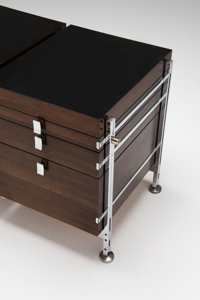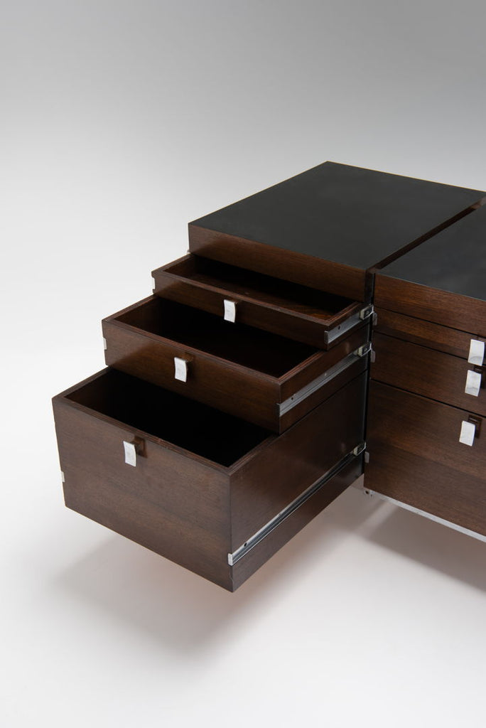 This rare double chest of drawers was designed in the 1960s by the Belgian designer and interior architect Jules Wabbes. It is manufactured by Mobilier Universel and is also known as the 'Double Caisson'. The console is made from mahogany with the top finished in black laminate, which is mounted on a stainless steel base. The design by Jules Wabbes is one of the most sought after. All his works are based on the expression of pure quality with excellent materials. He is especially famous for his office desks, tables, wall lamps, and casts.