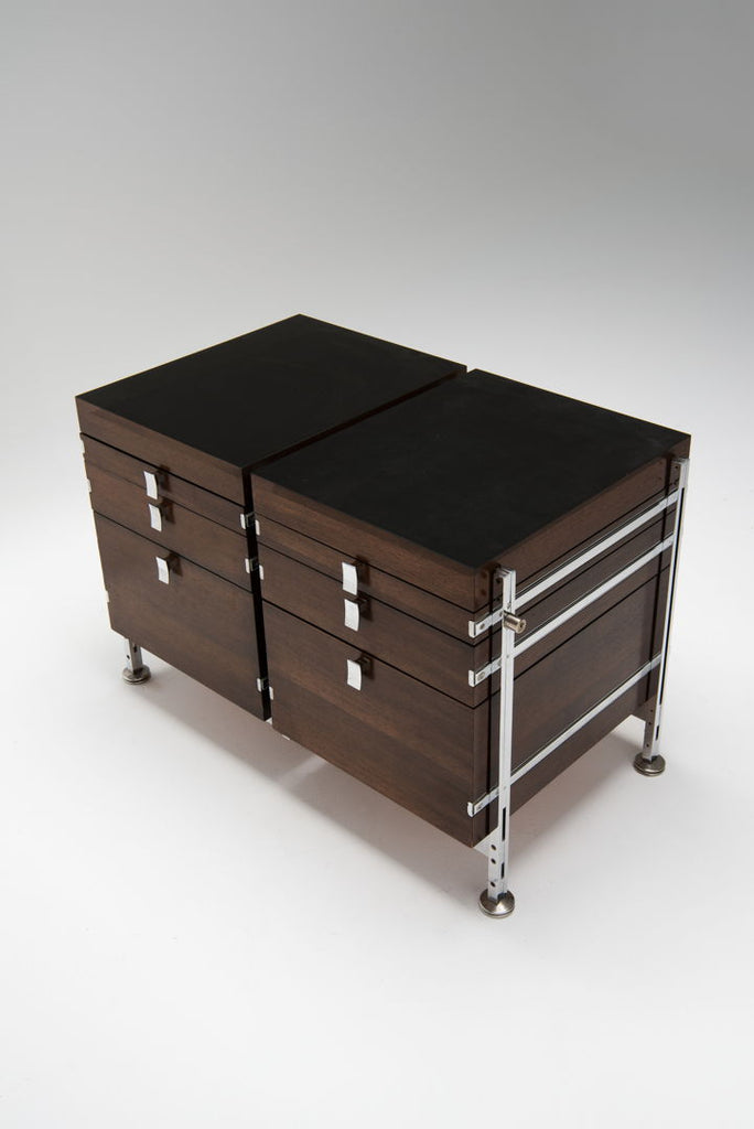 이 희귀한 이중 서랍장은 1960년대 벨기에 디자이너이자 인테리어 건축가인 Jules Wabbes가 디자인했습니다. 모빌리에 유니버셀(Mobilier Universel)에서 제작한 제품으로 '더블 케이슨(Double Caisson)'으로도 알려져 있습니다. 콘솔은 마호가니로 제작되었으며 상단은 검정색 라미네이트로 마감되었으며 스테인레스 스틸 베이스에 장착되었습니다. Jules Wabbes의 디자인은 가장 인기 있는 디자인 중 하나입니다. 그의 모든 작품은 우수한 재료를 사용한 순수한 품질의 표현을 기반으로 합니다. 그는 특히 사무실 책상, 테이블, 벽 램프, 캐스트로 유명합니다. 전체적으로 따뜻한 파틴으로 작품의 상태가 매우 좋습니다. 일부 복원 작업이 수행되었습니다. 참고: 원래 키가 누락되었습니다!
