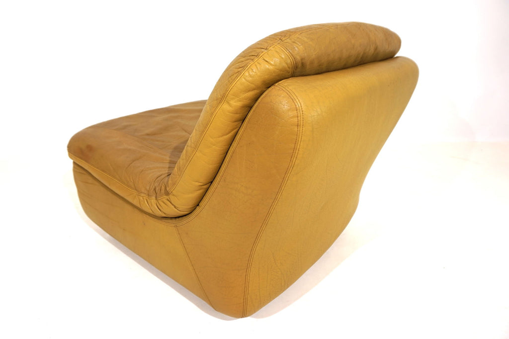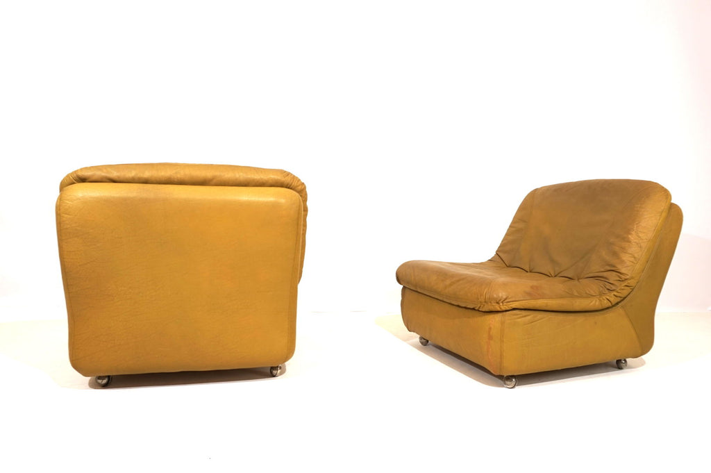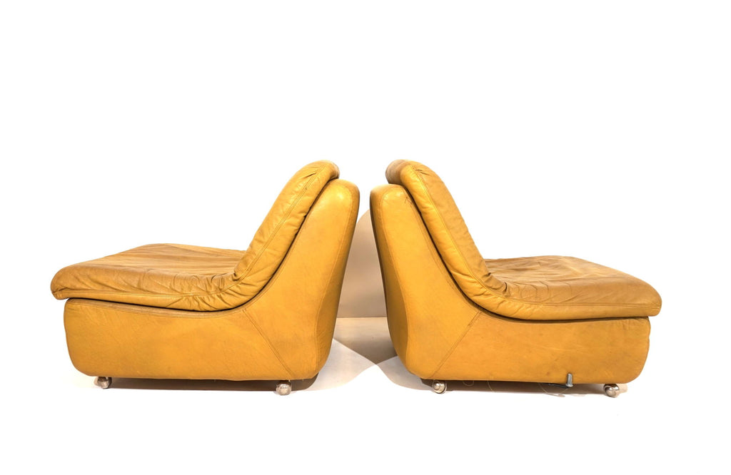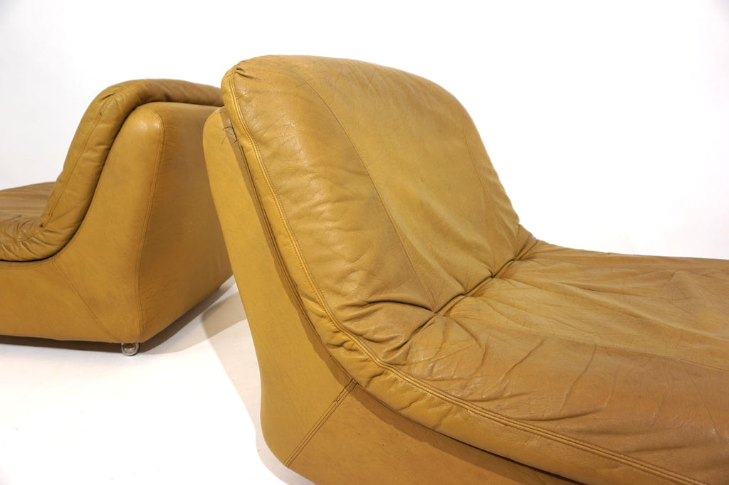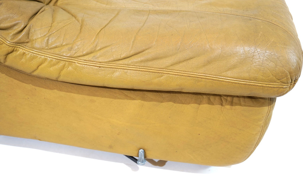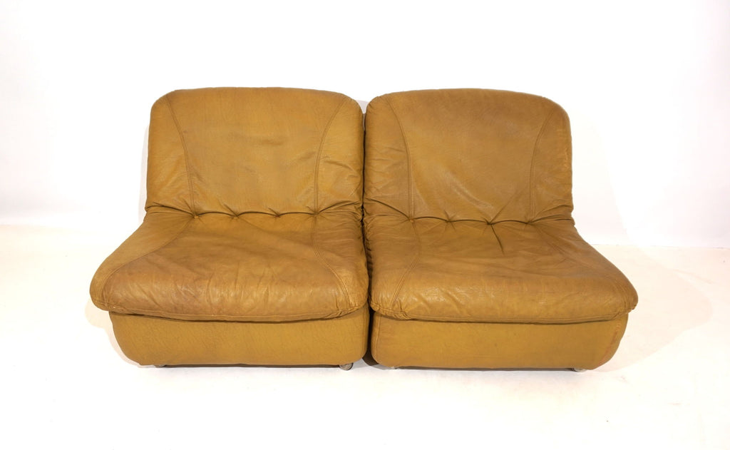 The set of two Dreipunkt modular armchairs, made in a mustard-colored leather tone from the 70s. The armchair is in good condition with slight signs of wear and clear patina which has been earned over the years. The seating comfort is impeccable. The modules can be placed as individual armchairs or connected together to form a two-seater sofa. There is a connecting hook that holds the chairs together.
