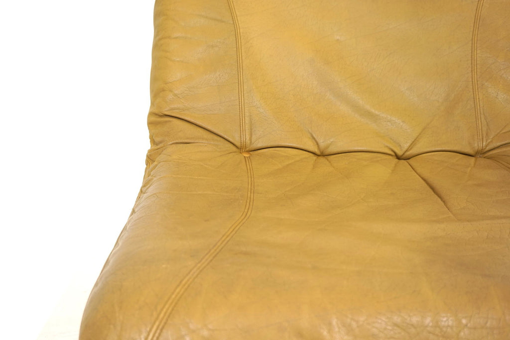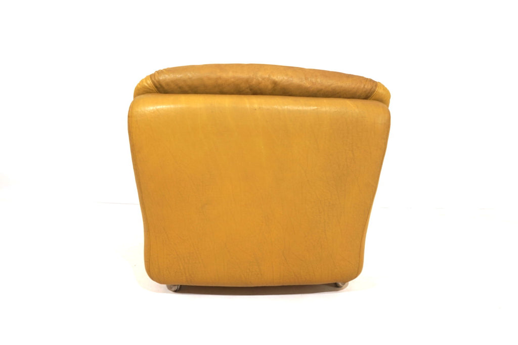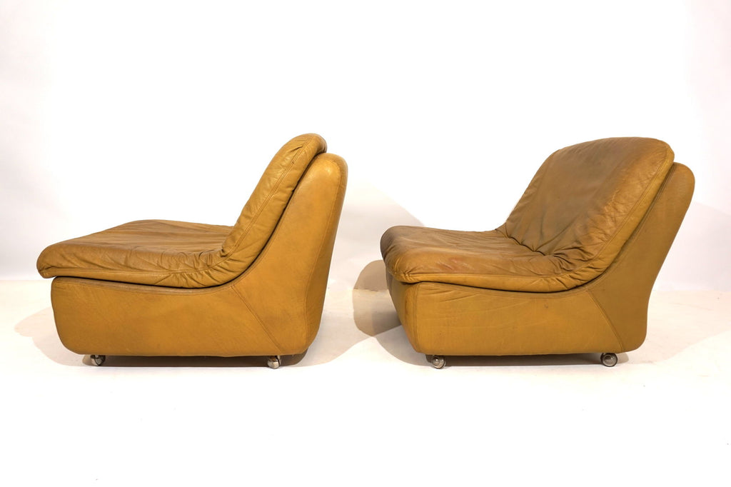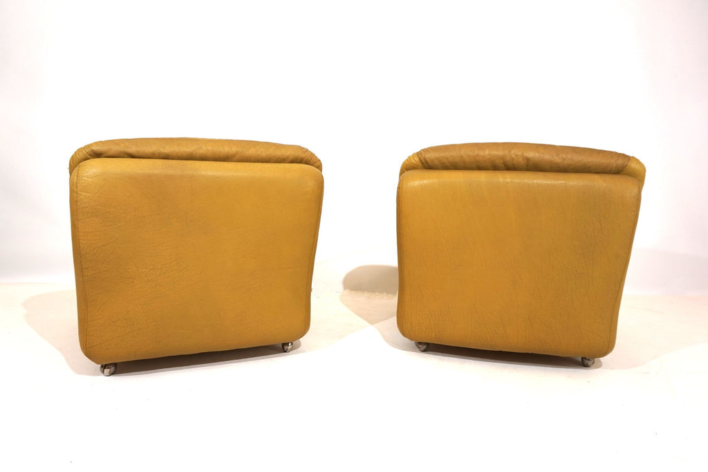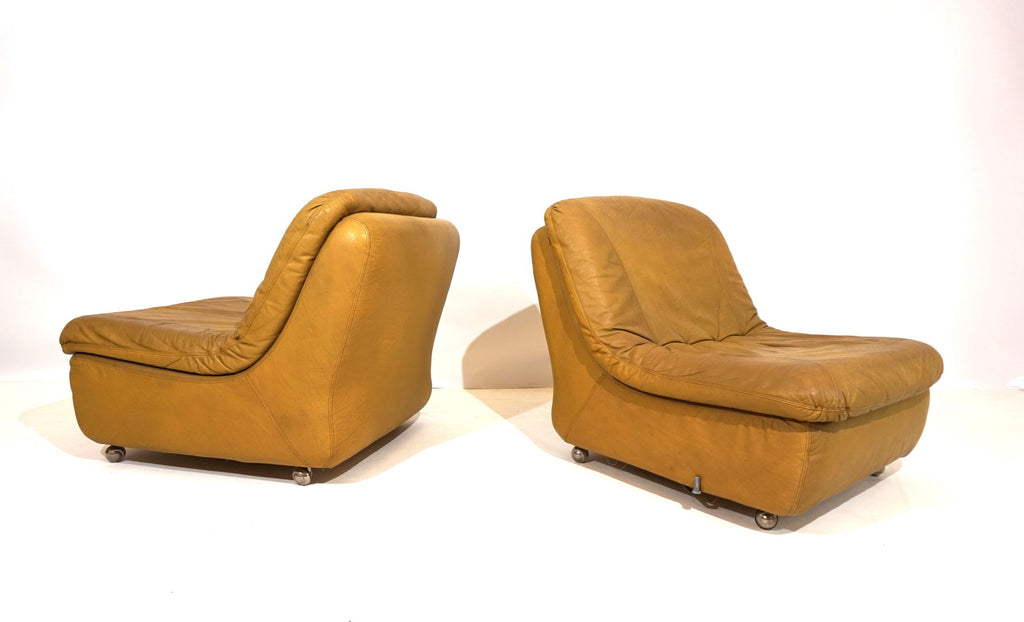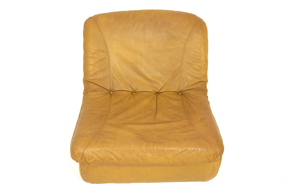 The set of two Dreipunkt modular armchairs, made in a mustard-colored leather tone from the 70s. The armchair is in good condition with slight signs of wear and clear patina which has been earned over the years. The seating comfort is impeccable. The modules can be placed as individual armchairs or connected together to form a two-seater sofa. There is a connecting hook that holds the chairs together.