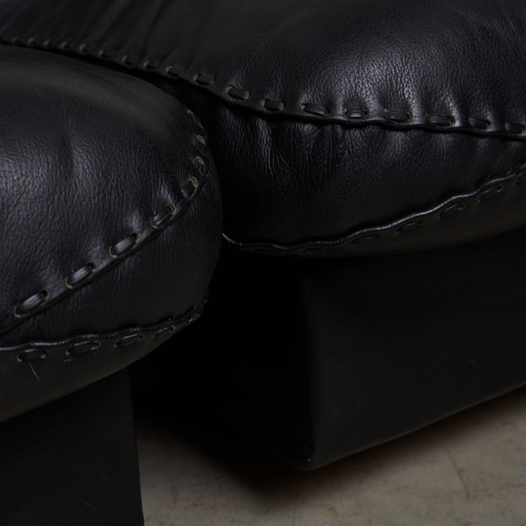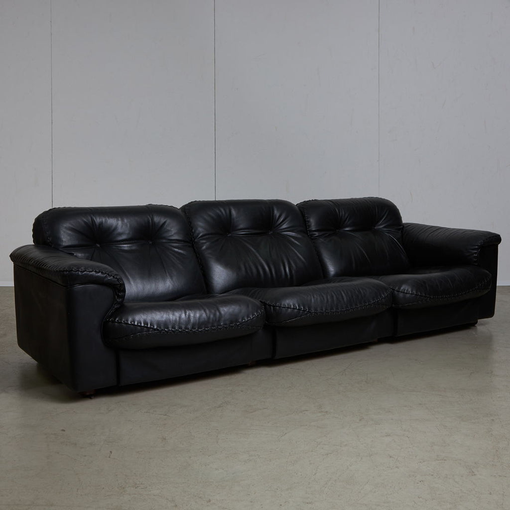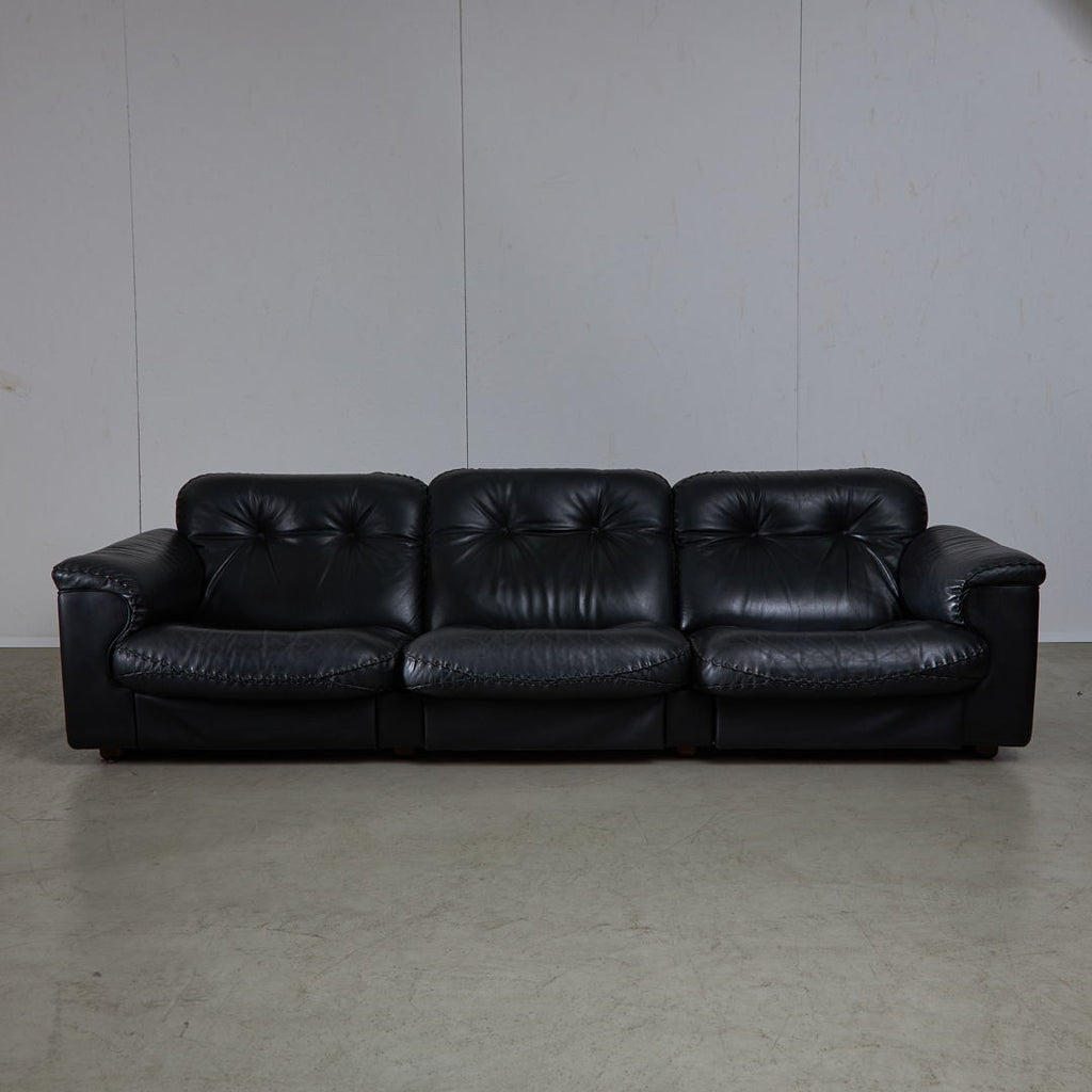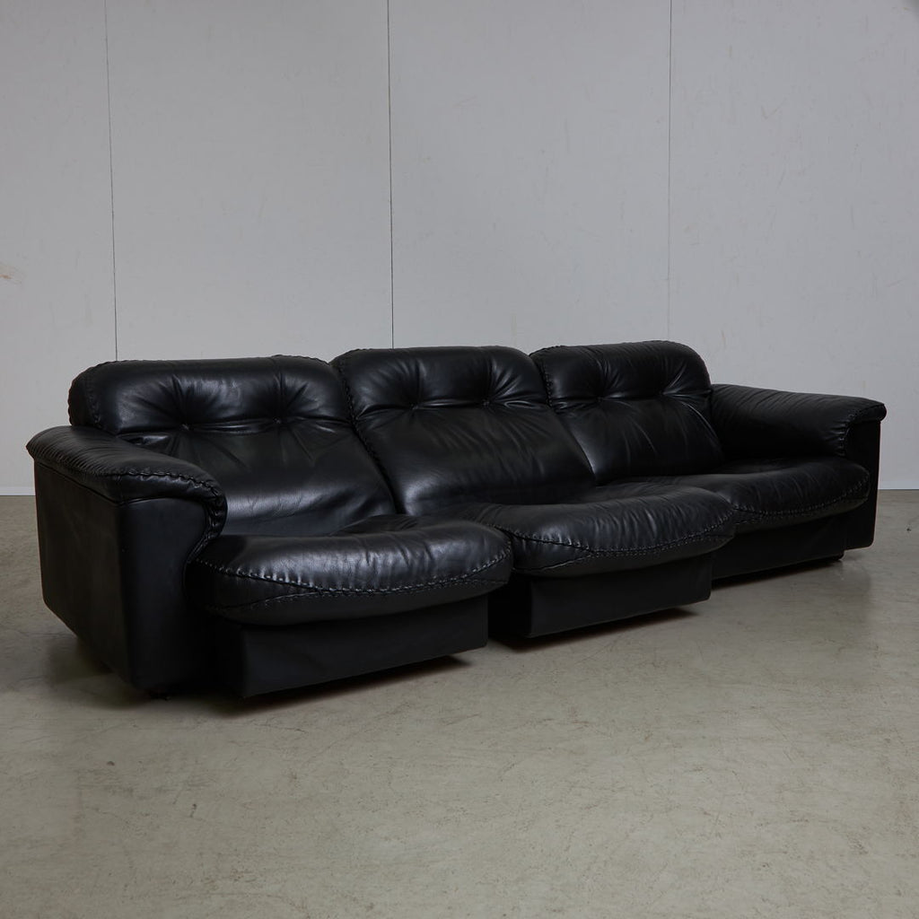 "High quality comfort 3 seater, with extendable individual seats for lounge sitting. The hand-stitched seams and black leather upholstery make the DS101 model truly unique. Designed for De Sede in the 1970s. This item shows minor signs of wear consistent with age and use. Under the middle seat, hidden by the cushions, there is a tear on the textile that does not interfere with the comfortability of the sofa. See photos for details."