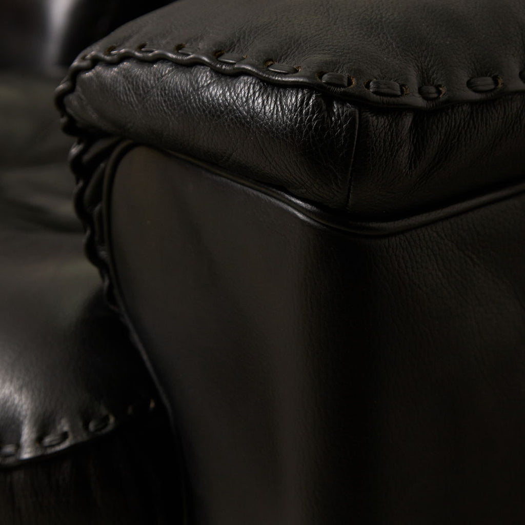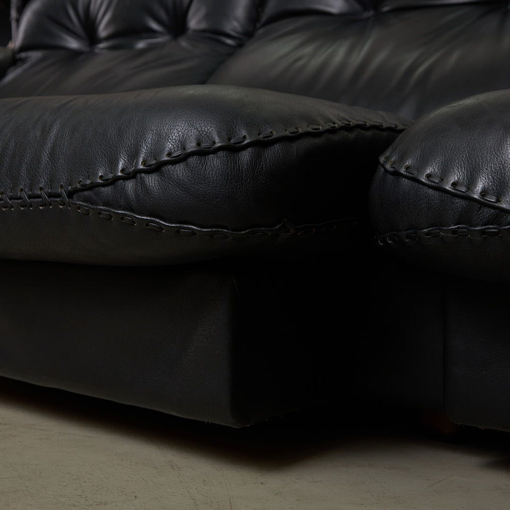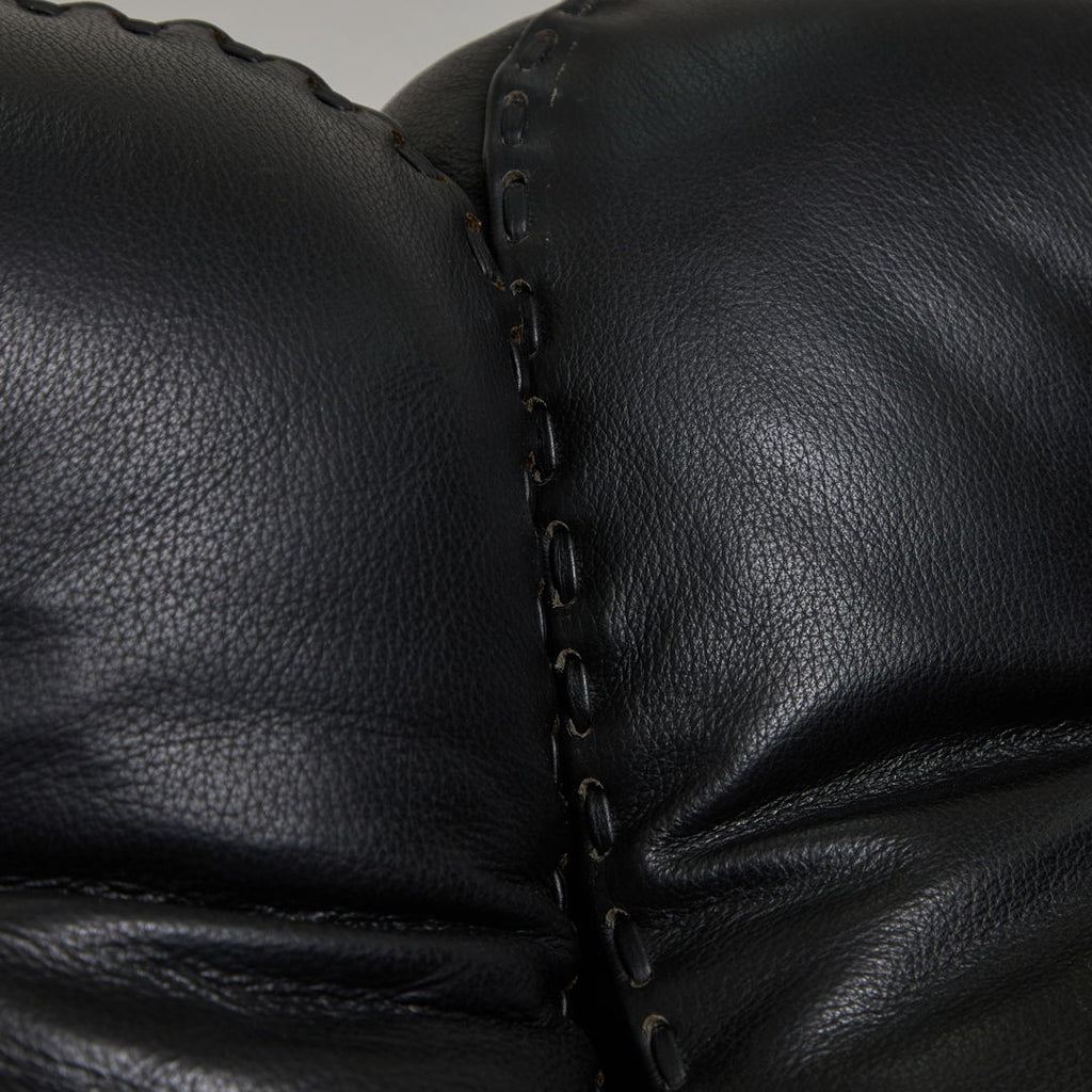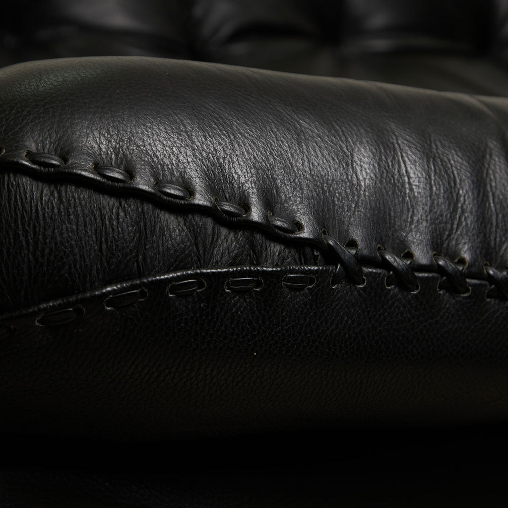 "High quality comfort 3 seater, with extendable individual seats for lounge sitting. The hand-stitched seams and black leather upholstery make the DS101 model truly unique. Designed for De Sede in the 1970s. This item shows minor signs of wear consistent with age and use. Under the middle seat, hidden by the cushions, there is a tear on the textile that does not interfere with the comfortability of the sofa. See photos for details."