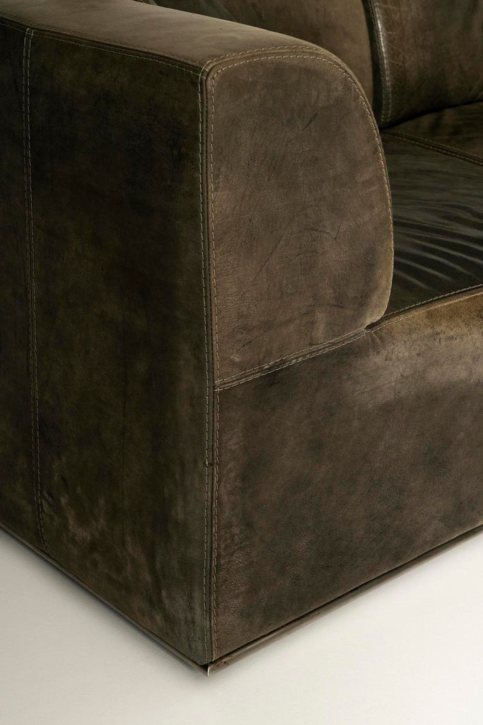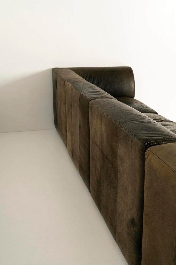 1980년대 Durlet의 빈티지 모듈식 가죽 소파. 벨기에 회사 Durlet에서 만든 가구는 뛰어난 품질로 유명합니다. 두 개의 모서리 부분과 두 개의 직선 부분이 네 가지 구성 요소를 구성하며 모두 놀라운 녹청이 있는 녹색 가죽으로 덮여 있습니다. 요소는 상호 교환 가능하기 때문에 원하는 대로 구성할 수 있습니다. 소파는 상태가 양호하고 세월에 따른 정상적인 사용감이 있지만 가죽은 깨지지 않았습니다. 요청 시 소파의 휴식 공간에 추가 폼을 채울 수 있습니다. 각 요소는 너비 93cm x 깊이 93cm x 높이 75cm입니다.