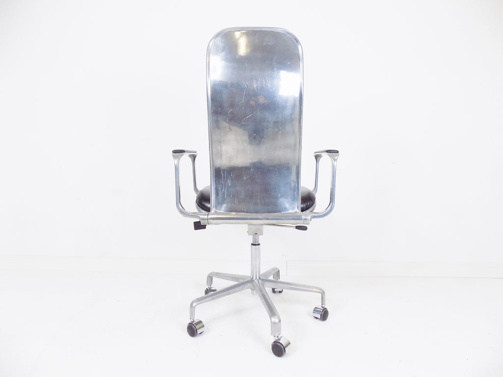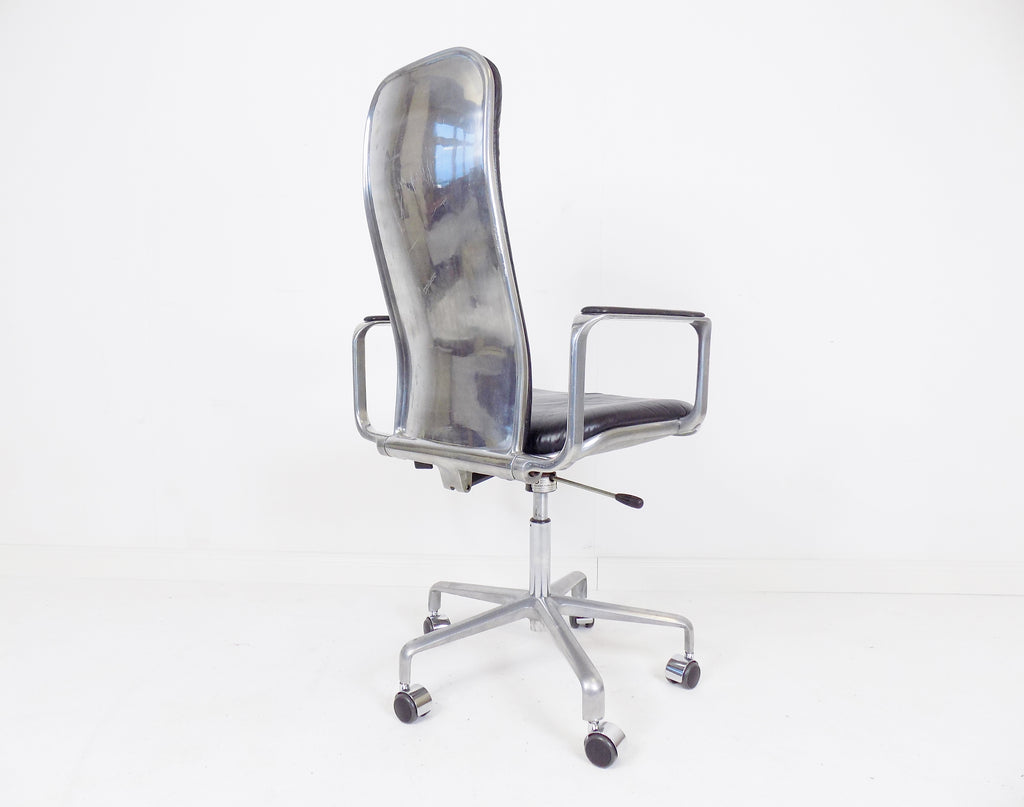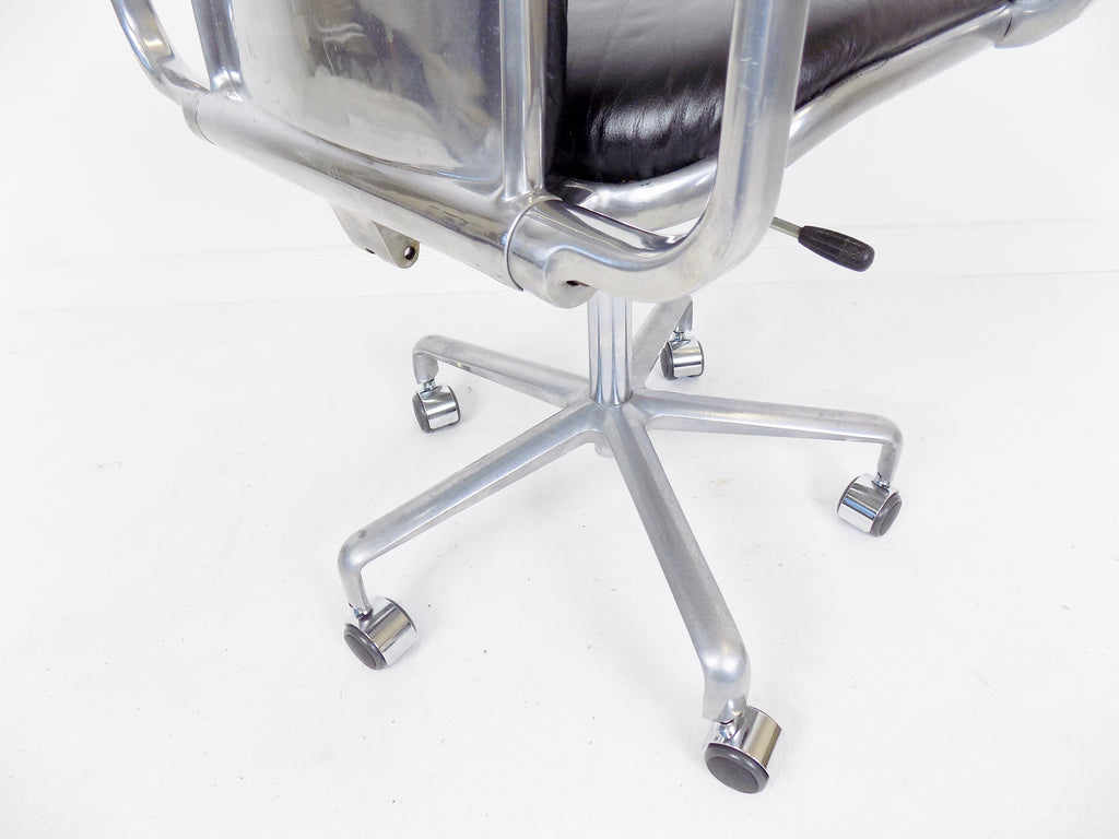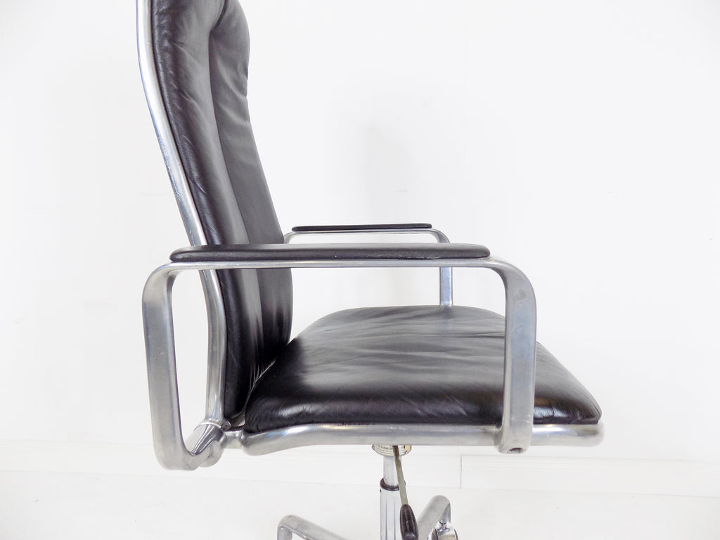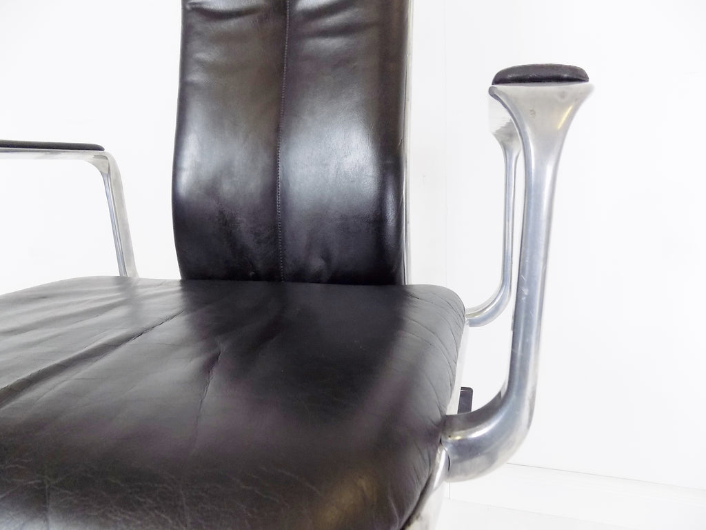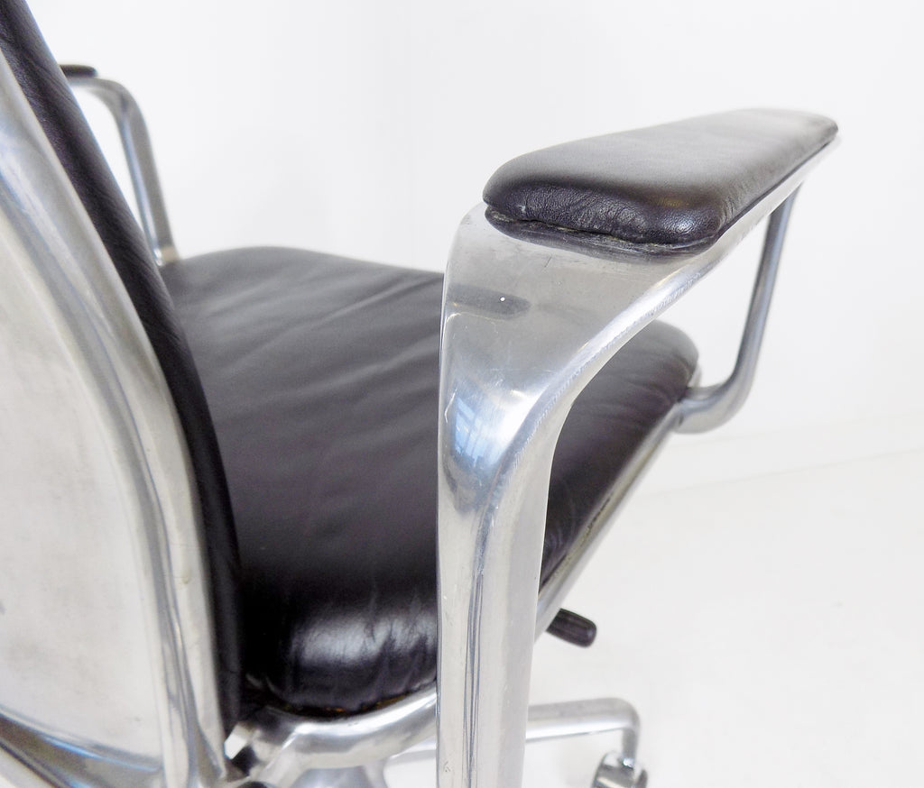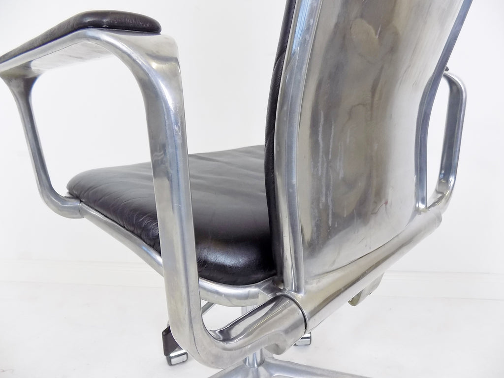 등받이와 좌석의 검은색 가죽 쿠션은 흠잡을 데가 없으며, 등받이의 유광 알루미늄 표면과 팔걸이의 가죽 패드는 약간의 사용 흔적이 있습니다.