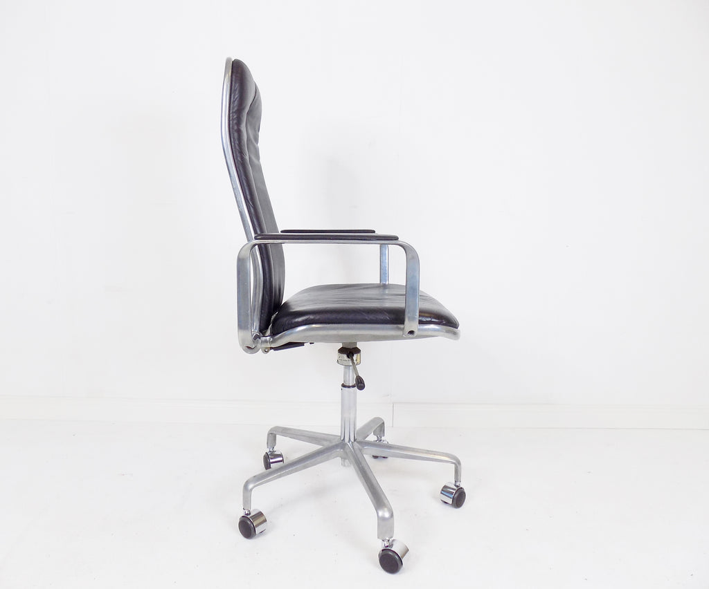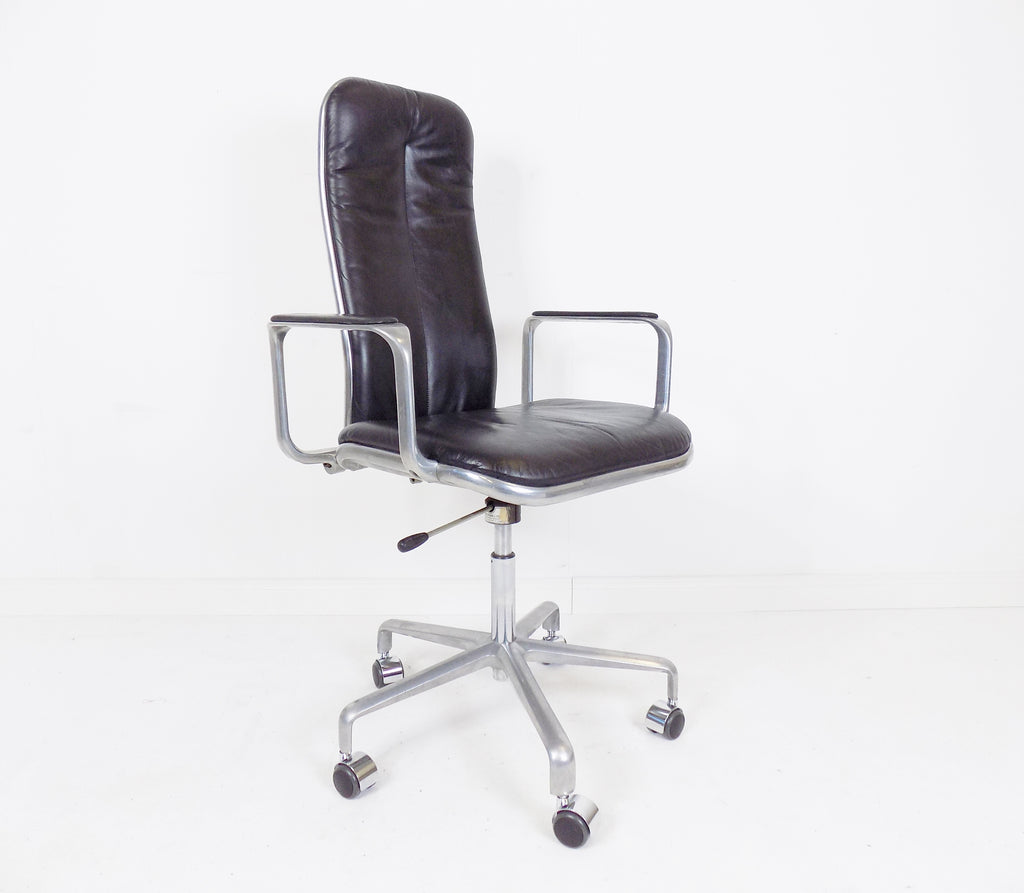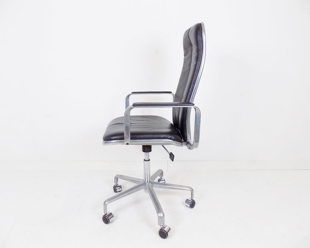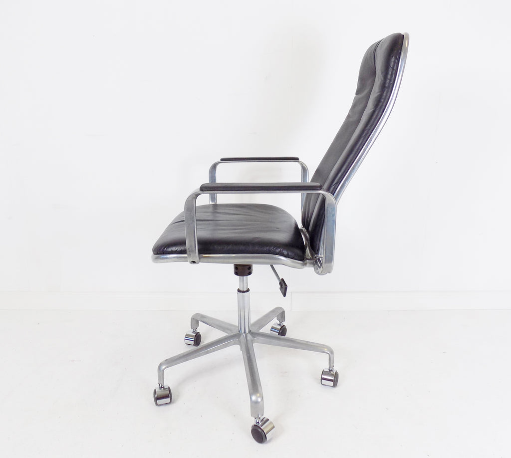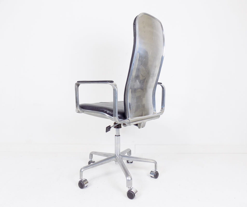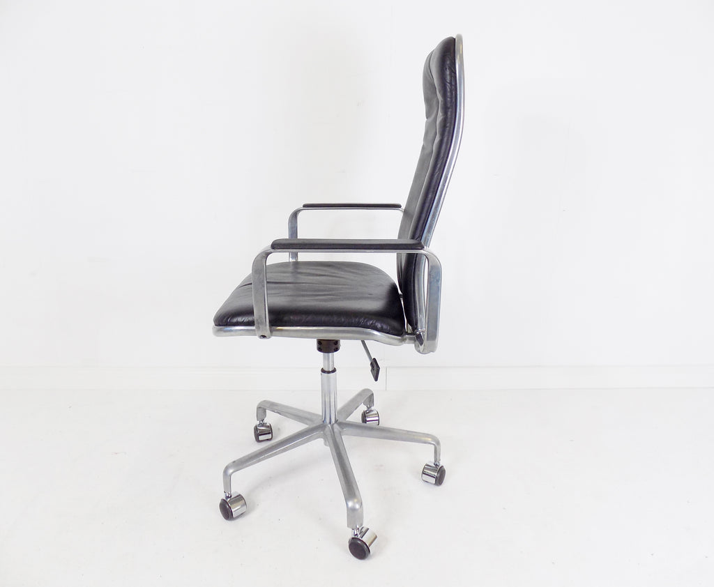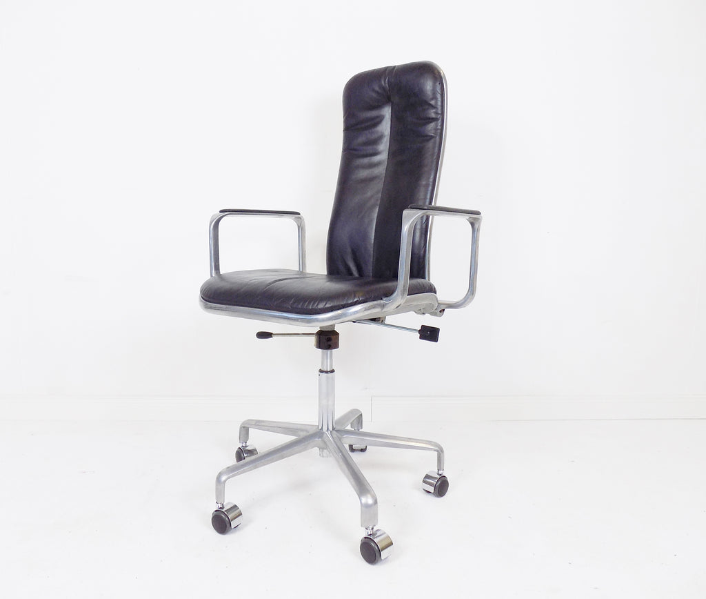 등받이와 좌석의 검은색 가죽 쿠션은 흠잡을 데가 없으며, 등받이의 유광 알루미늄 표면과 팔걸이의 가죽 패드는 약간의 사용 흔적이 있습니다.