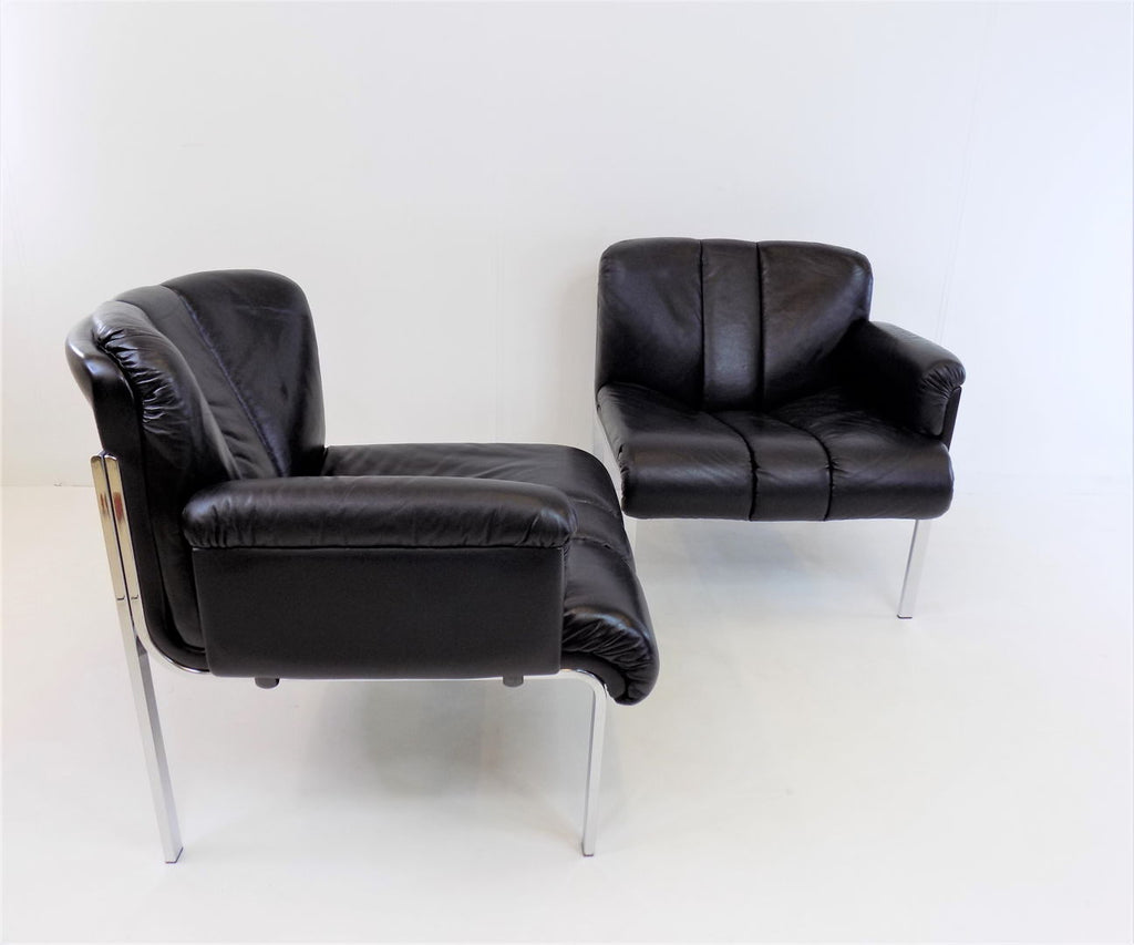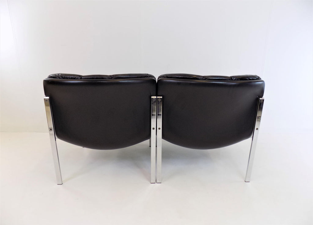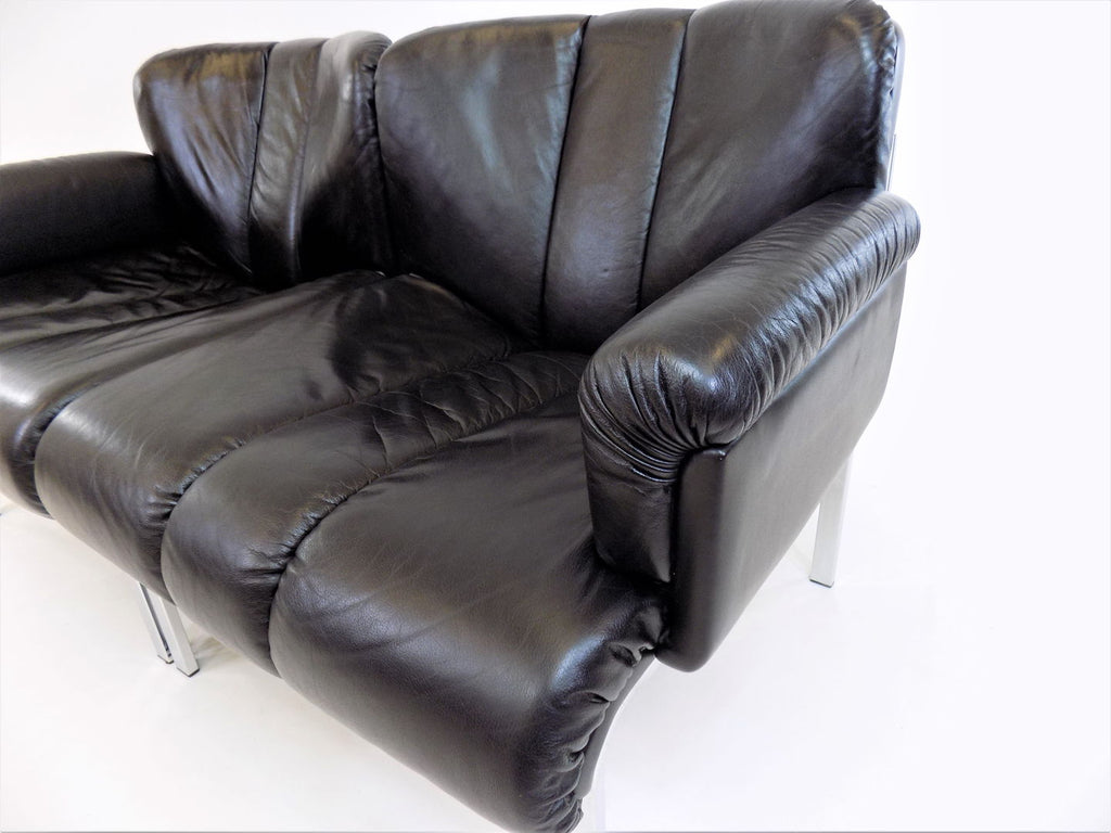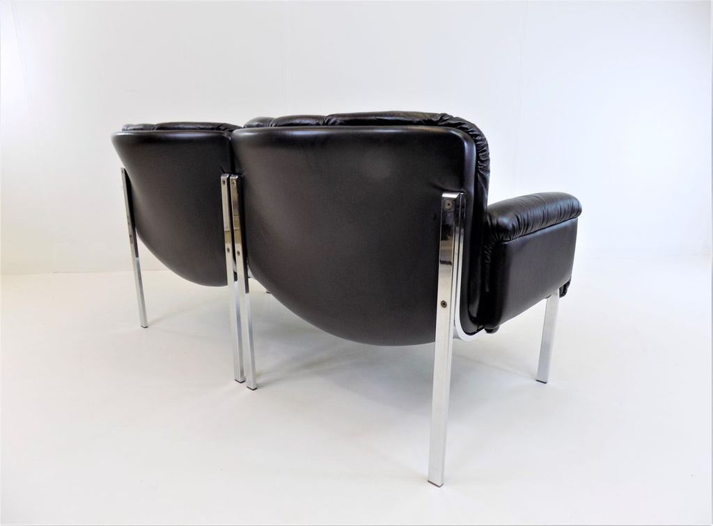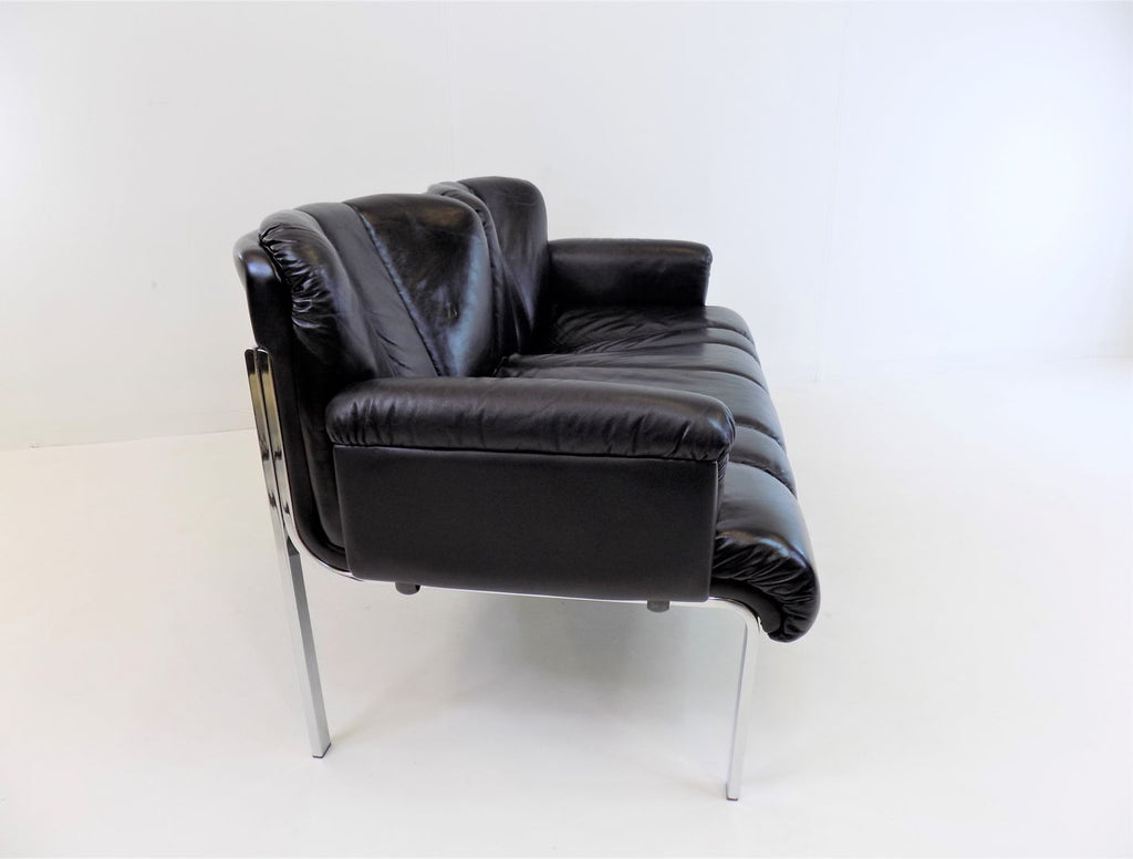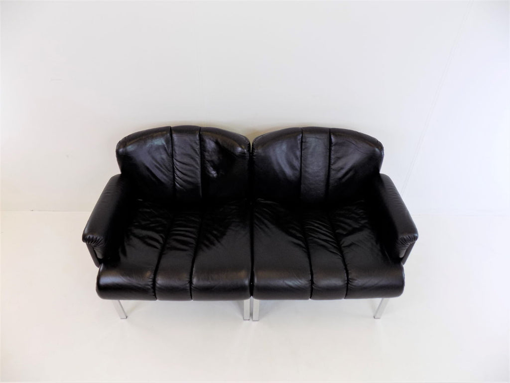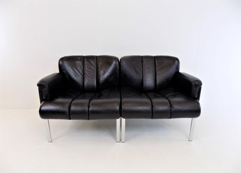 Girsberger Eurochair 2-seater sofa in black leather is in almost new condition. The leather is soft and shows hardly any signs of wear. The chrome frame of the sofa has its full shine and shows no damage. The Eurochair model can be extended due to its modular design and was designed by Girsberger in the 70s and produced until the 80s.