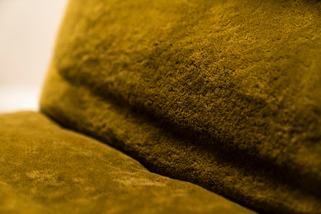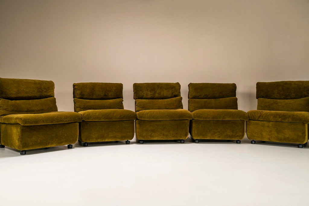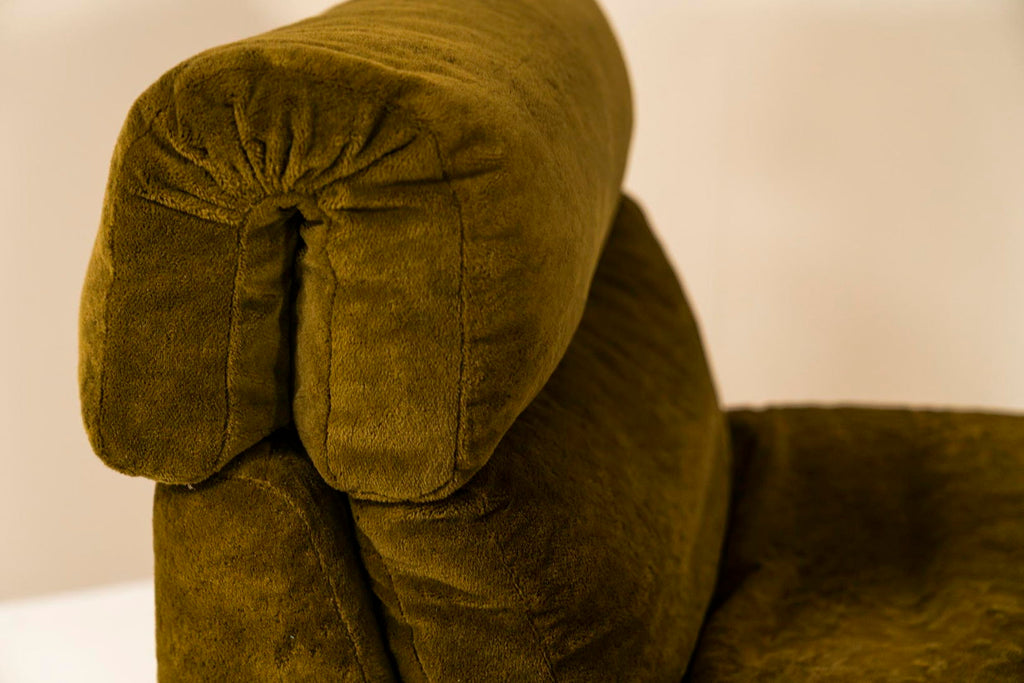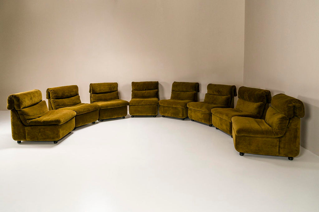 Green modular sofa consisting of 8 elements. This modular sofa set consists of eight elements that can of course be combined in many different ways. Possibilities abound, whether you want to create a seating area or a more playful variant by placing the elements in an arc for example. The spacious seats are quite lightweight and have an excellent seating comfort. Perfect for lowering yourself into them and relax. Their plastic legs are adjustable in height by simply turning them. Cushions and headrests are also separate parts and can also be exchanged should the need arise. The moss-green velour-like fabric has not suffered much damage over the years. At all, this beautiful large set has suffered very little and is ready to adorn your interior.