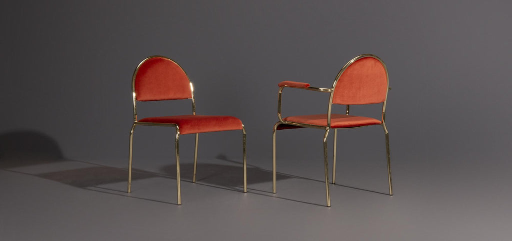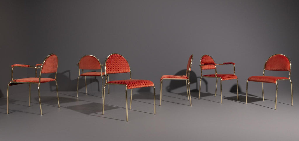 이 Hollywood Regency 의자는 팔걸이가 있거나 없는 상태로 제공됩니다. 좁은 금색 프레임이 할리우드 리젠시 스타일의 특징입니다.