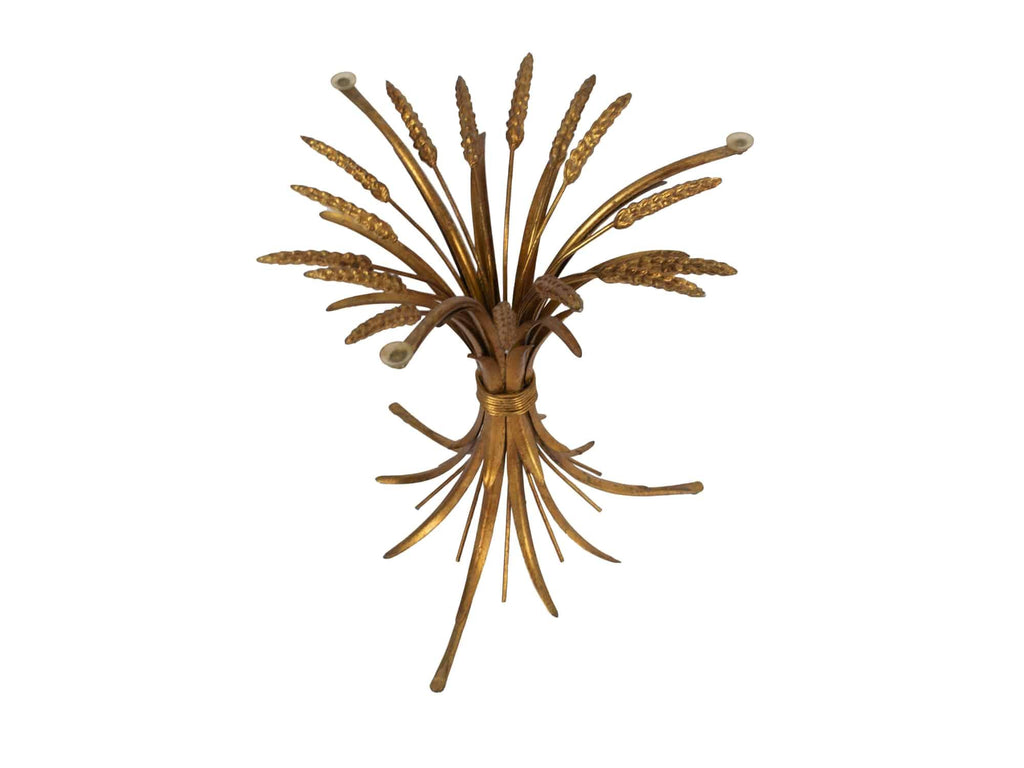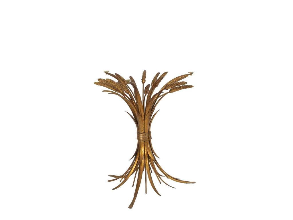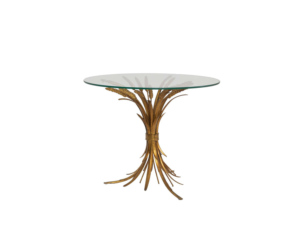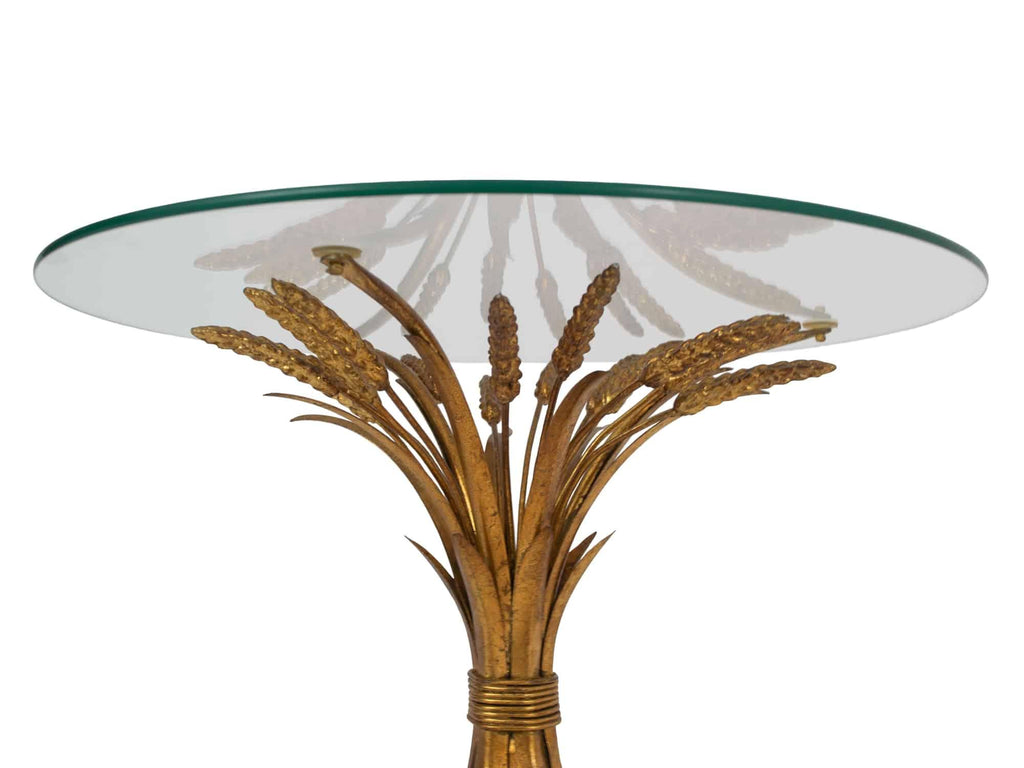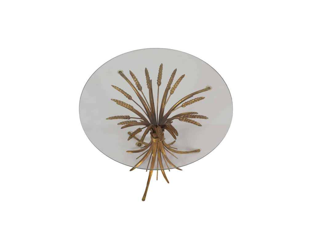Nice Hollywood Regency, 'Sheaf of Wheat', 1950년대 경의 커피 테이블. 탁자는 밀 다발 모양의 금색으로 화려하게 장식되어 있습니다. 3개의 요소 위에 둥근 유리 상단이 놓입니다.